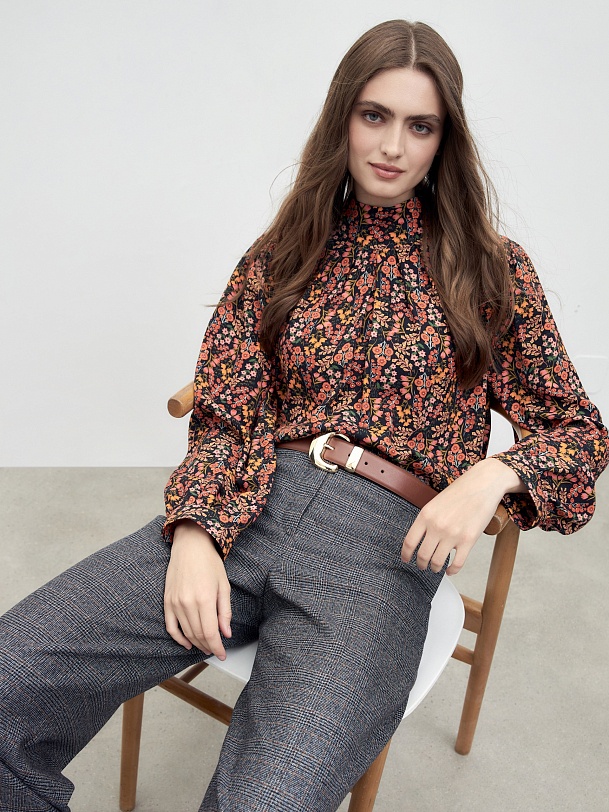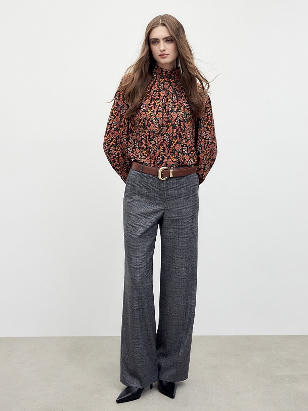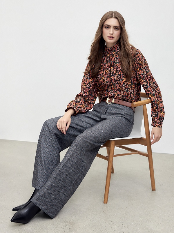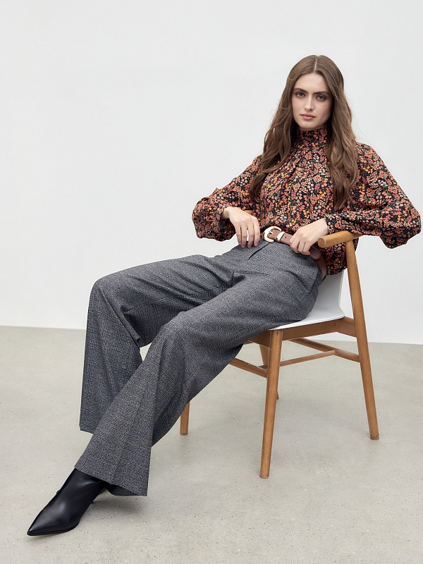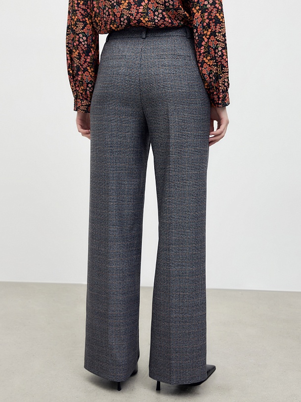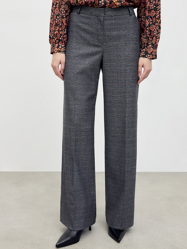 Классические прямые брюки средней посадки, со стрелками на притачном поясе с шлевками. Имеют два функциональных кармана по бокам и два прорезных кармана сзади. Брюки идеально сочетаются с жилетом из одного одной ткани в клетку.