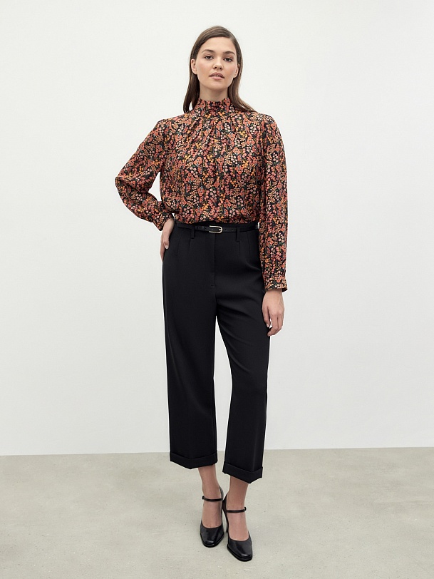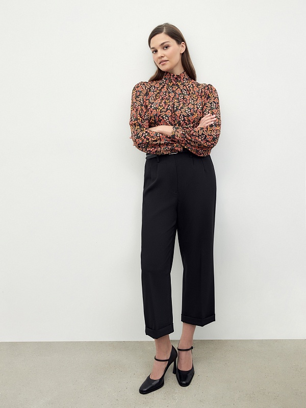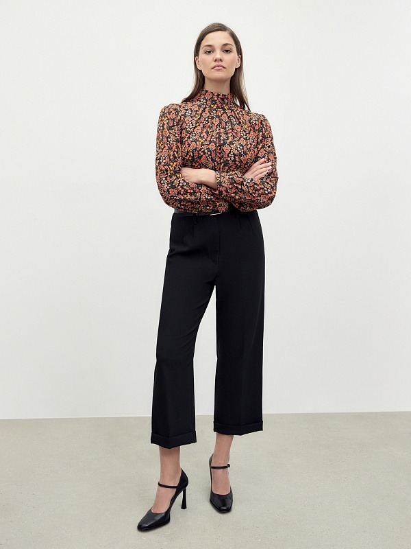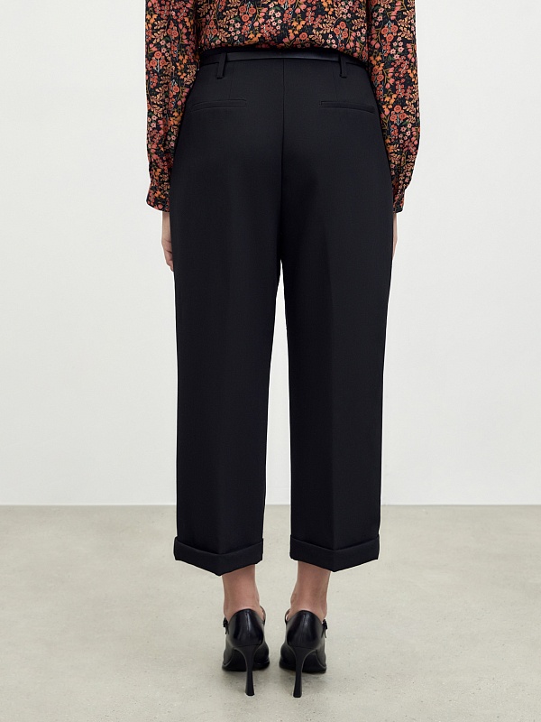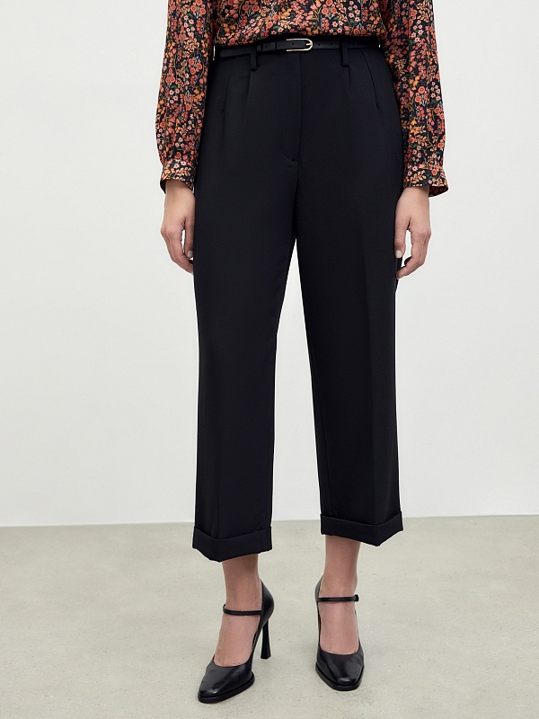 Широкие брюки из костюмной ткани на кокетке, вытачки и складка по переду. На поясе шлевки для тонкого ремня из экокожи. Имеют два функциональных кармана в боковых швах и два прорезных кармана сзади. По низу брюк отвороты.