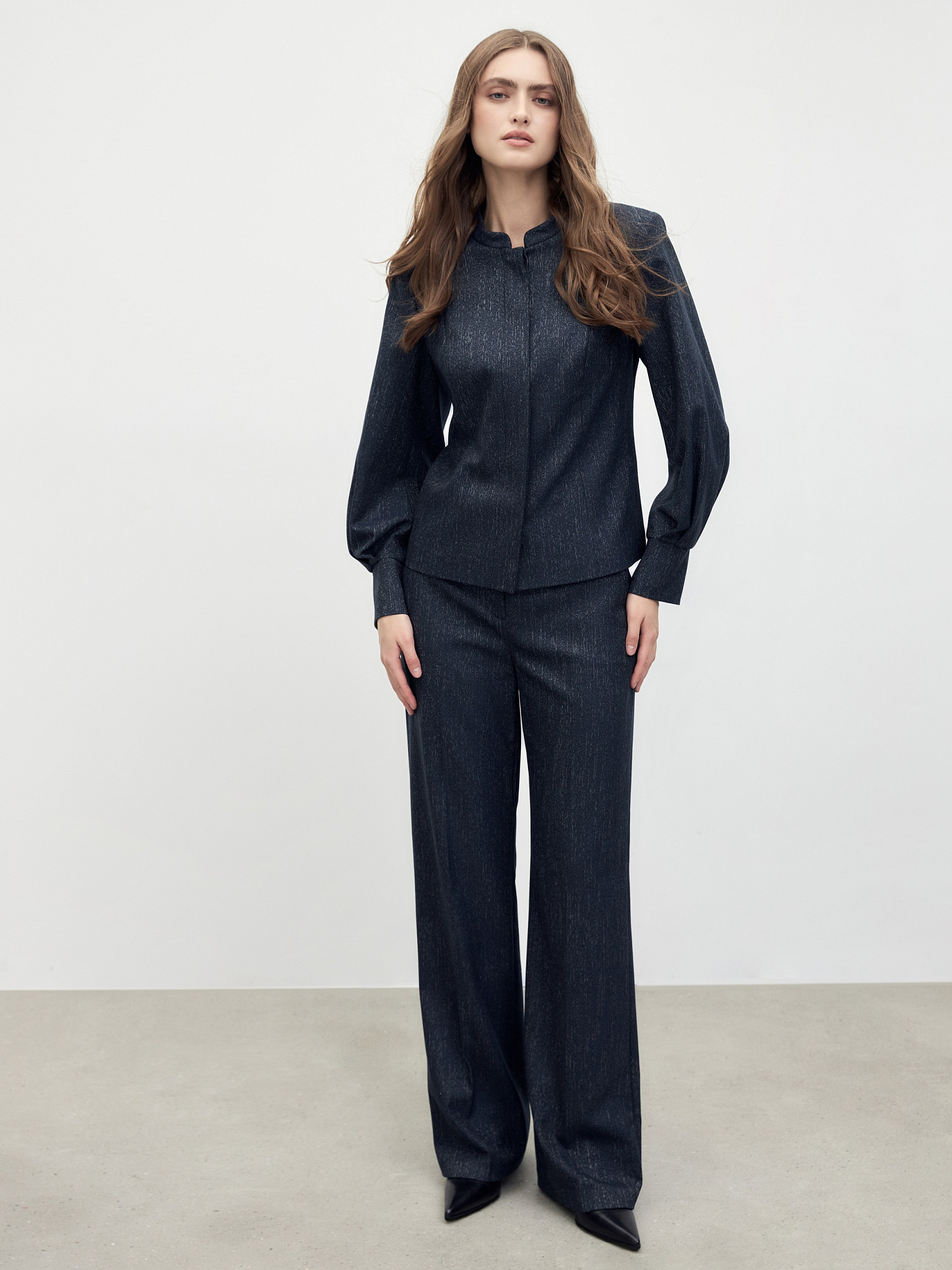 Приталенный жакет с потайной планкой и воротником-стойкой. Втачной рукав, со складками у менжета. Полуприталенный крой жакета создают силуэт «песочные часы», следуя актуальному тренду на сочетание расслабленности и женственности в одном образе, отлично сочетается с широкими расслабленными брюками из этой же ткани.