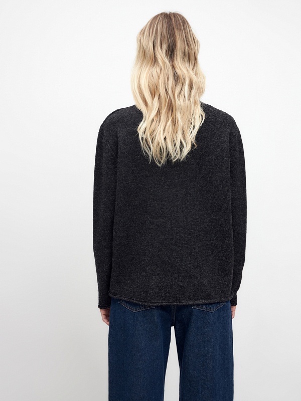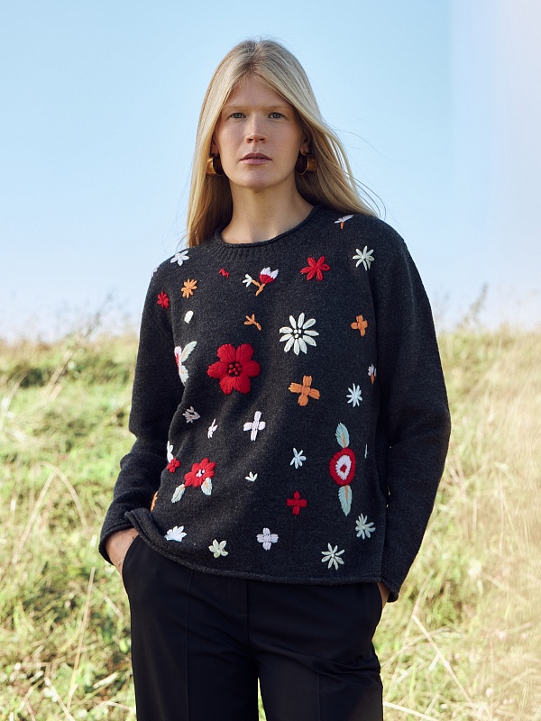 Вязаный джемпер с круглой горловиной, втачным рукавом и ручной цветочной вышивкой по полочке. В составе пряжи есть ангорская шерсть, получаемая из пуха ангорских коз. Она обладает шелковистостью и мягкостью, которые добавляют дополнительного уюта и комфорта изделию в эксплуатации.