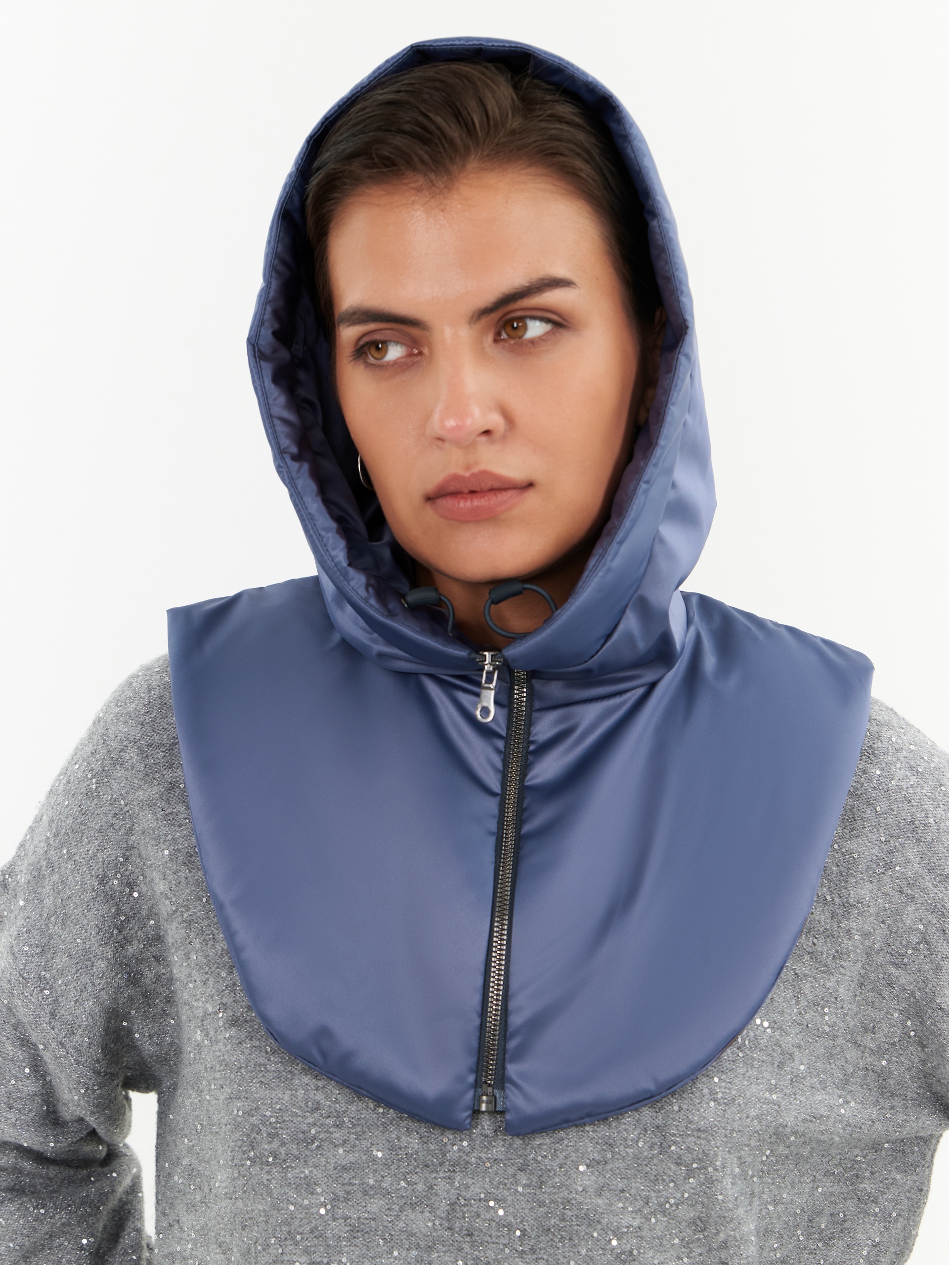 Съемный утеплённый зимний капюшон универсального синего цвета из плащевой ткани с водоотталкивающим покрытием. Капюшон имеет манишку и застёжку на молнию. Внутри изделия располагаются два мягких фиксатора для регулирования объема. Такой капюшон послужит прекрасным дополнением к любому образу с пальто из нашей коллекции и надёжно защитит от непогоды. Произведено в Санкт-Петербурге.