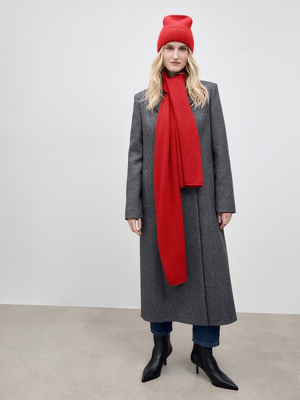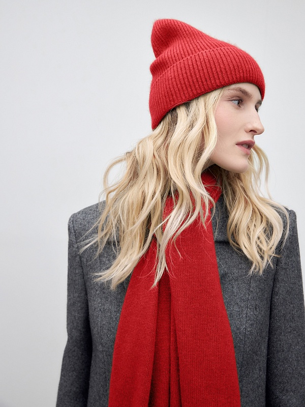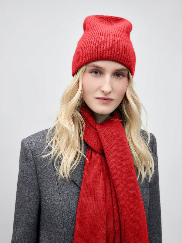 Шапка фактурной вязки из теплой и мягкой пряжи с содержанием пуха ангорского кролика. Шапка имеет модную форму "бини" и отворот для дополнительного тепла. Изделие подойдет на любой размер. Шапка яркого красного оттенка легко разнообразит любой образ с пальто из нашей коллекции и станет незаменимой базовой вещью в вашем гардеробе.