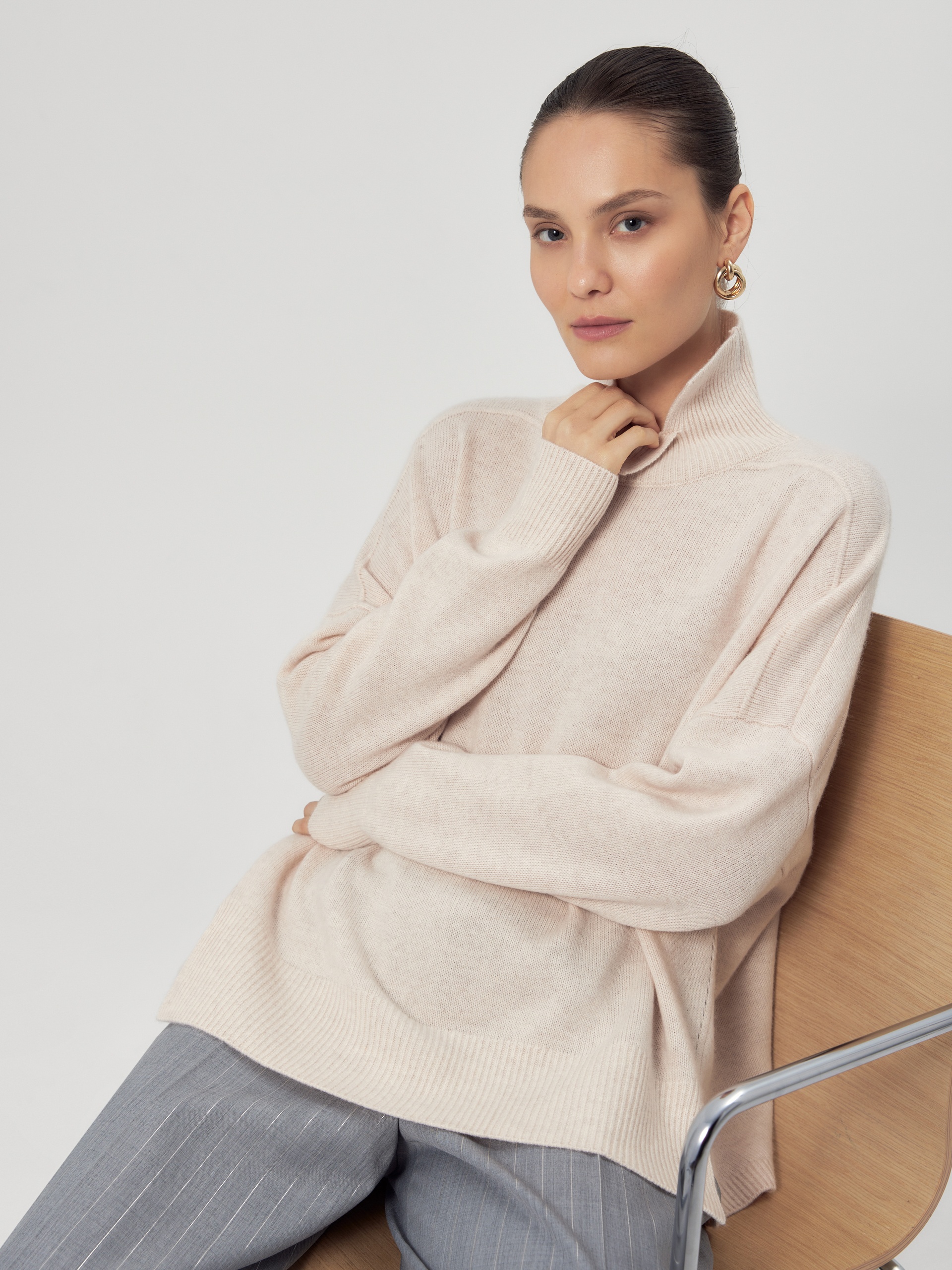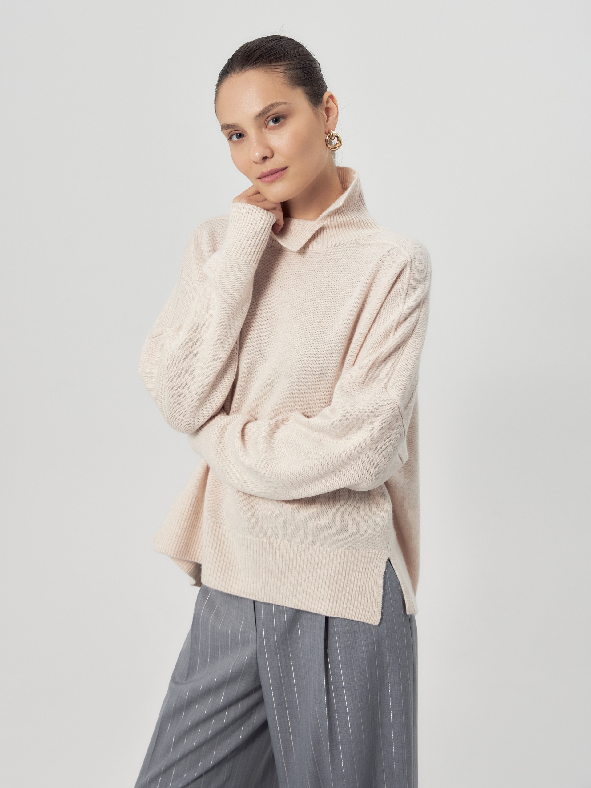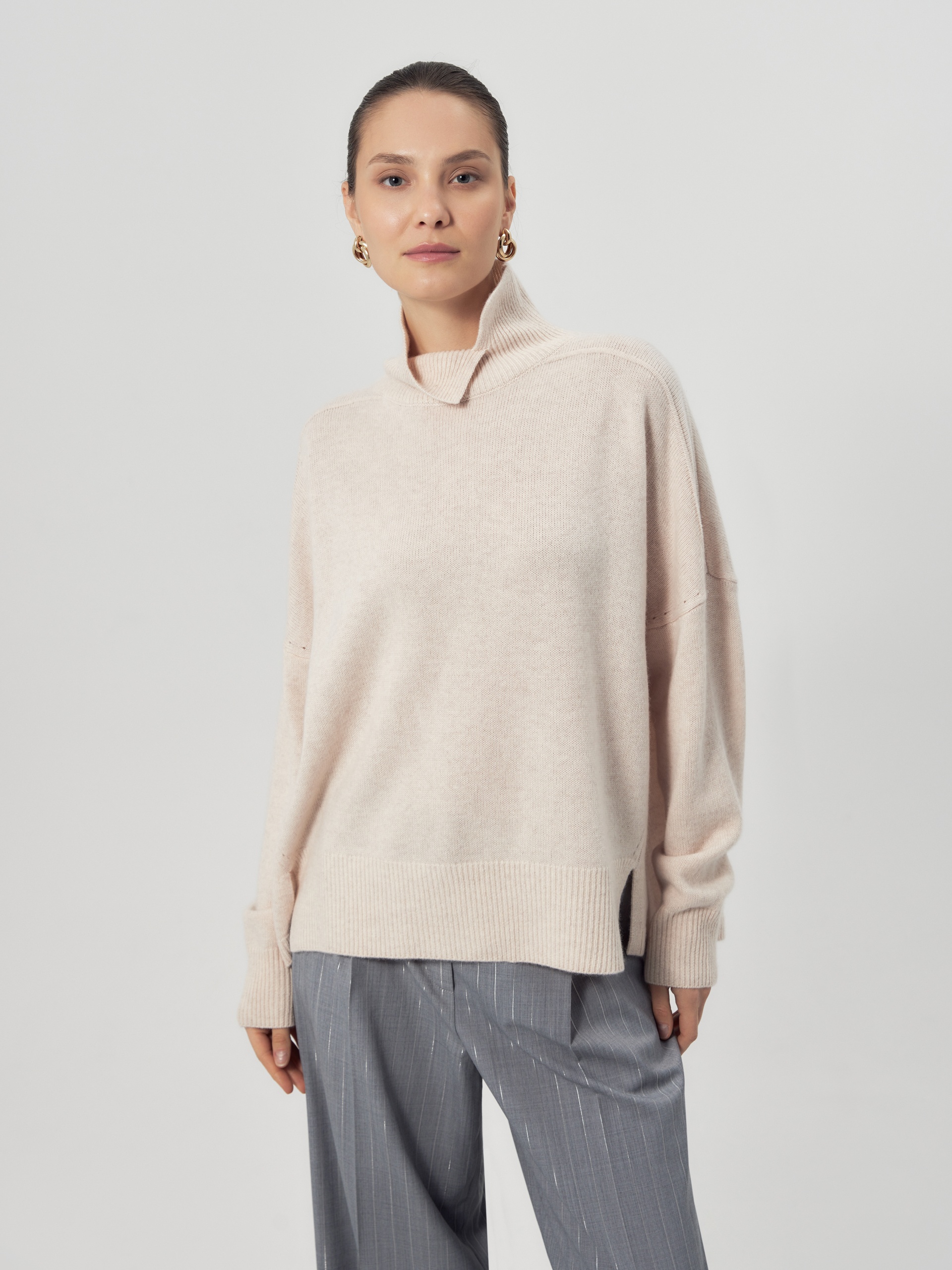 Объемный свитер прямого силуэта из лимитированной линейки POMPA Premium, выполнен из 100% нежнейшего кашемира. Свитер связан гладью, воротник-стойка с разрезом и фигурные рельефы на спинке и полочке придают изделию оригинальный вид. Благодаря объемному крою свитер идеально садится по фигуре и станет незаменимым элементом гардероба, позволяя создавать стильные и уютные образы на каждый день