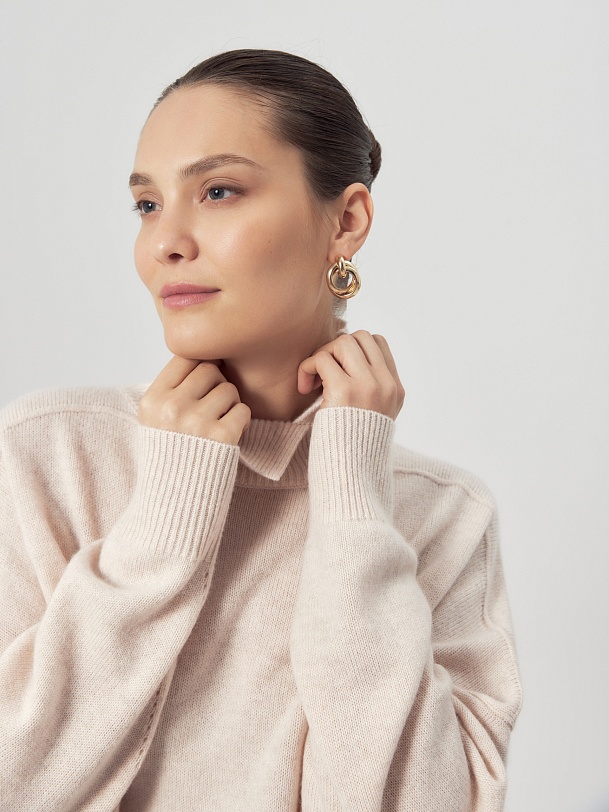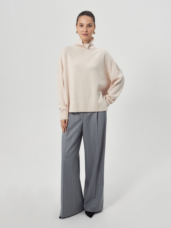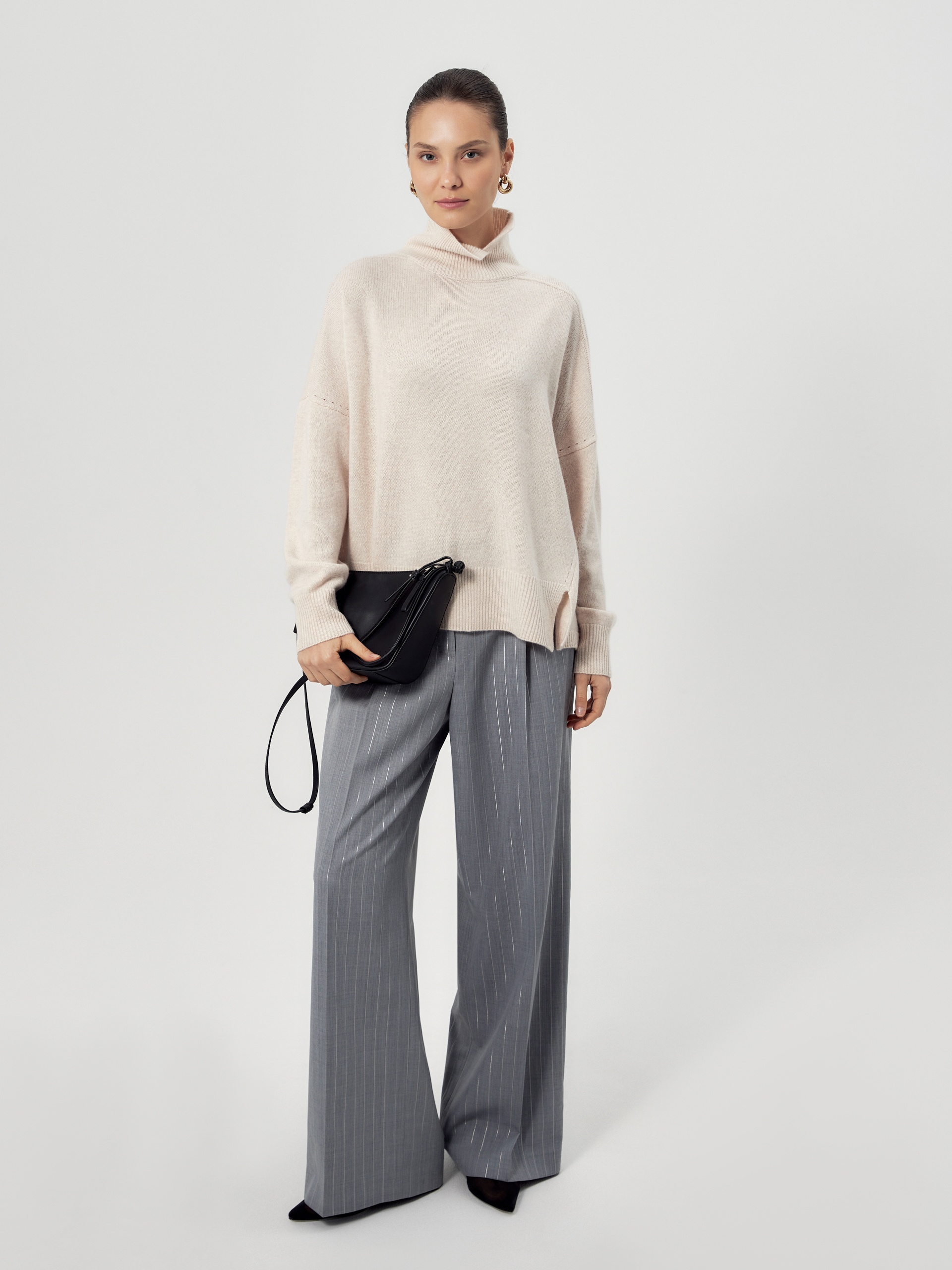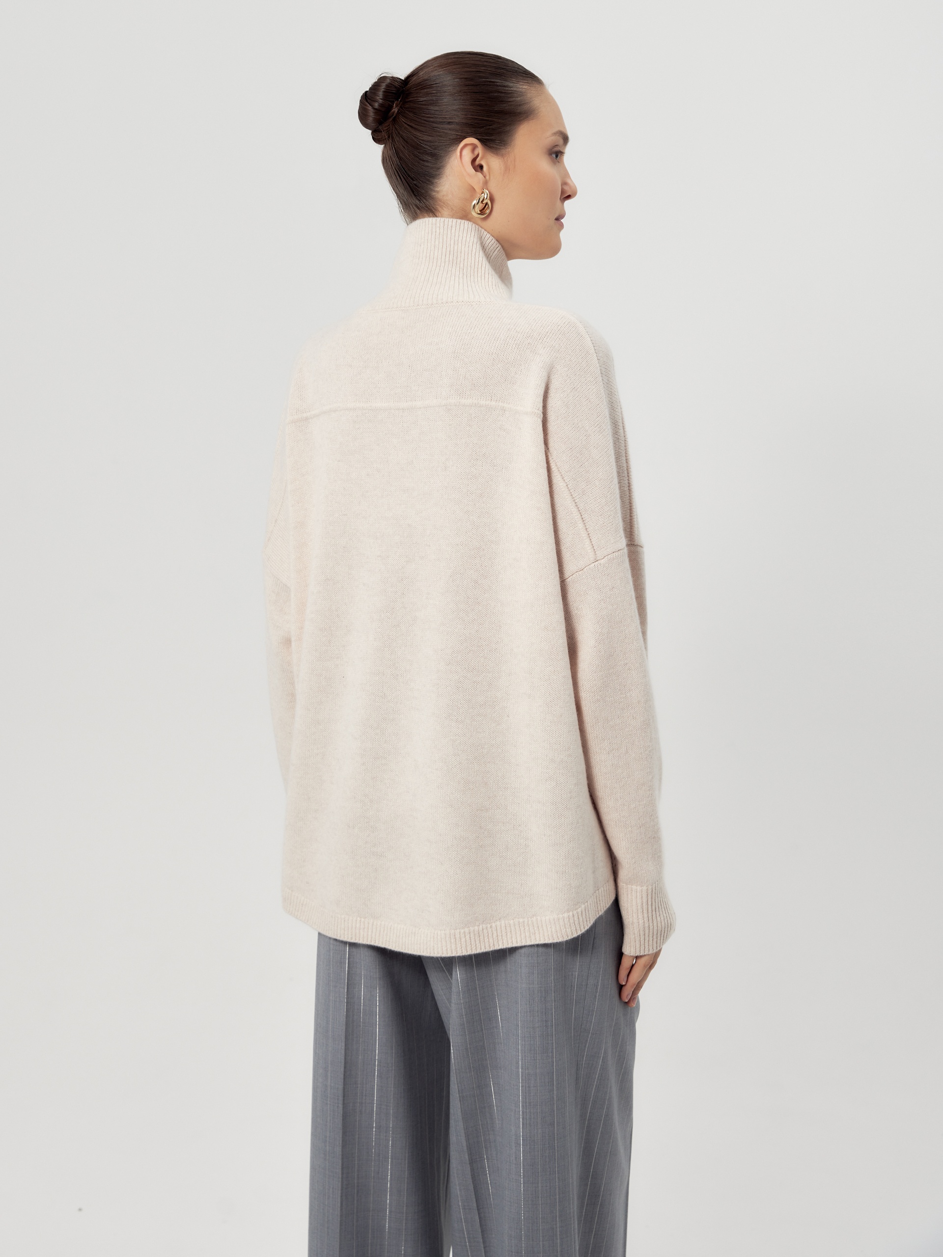 Объемный свитер прямого силуэта из лимитированной линейки POMPA Premium, выполнен из 100% нежнейшего кашемира. Свитер связан гладью, воротник-стойка с разрезом и фигурные рельефы на спинке и полочке придают изделию оригинальный вид. Благодаря объемному крою свитер идеально садится по фигуре и станет незаменимым элементом гардероба, позволяя создавать стильные и уютные образы на каждый день