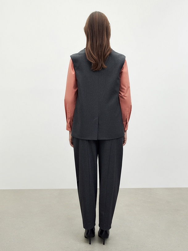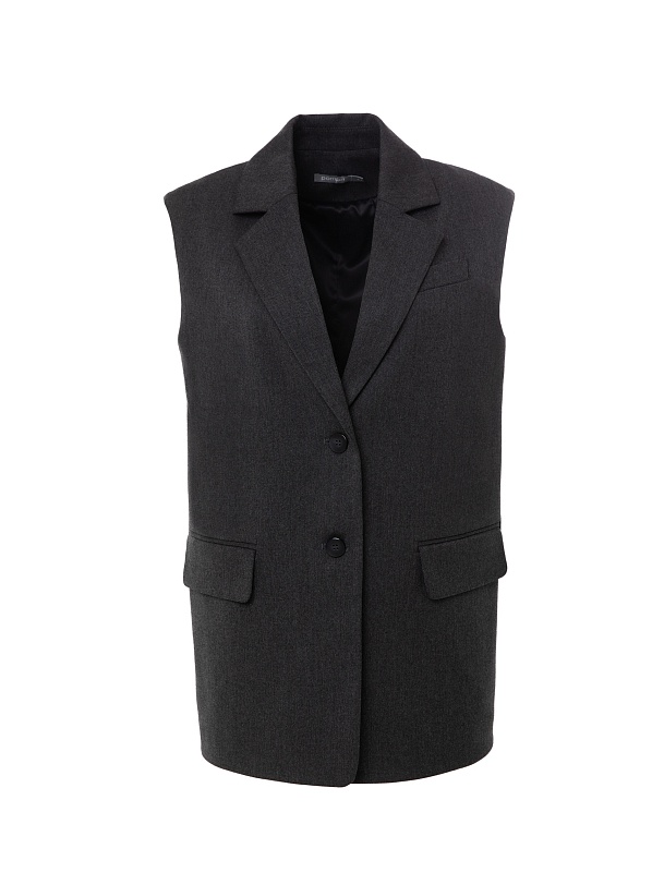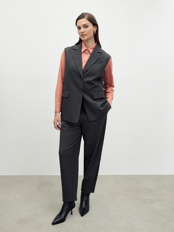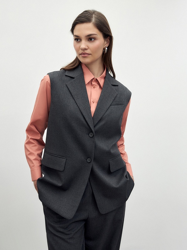 Прямой однобортный жилет со спущенной линией плеча из мягкой костюмной ткани графитового цвета. Жилет с классическим английским воротником с V-образным вырезом с прорезными карманами с клапанами на полочке, с имитацией нагрудного прорезного кармана. Жилет составит расслабленный, но деловой образ с широкими брюками на резинке.