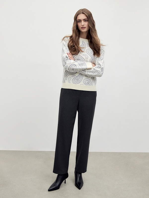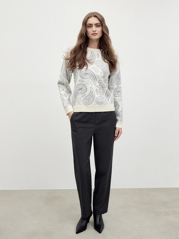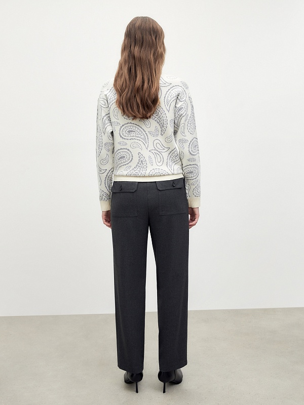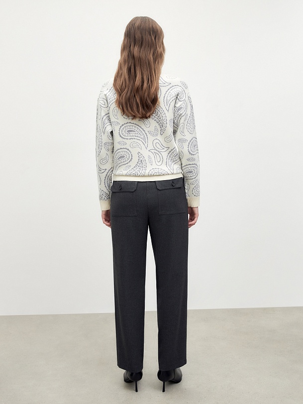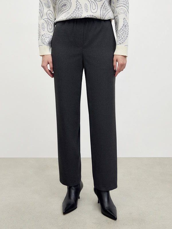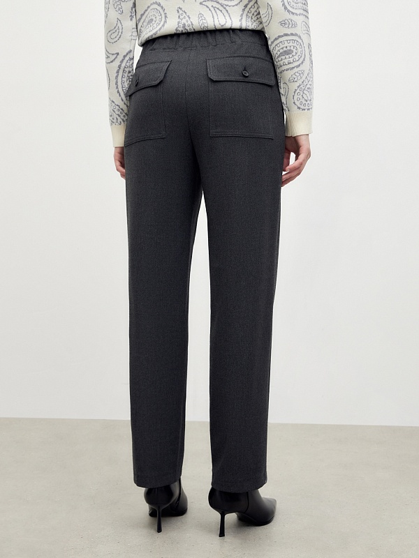 Свободные широкие брюки на резинке из мягкой вискозной ткани в благородном цвете графит. Брюки с имитацией гульфика, по бокам рабочие карманы. На задней половине брюк накладные карманы с клапаном на пуговице.