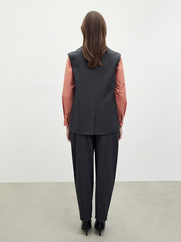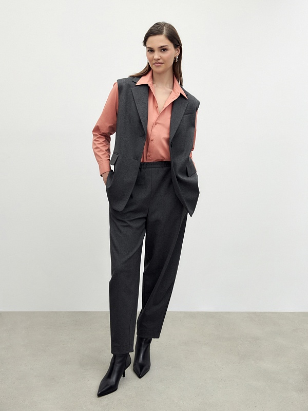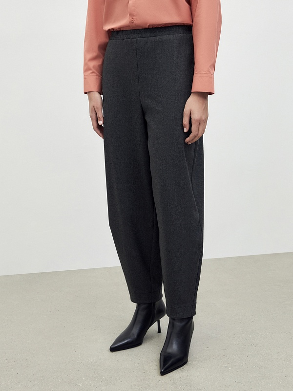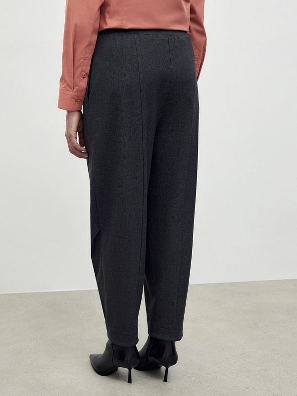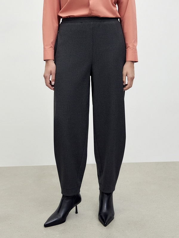 Брюки бананы на резинке из мягкой костюмной вискозной ткани в благородном цвете графит. Брюки с карманами в боковых швах.