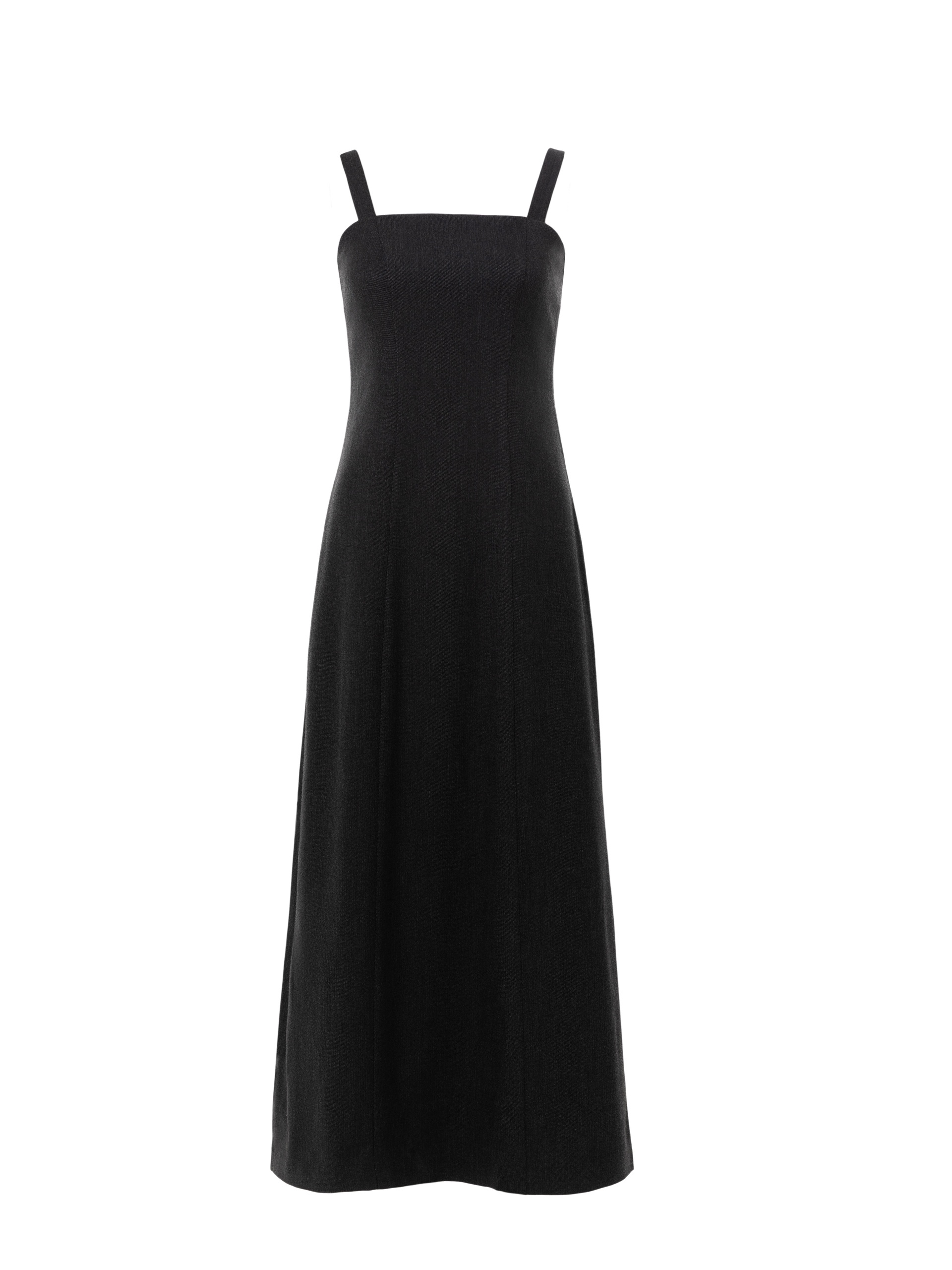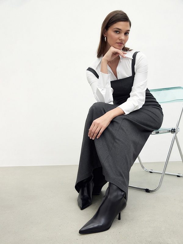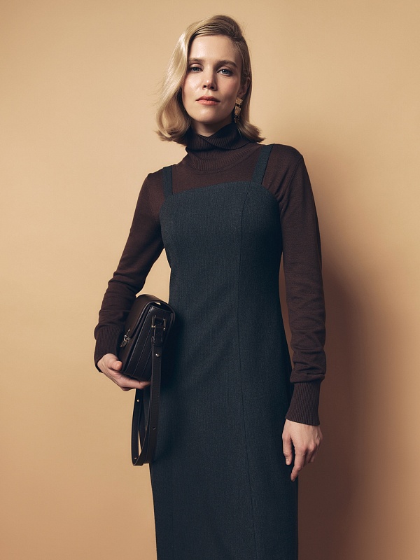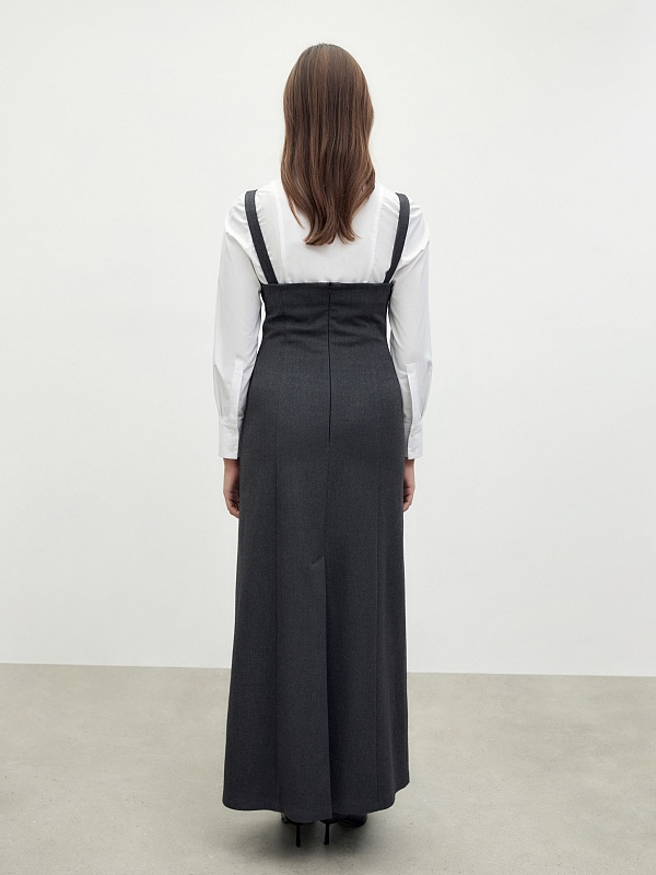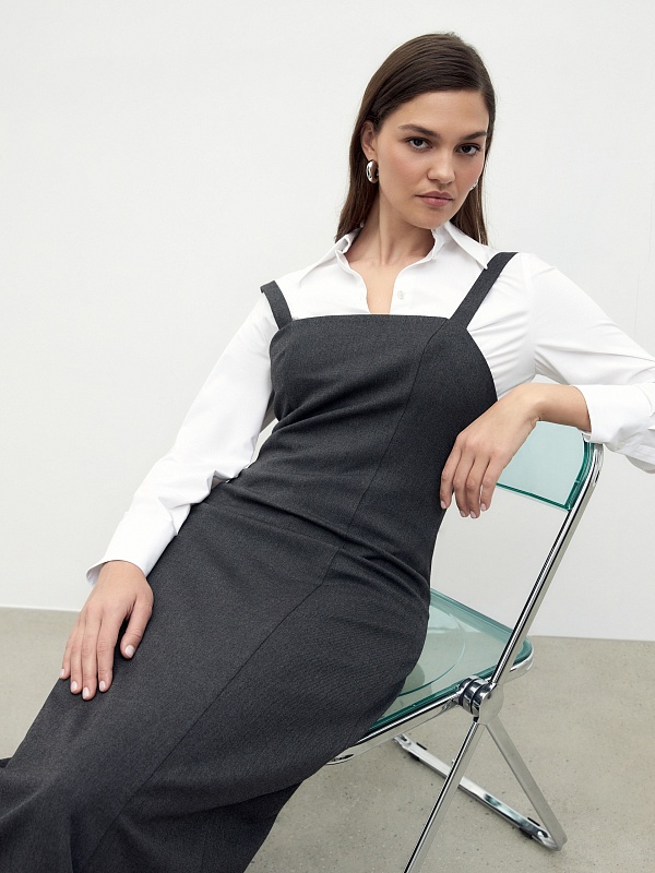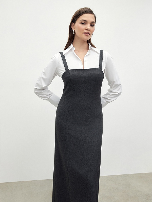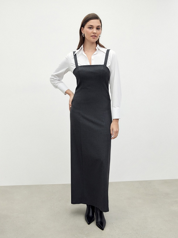 Прилегающие платье на широких бретелях, прямое к низу с рельефами и шлицой на спинке. Платье с потайной молнией на спинке и на подкладке. Выполнено из мягкой костюмной ткани в благородном цвете графит.