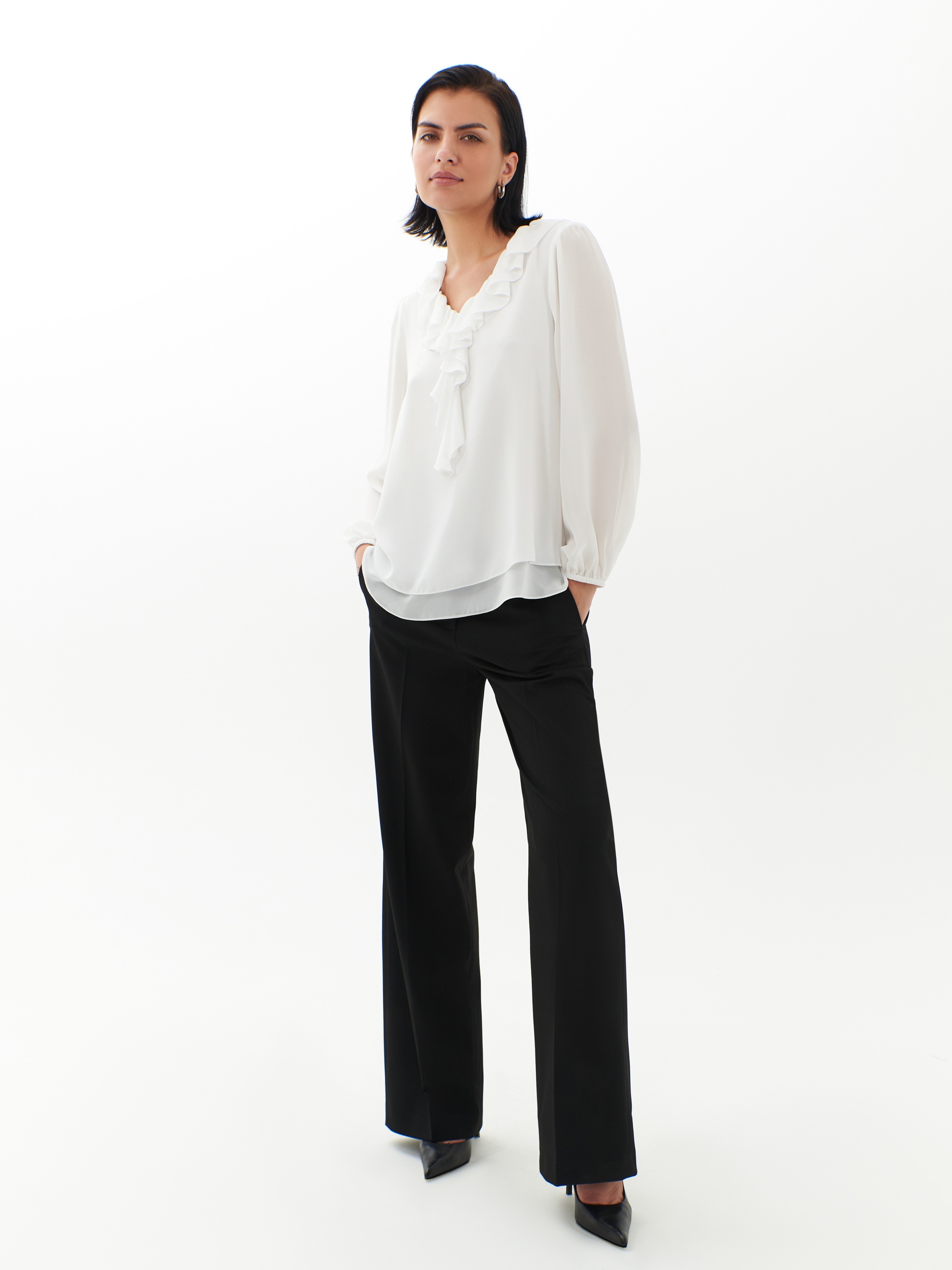 Блуза свободного силуэта с V-образным вырезом и рюшей