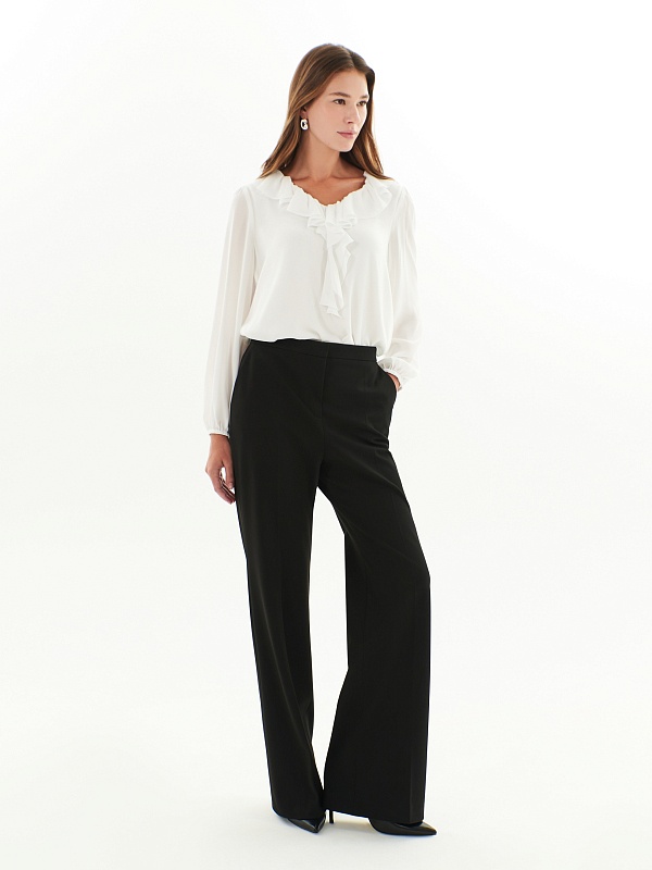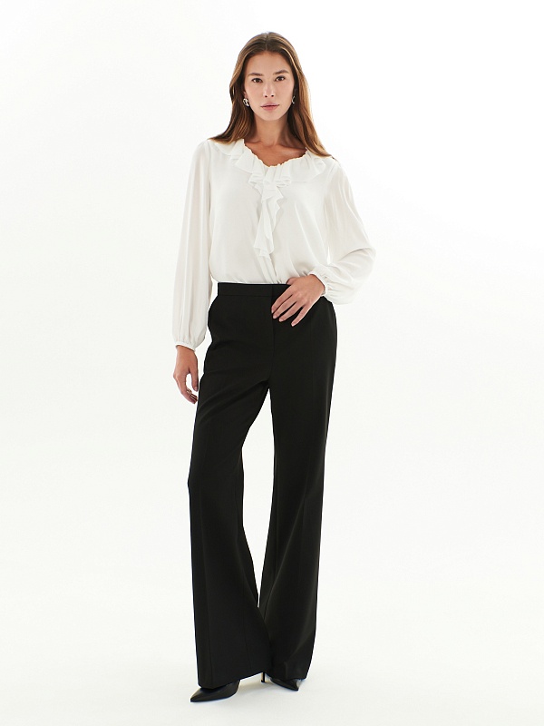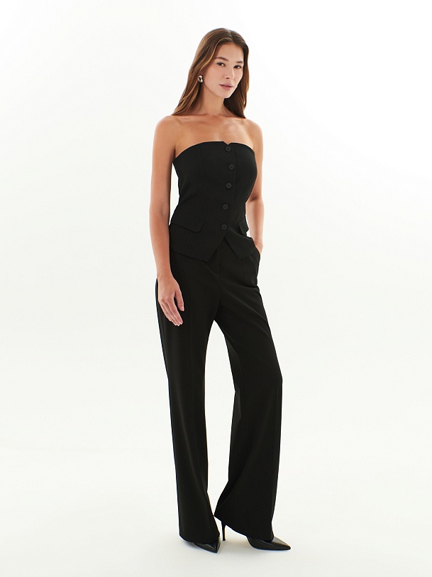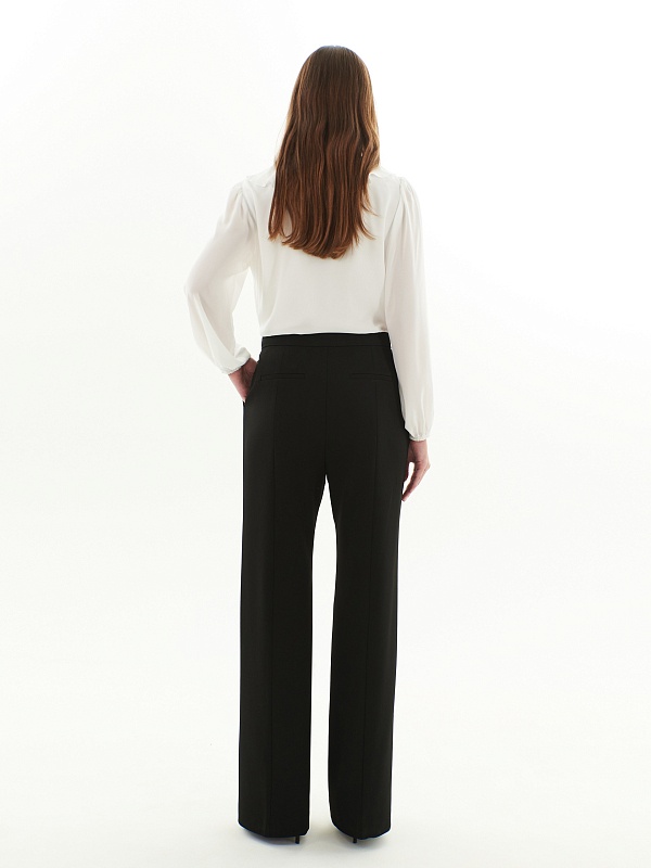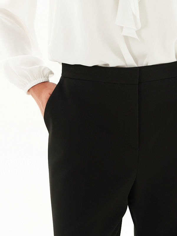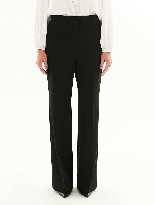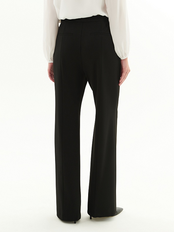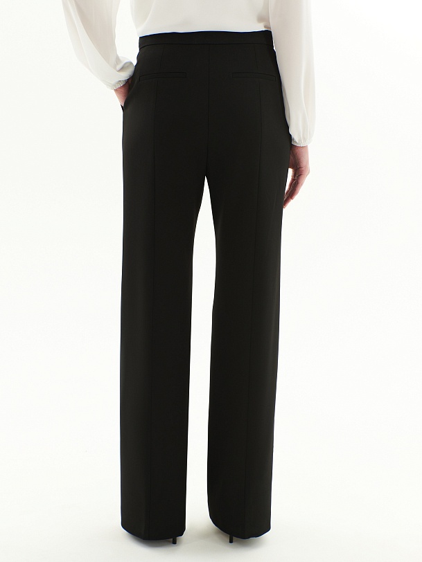 Брюки полуприлегающего силуэта немного расклёшенные к низу из костюмной ткани черного цвета. Застежка на молнию и пуговицу. Имеют два функциональных кармана в боковых швах и два прорезных кармана сзади.