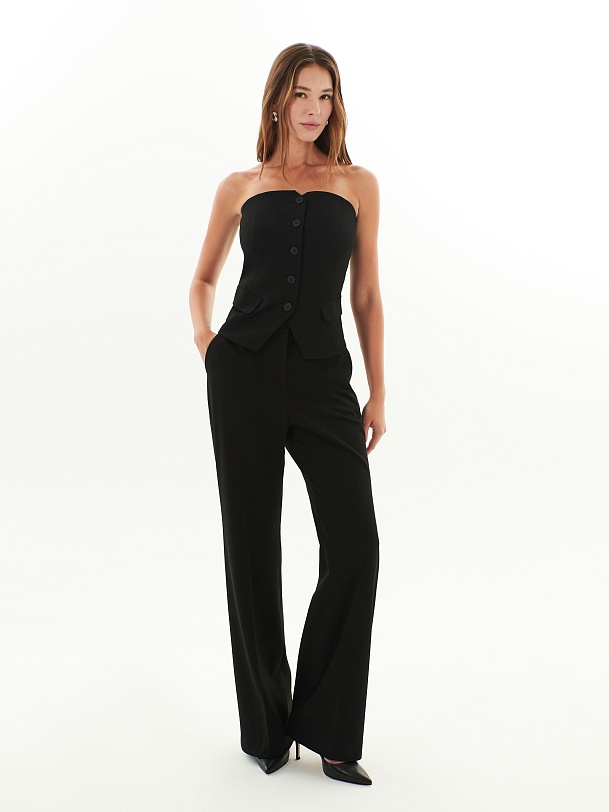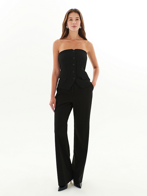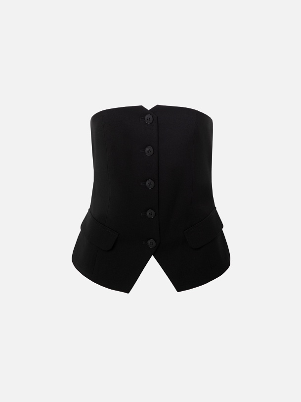 Жилет на пуговицах прилегающего силуэта с открытой линией декольте из костюмной ткани в черном цвете. Накладные клапана под углом. В боковых швах и на скинке вставлен регелин для лучшей посадки. Составит яркий и дерзкий образ с брюками из одной ткани.