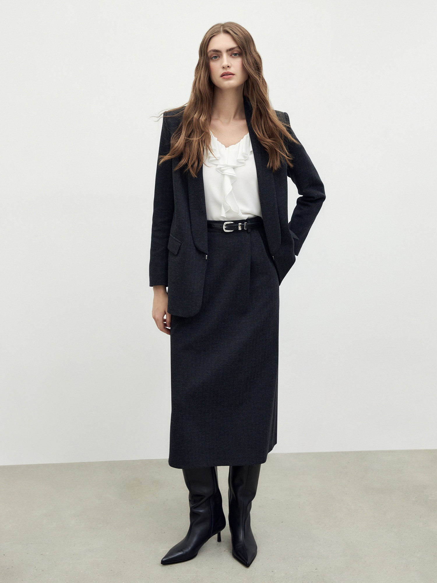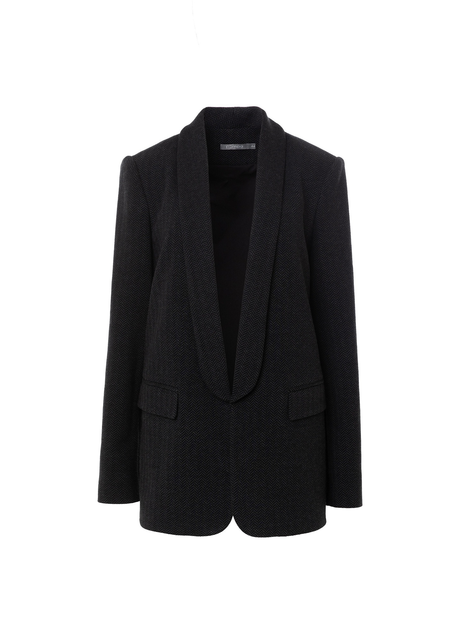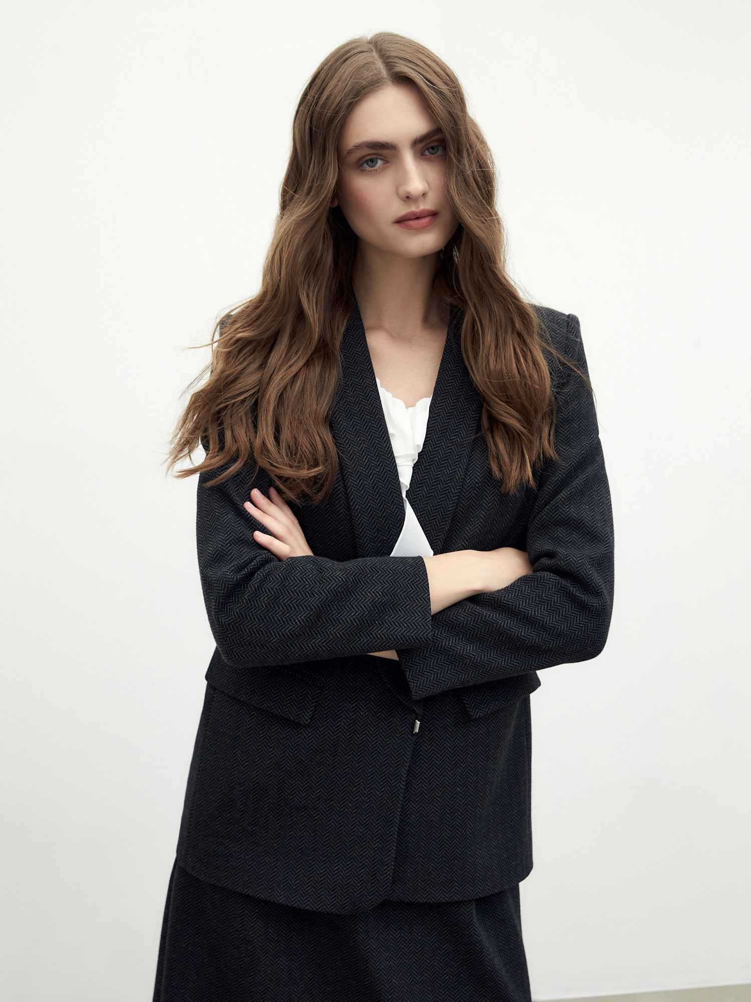 Трикотажный жакет прямого силуэта, рисунок полотна "ёлочка", воротник шалька, застёжка на крючок. Мягкий силуэт жакета в комплекте с юбкой или брюками из такой же ткани из нашей коллекции станет прекрасным комплектоми для кэжуальных ежедневных образов.