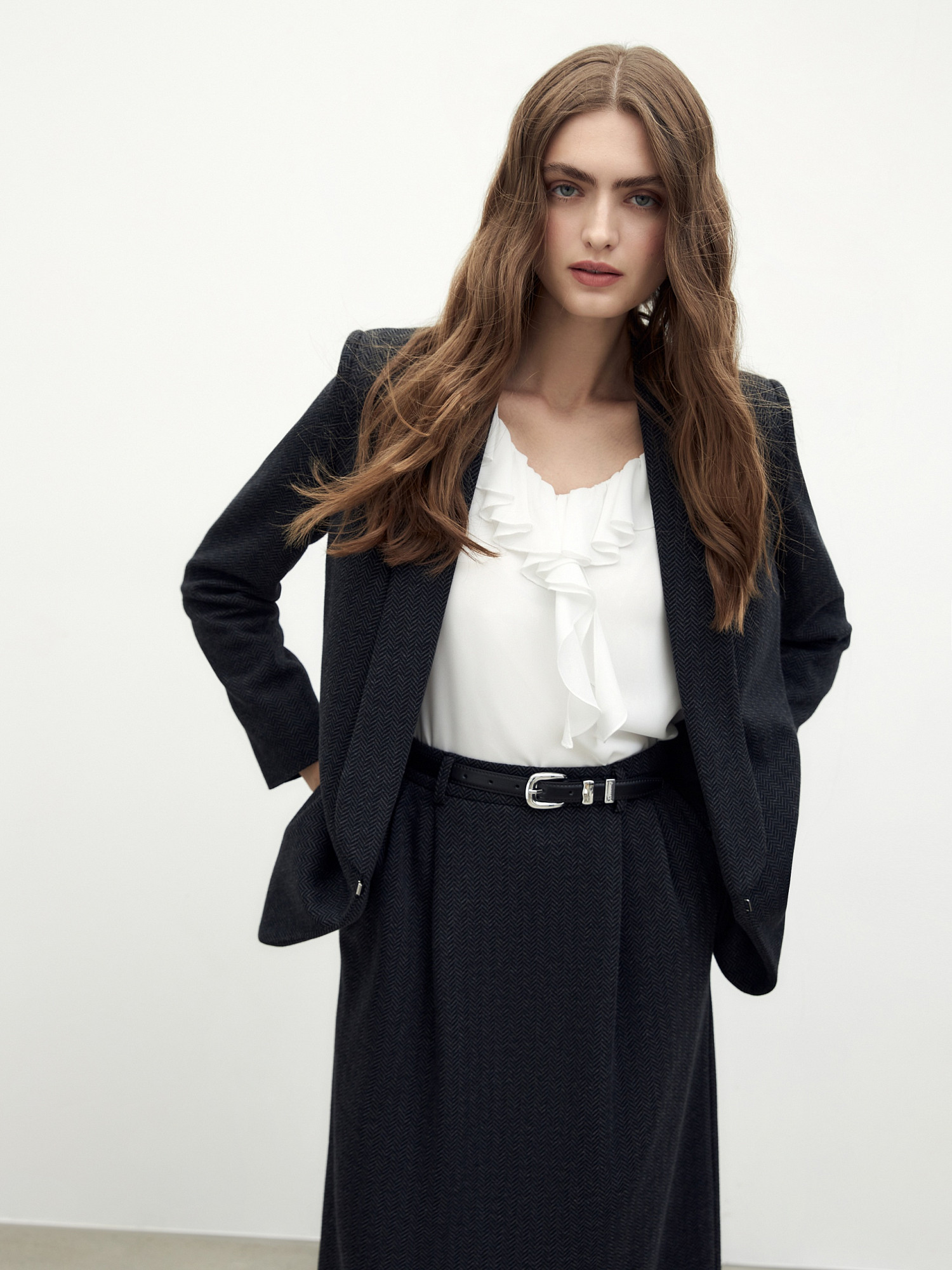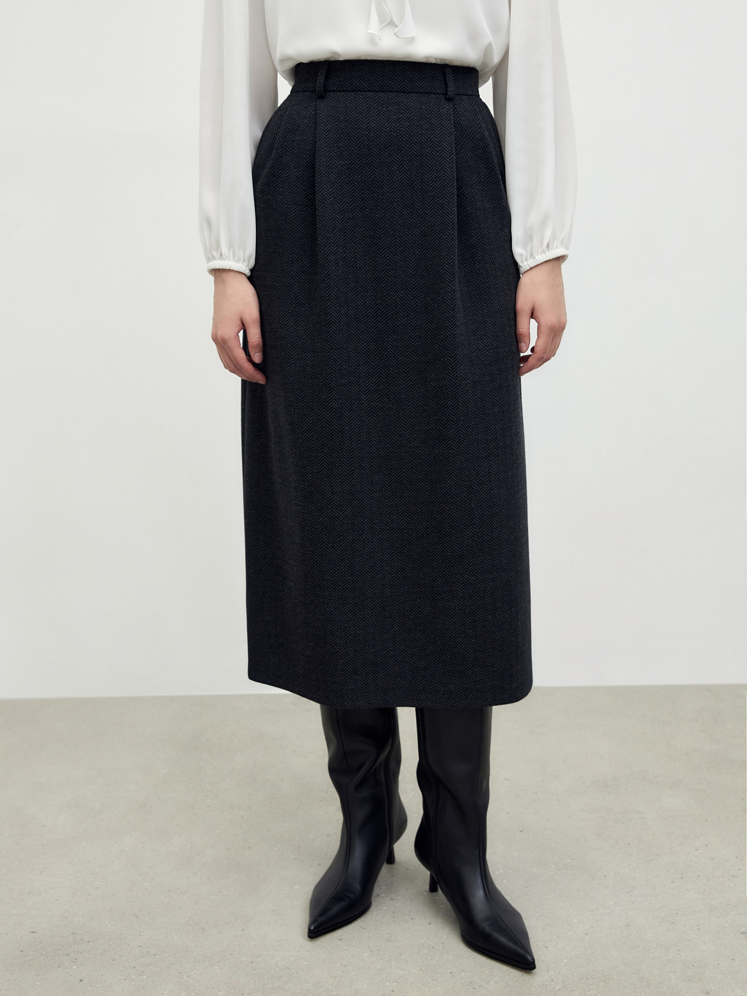 Прямая юбка из жаккардового трикотажа с рисунком "ёлочка" со складками по поясу спереди, молнией и шлицей по спинке. Юбка в комплекте с жакетом из такой же ткани из нашей коллекции станет прекрасным комплектоми для кэжуальных ежедневных образов.