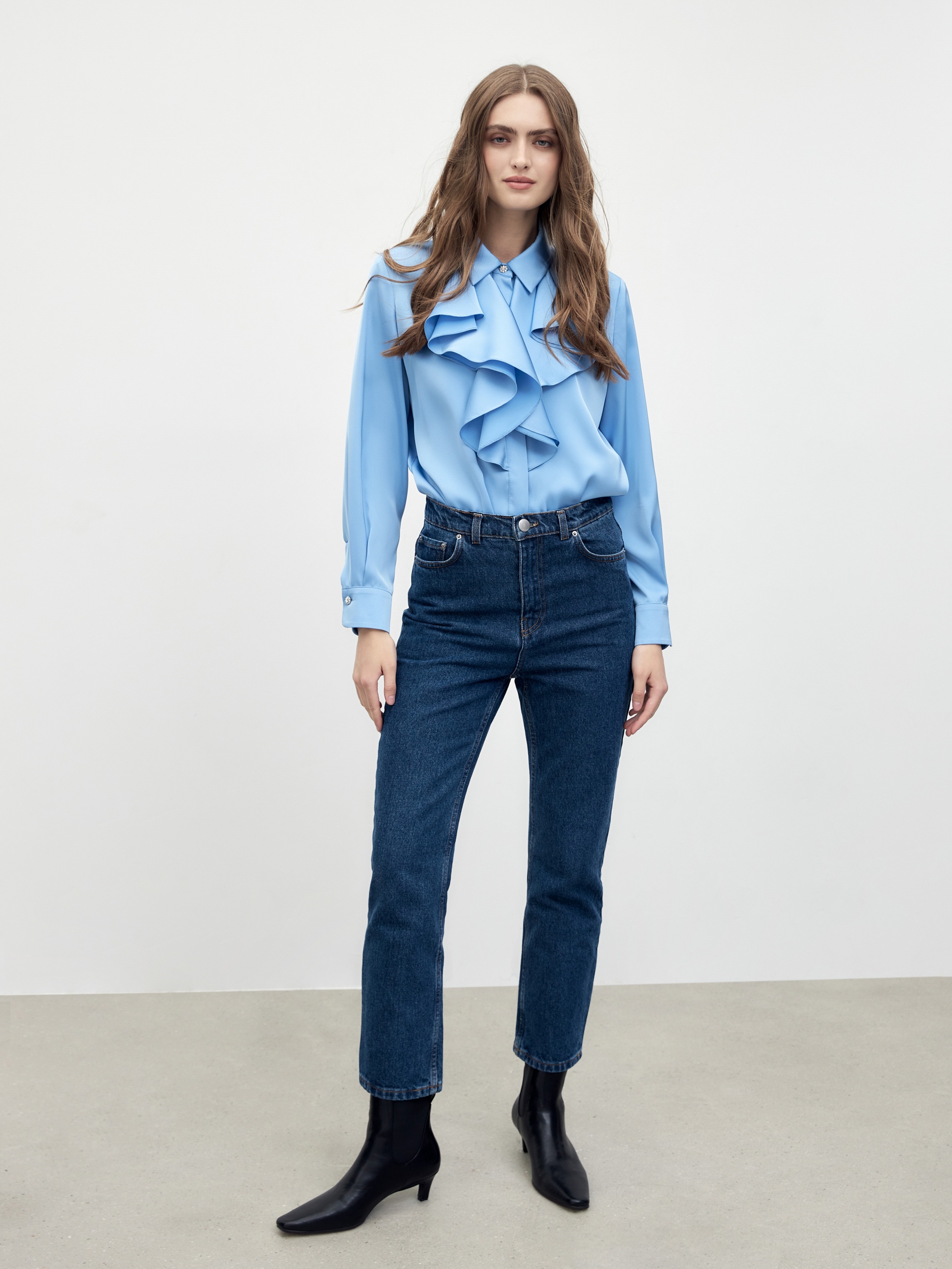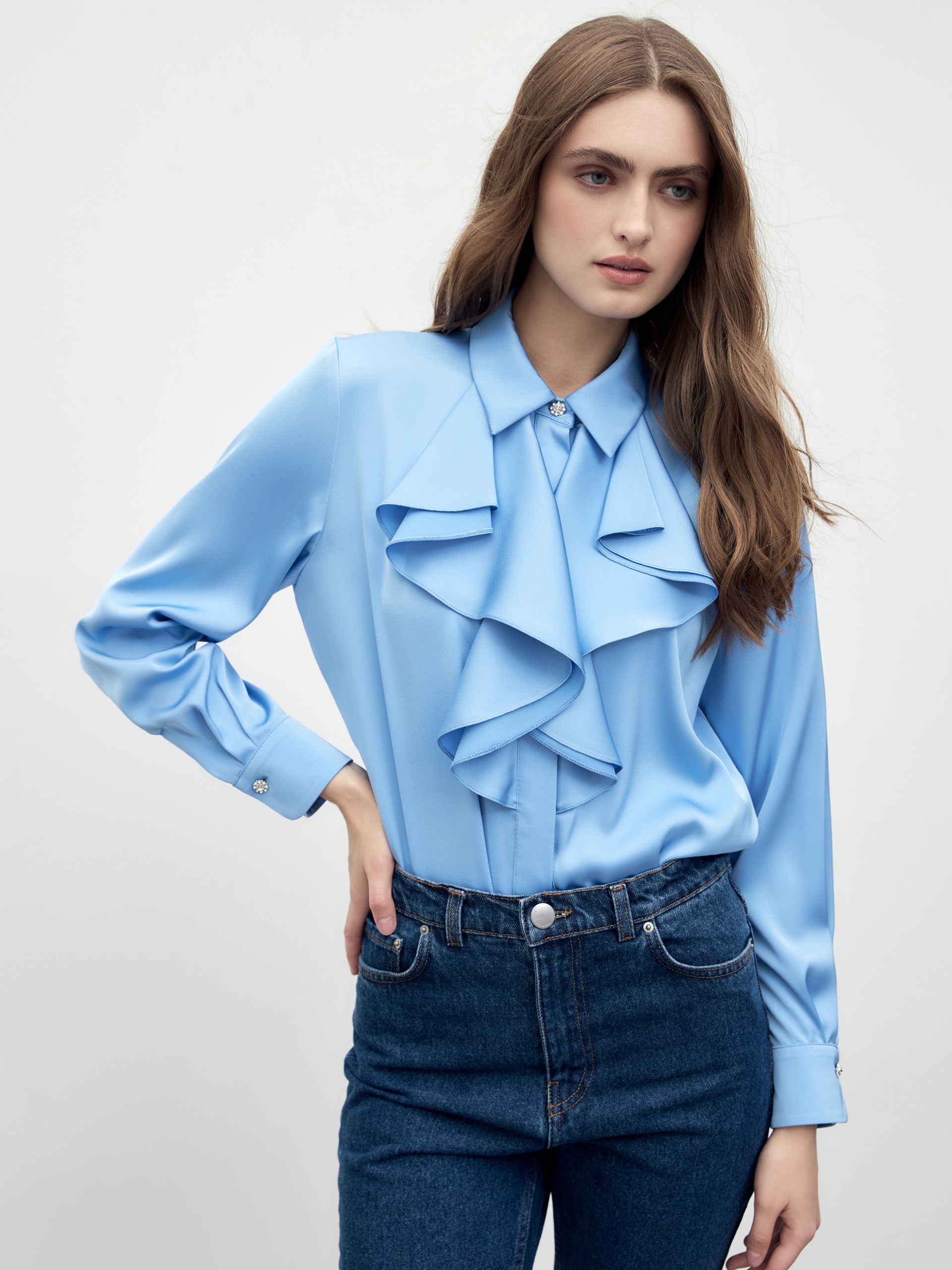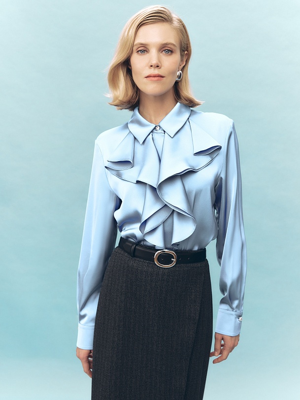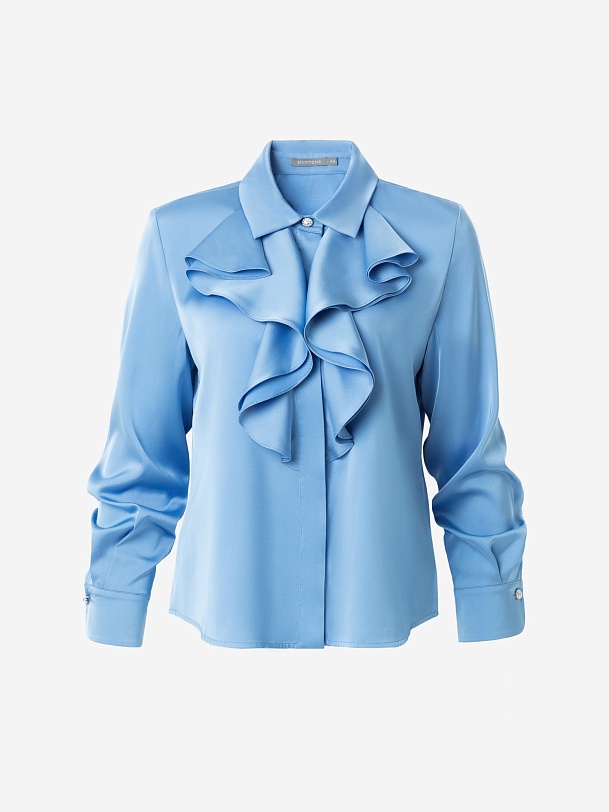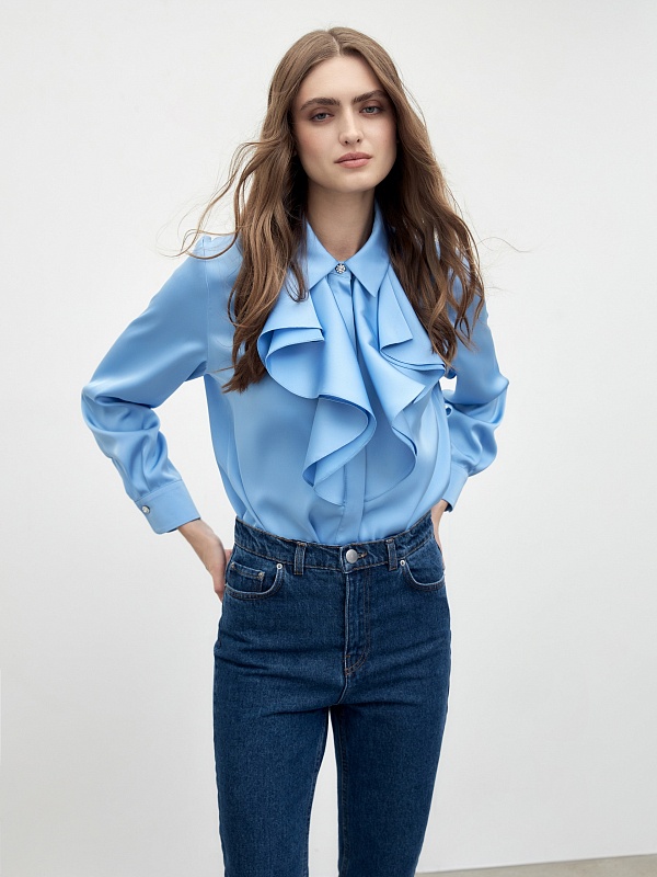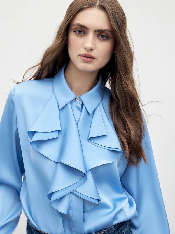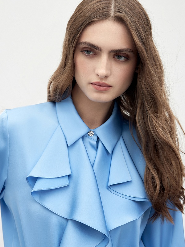 Прямая блуза из атласной ткани голубого цвета с отложным воротником и потайной планкой. По горловине блузы изысканными складками лежит двухслойный волан. Блуза со спущенной линией плеча и классическим прямым рукавом на манжете. Ярким декоративным элементом являются яркие пуговицы на стойке и манжетах.