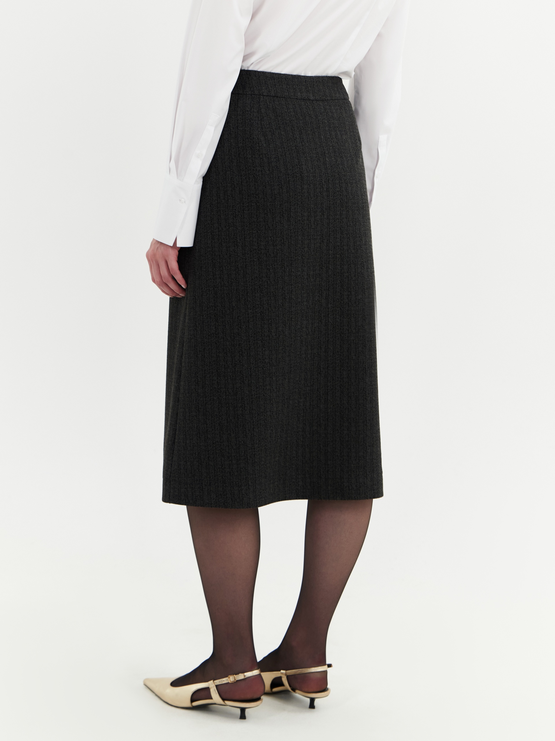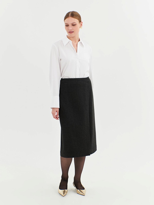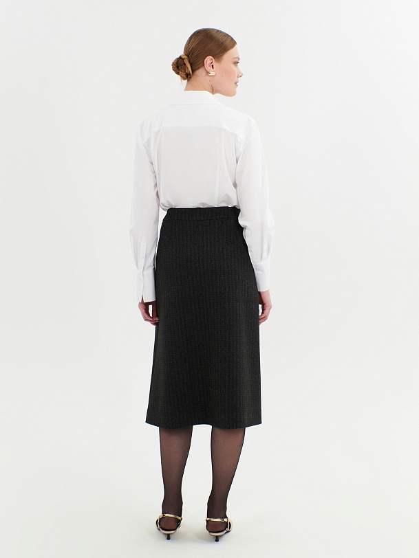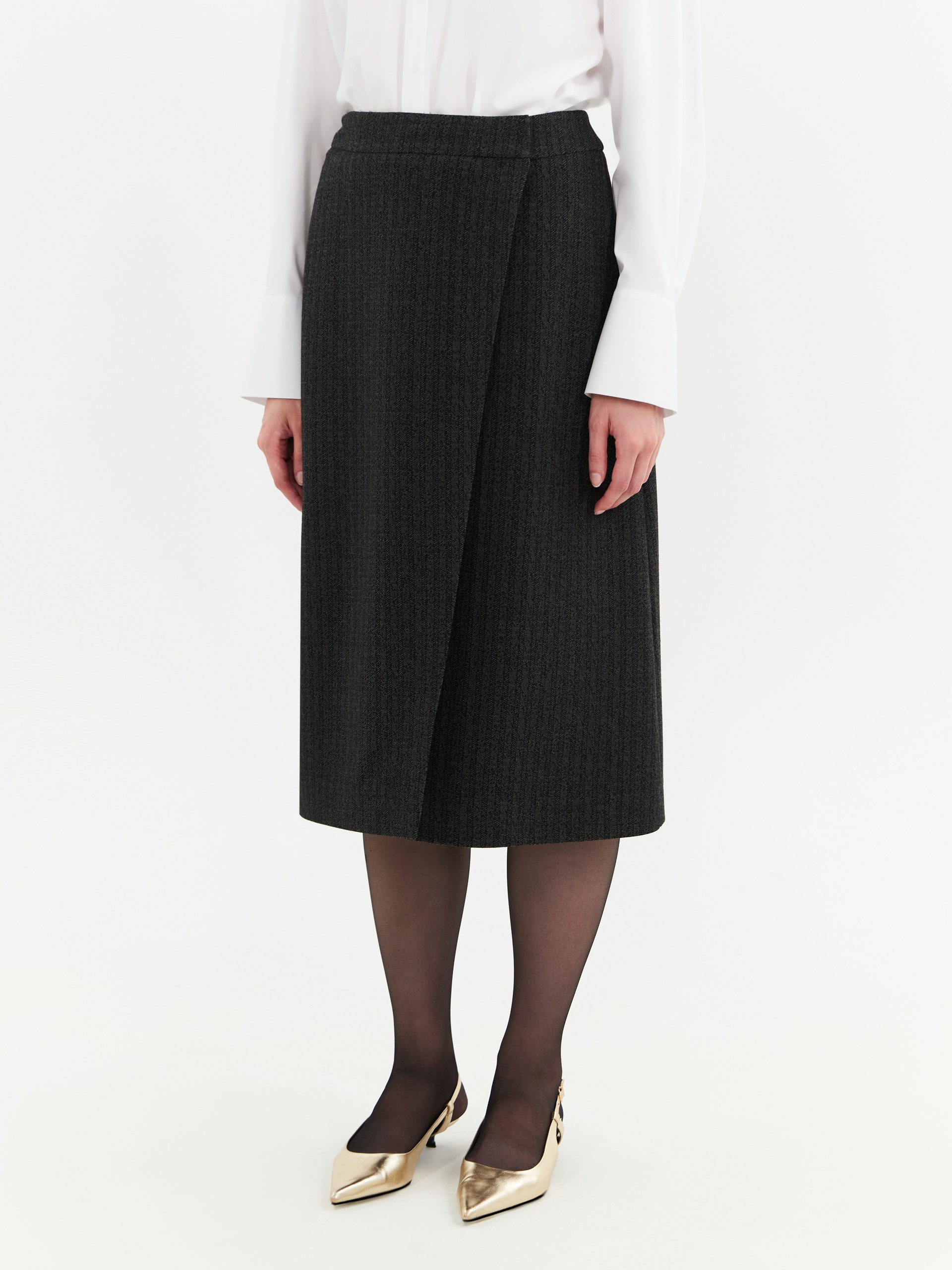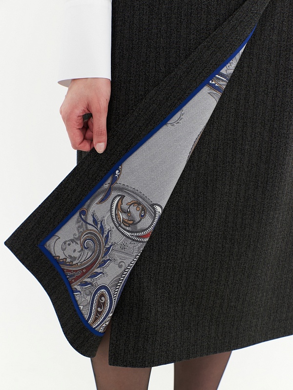Юбка из костюмного трикотажа: с одной стороны классическая серая полоска, с внутренней стороны - разноцветный орнамент "огурцы". Юбка на запах, застёжка на пуговицу и крючок. В нашей коллекции вы найдёте жакет из такой же ткани, вместе с юбкой они создадут лаконичный осенний ансамбль.