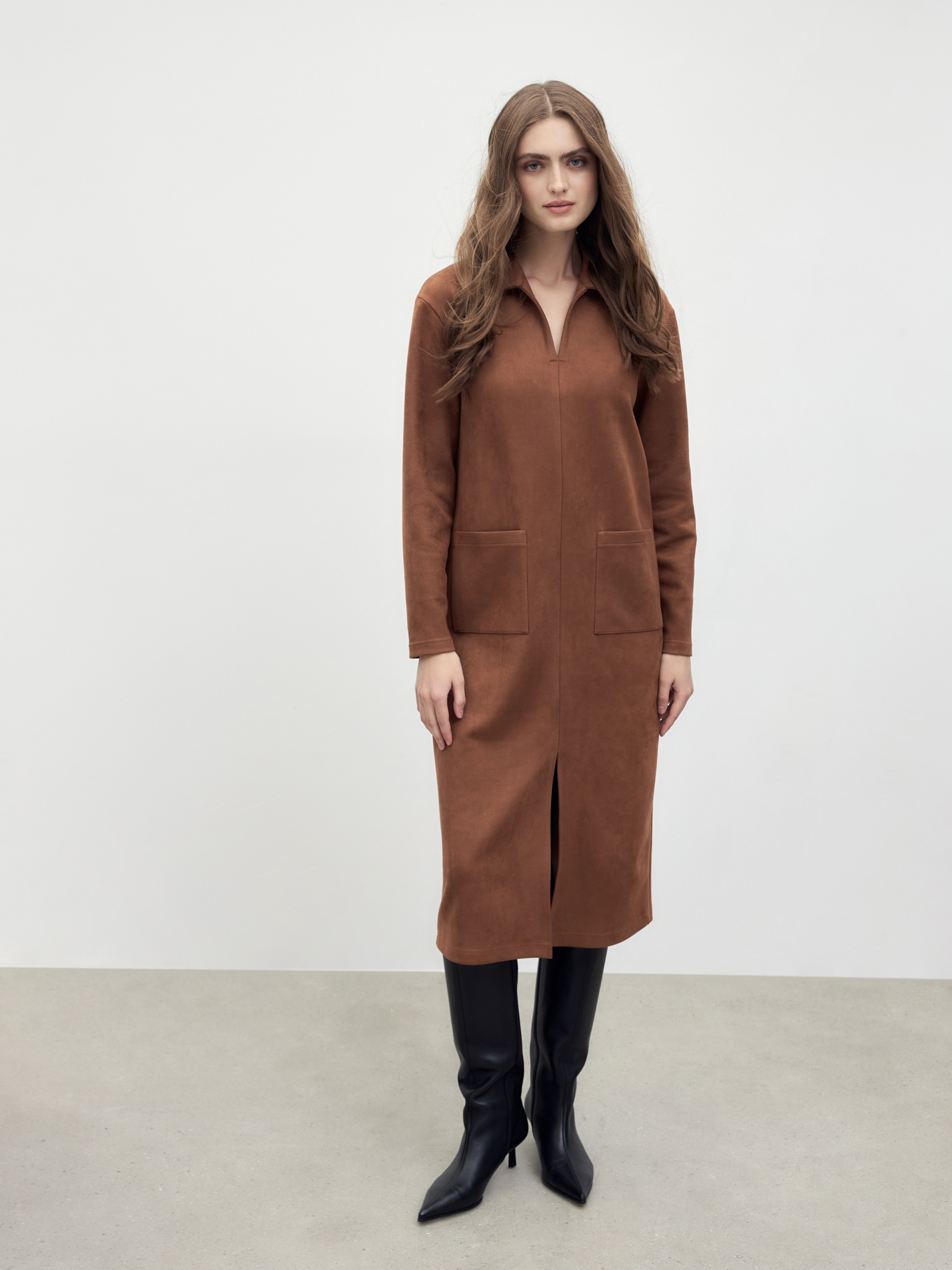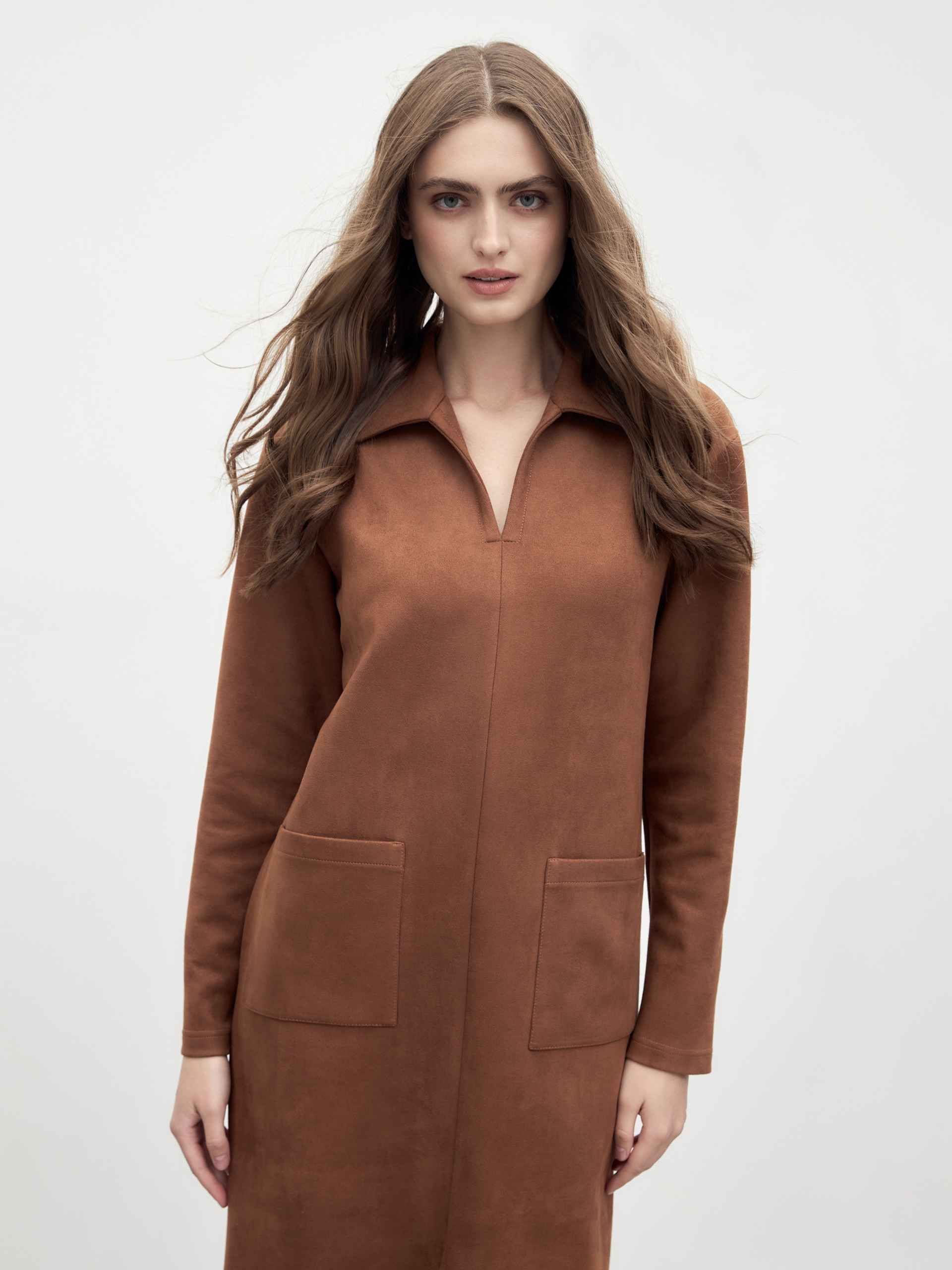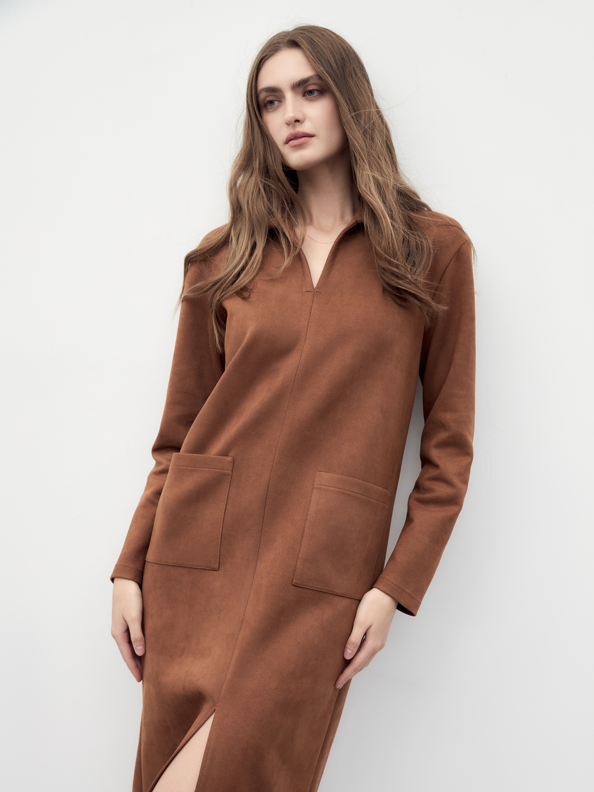 Прямое платье-миди из искусственной замши, рукав полной длины, воротник отложной, V-образный вырез горловины. Данное платье в этническом стиле прекрасно сочетается с высокими сапогами и с золотыми украшениями.