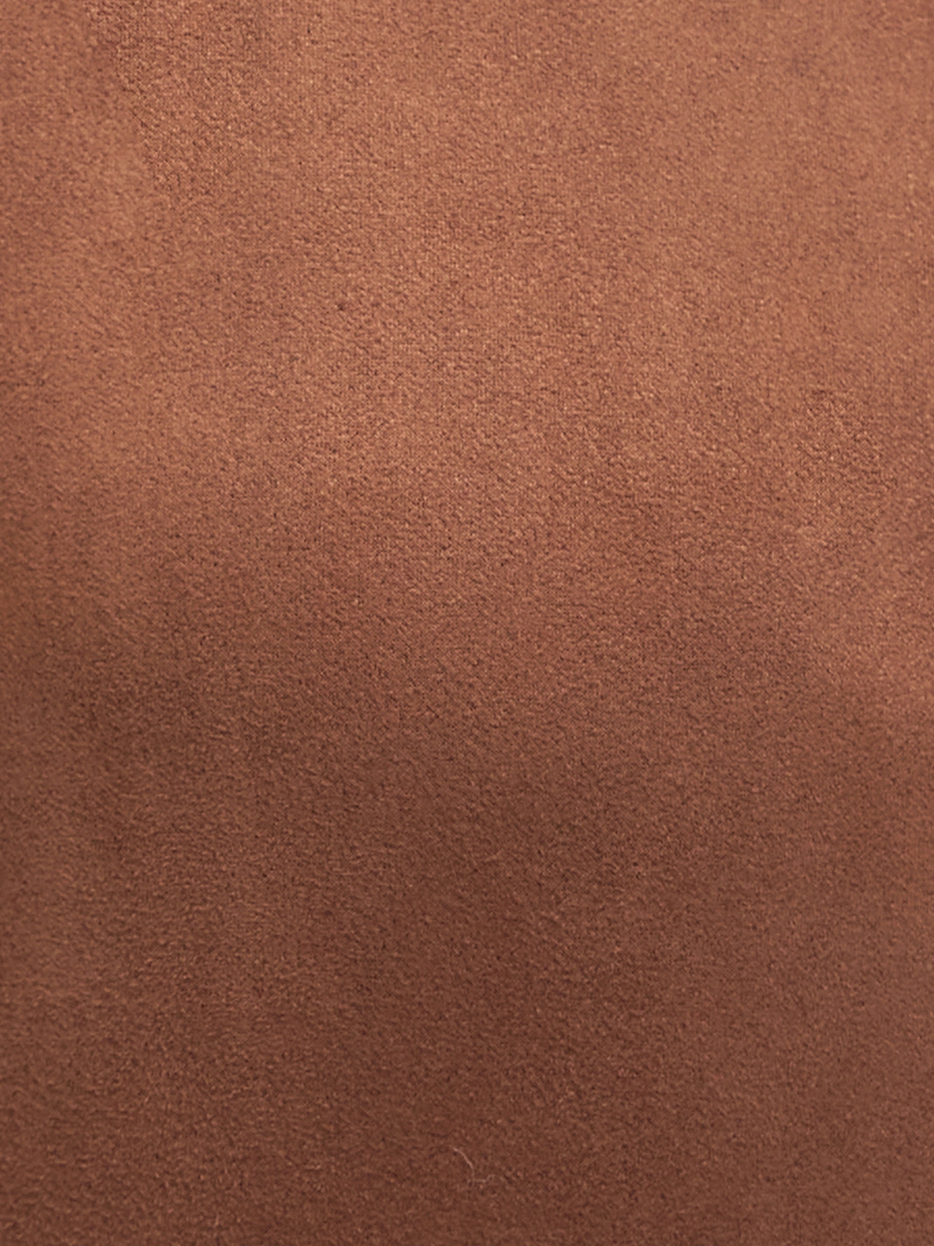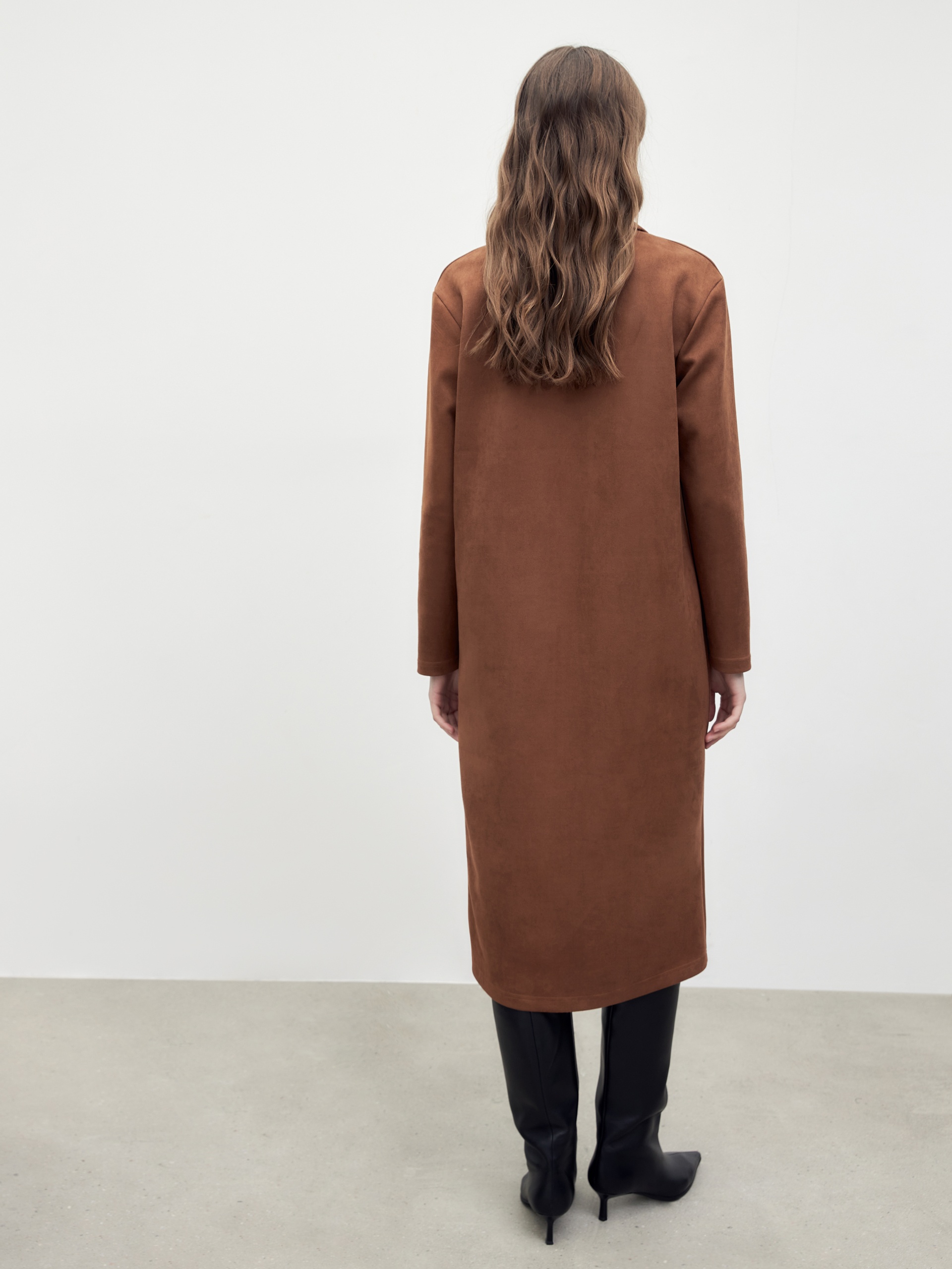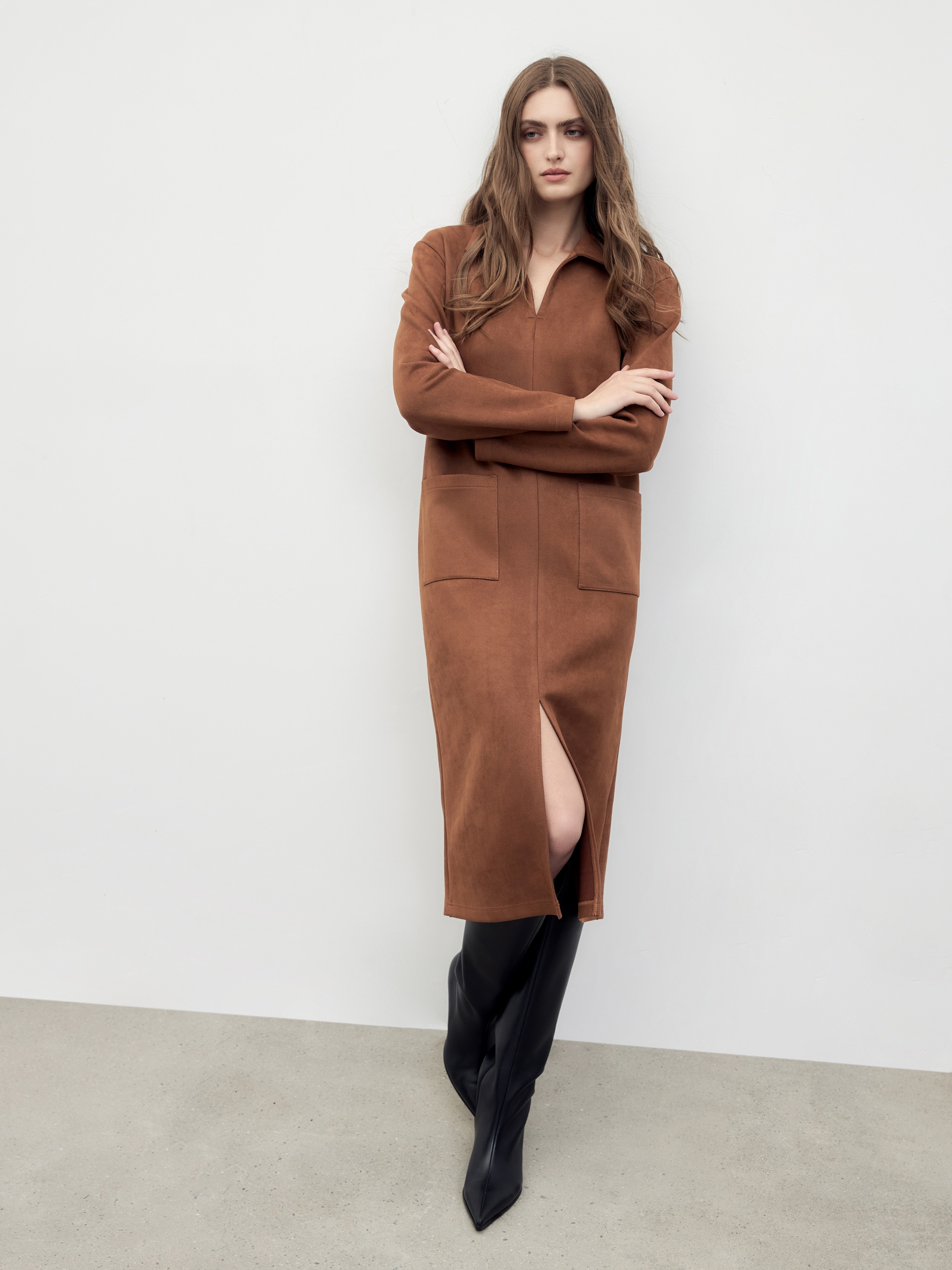 Прямое платье-миди из искусственной замши, рукав полной длины, воротник отложной, V-образный вырез горловины. Данное платье в этническом стиле прекрасно сочетается с высокими сапогами и с золотыми украшениями.