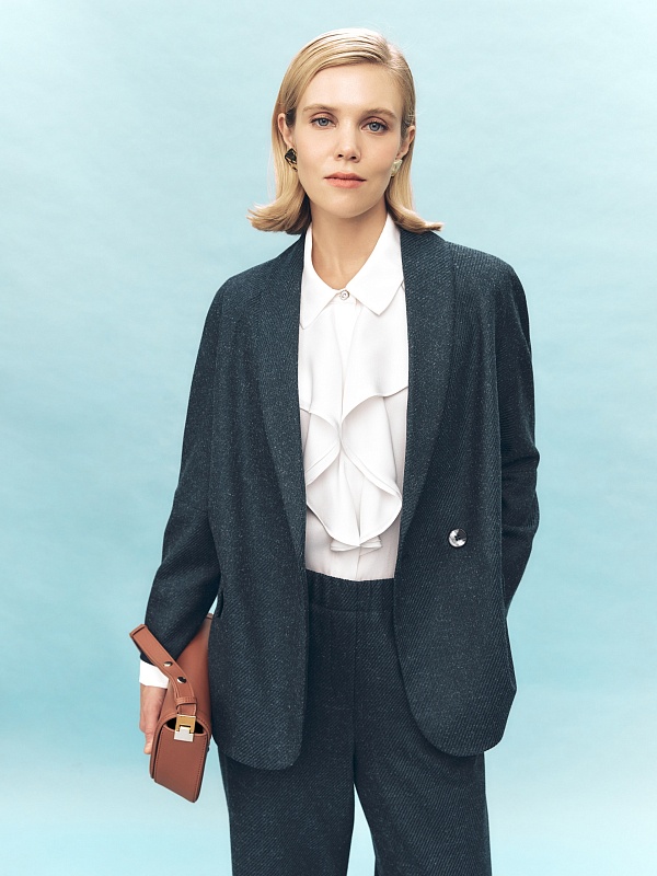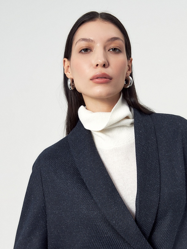 Жакет на подкладке прямого силуэта с воротником-шаль, мягким спущенным плечом и укороченным рукавом. Застежка на пуговицу. Края бортов закругленные. Жакет идеально сочетается с брюками из этой же ткани. В комплект входит пояс из основной ткнаи.