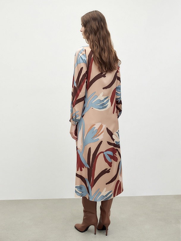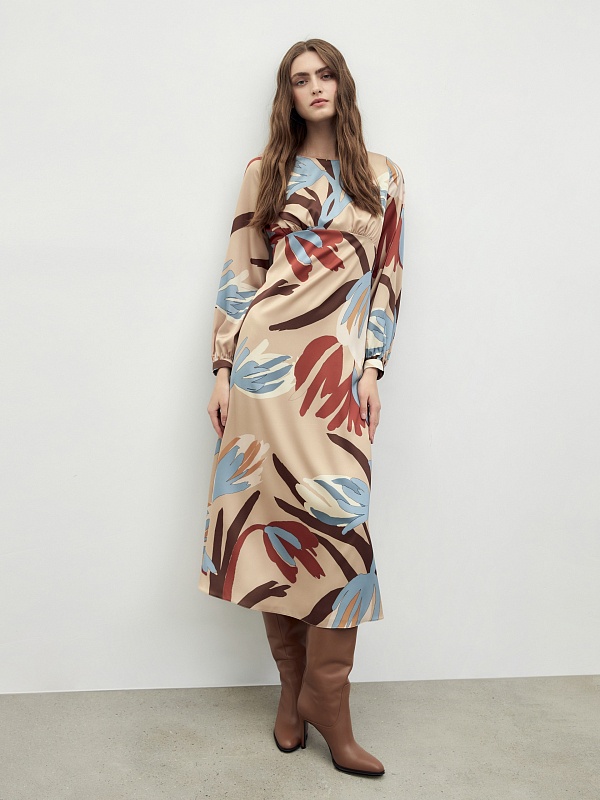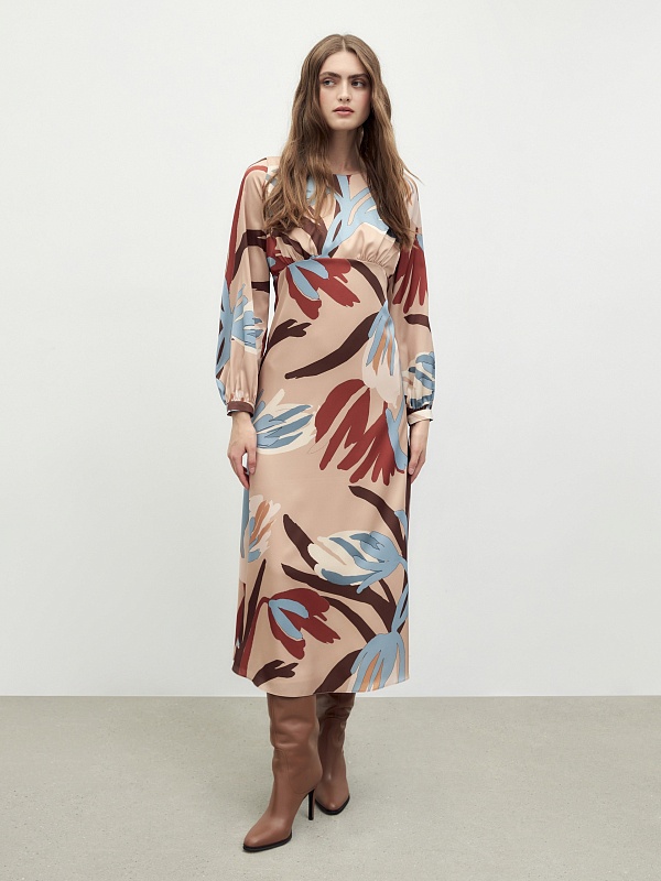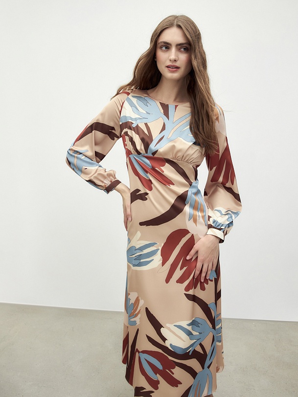 Платье полуприлегающего силуэта с отрезной линией под грудью, длинной макси и расклёшенной юбкой. Платье с круглой горловиной. Объемный втачной рукав на узком манжете. Платье выполнена из плательной ткани с крупным флоральным принтом.