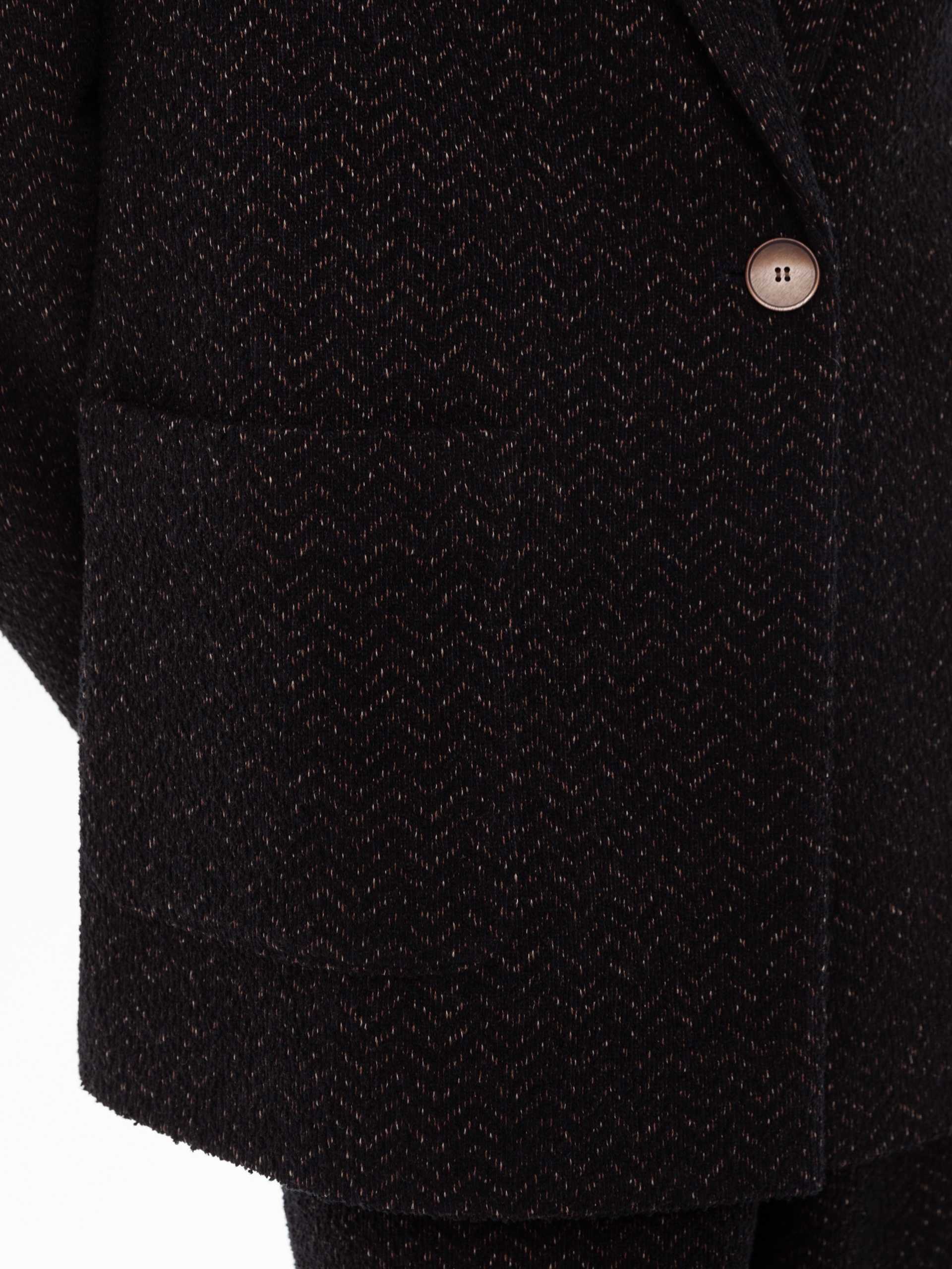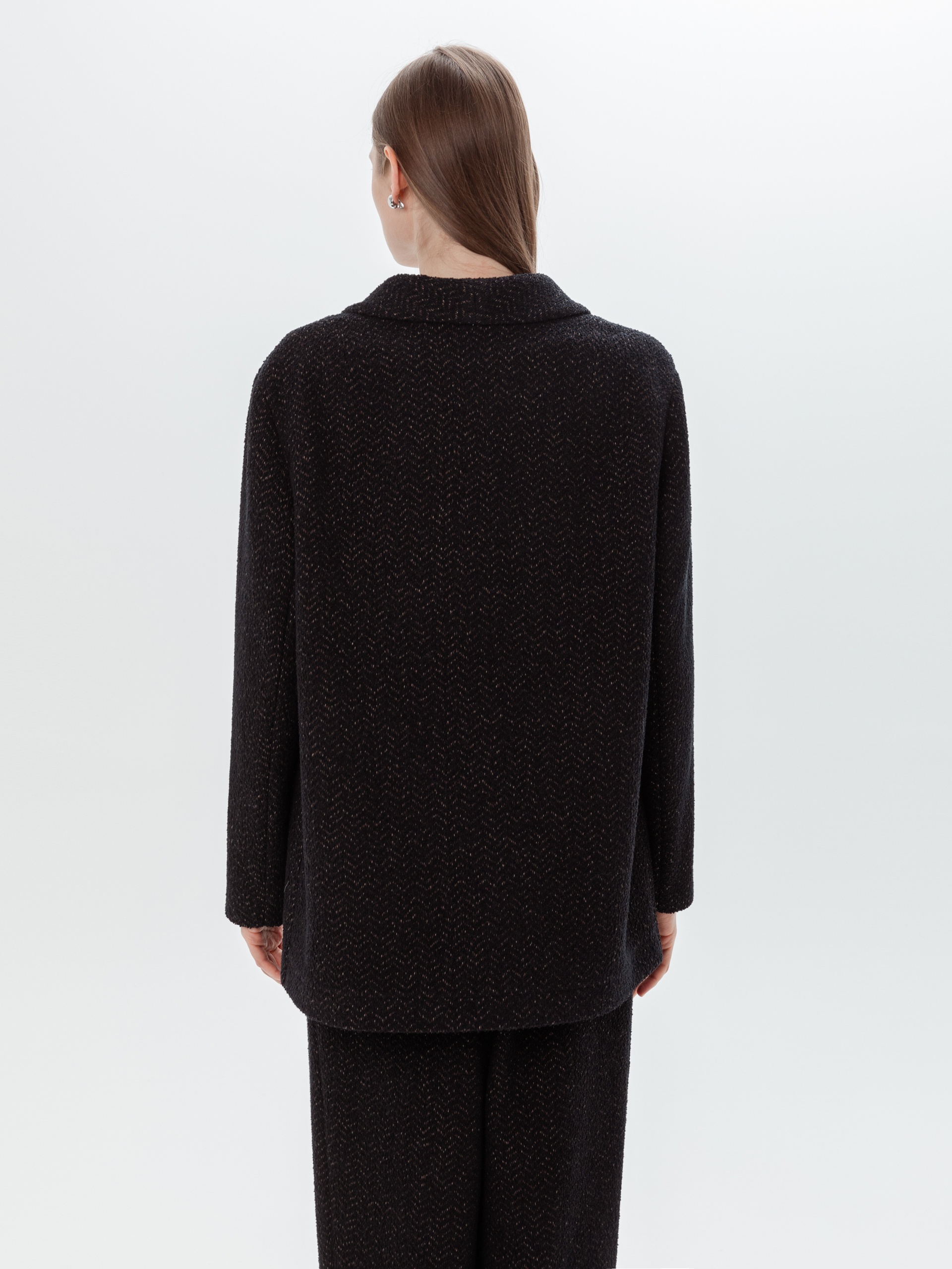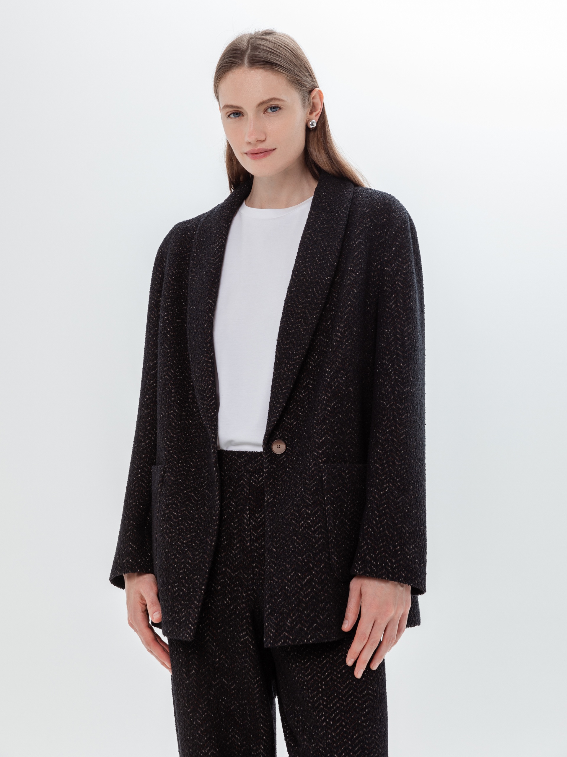 Прямой однобортный жакет в стиле smart casual из трикотажного полотна, застёжка на одну пуговицу, английский воротник. В комплект к жакету предлагаем брюки из той же ткани.