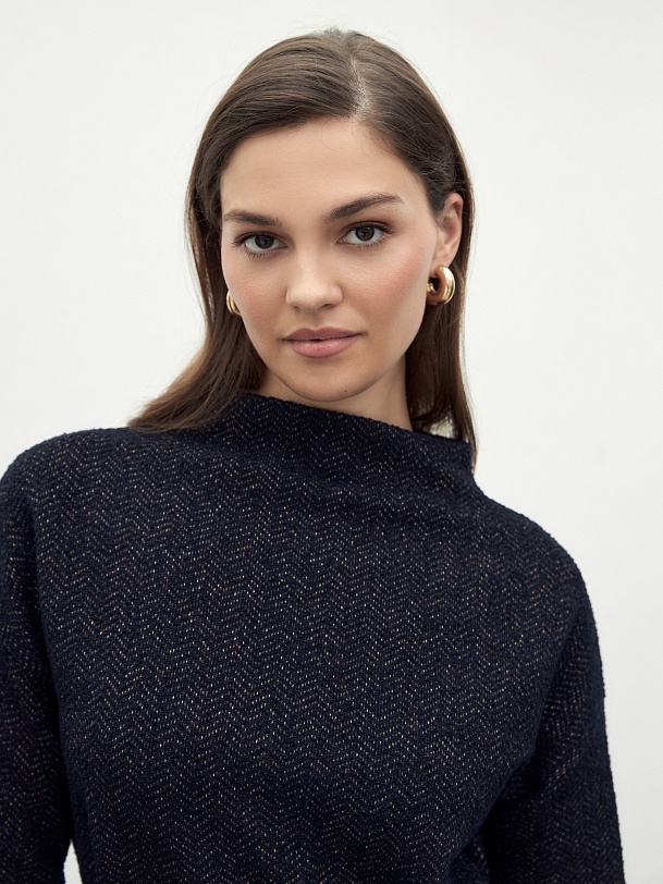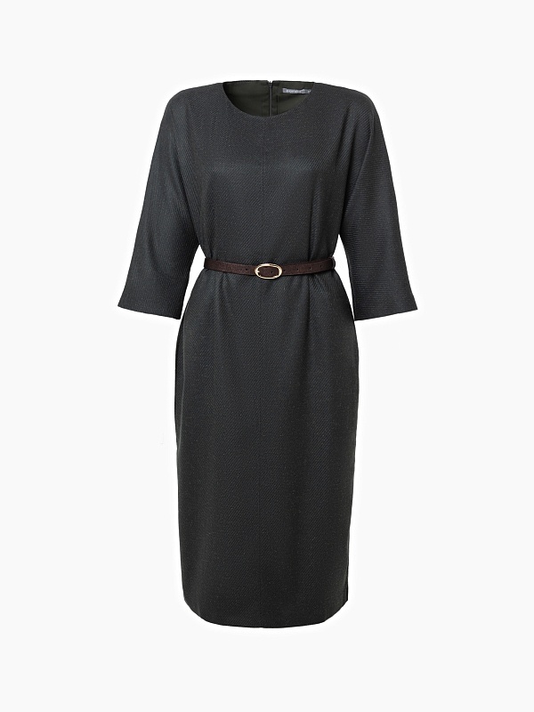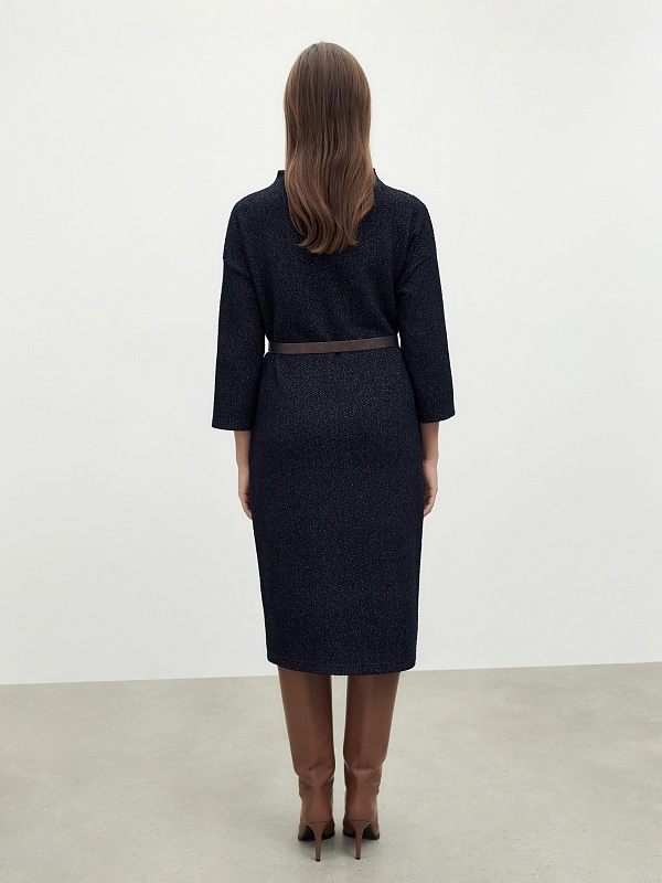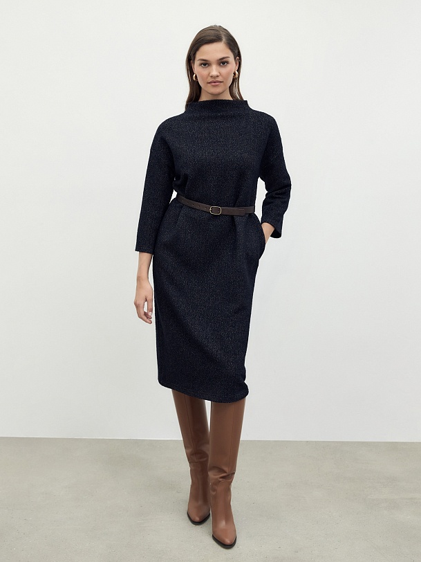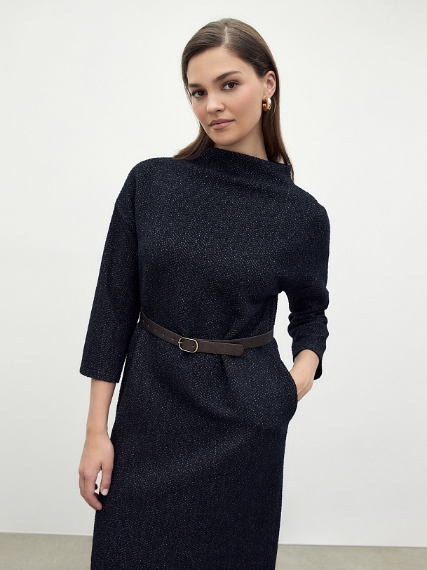 Платье из фактурного трикотажа прямого силуэта с цельнокройным воротником-стойка и широким укороченным рукавом кимоно. В комплект входит мягкий пояс из основной ткани для создания более приталенного силуэта.