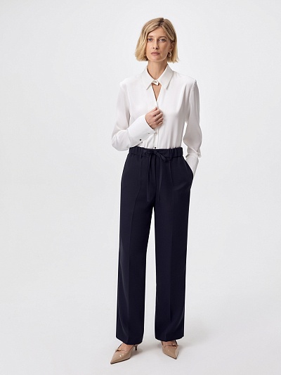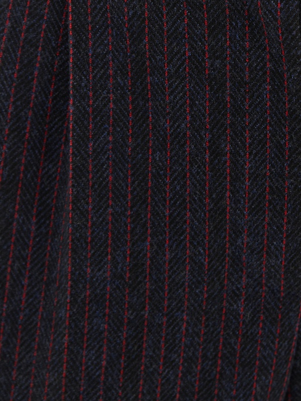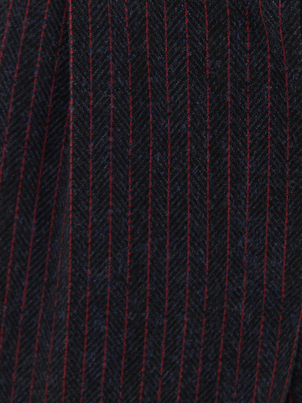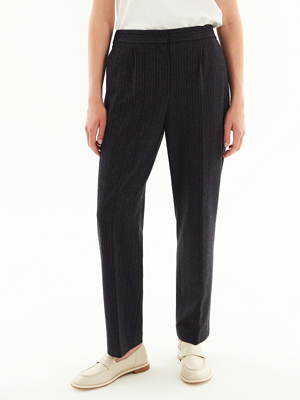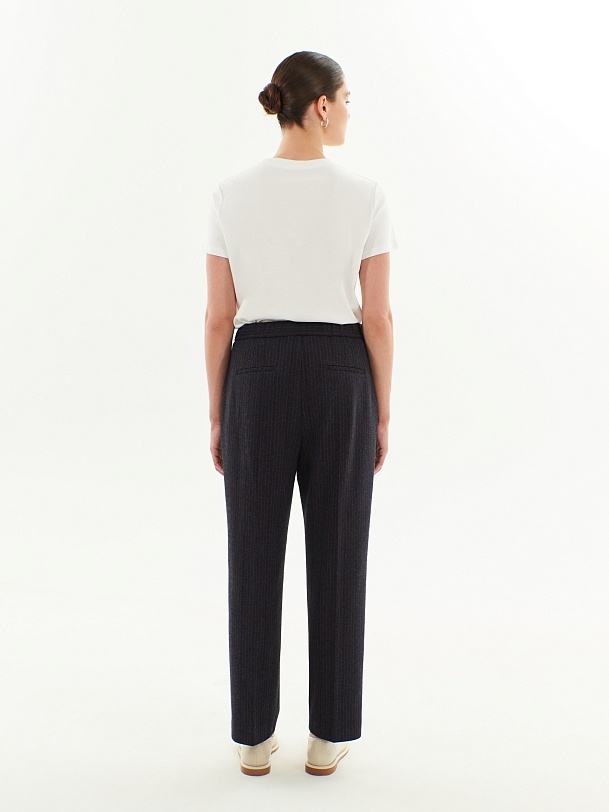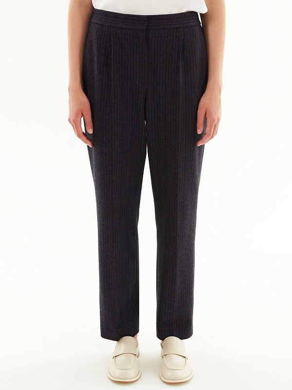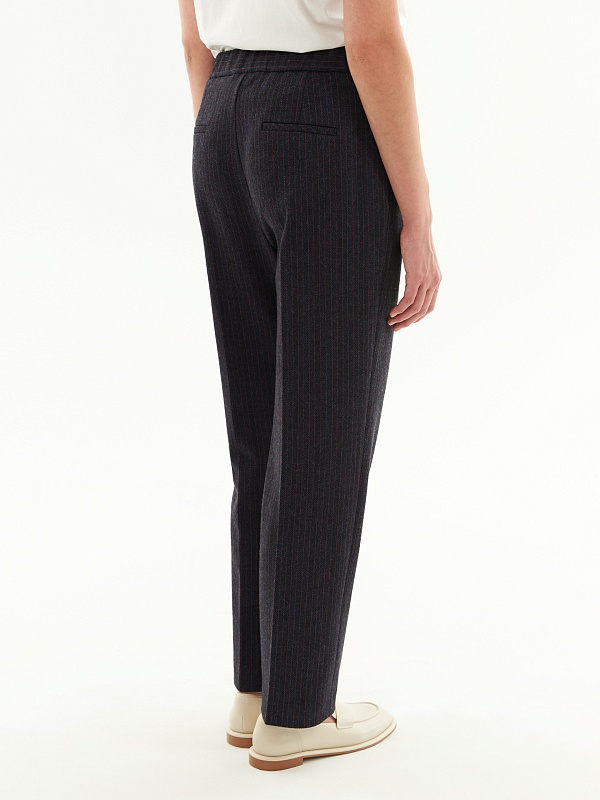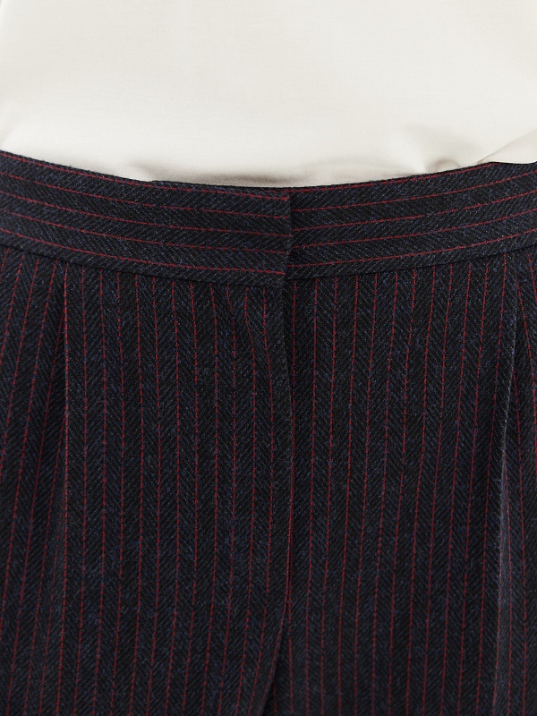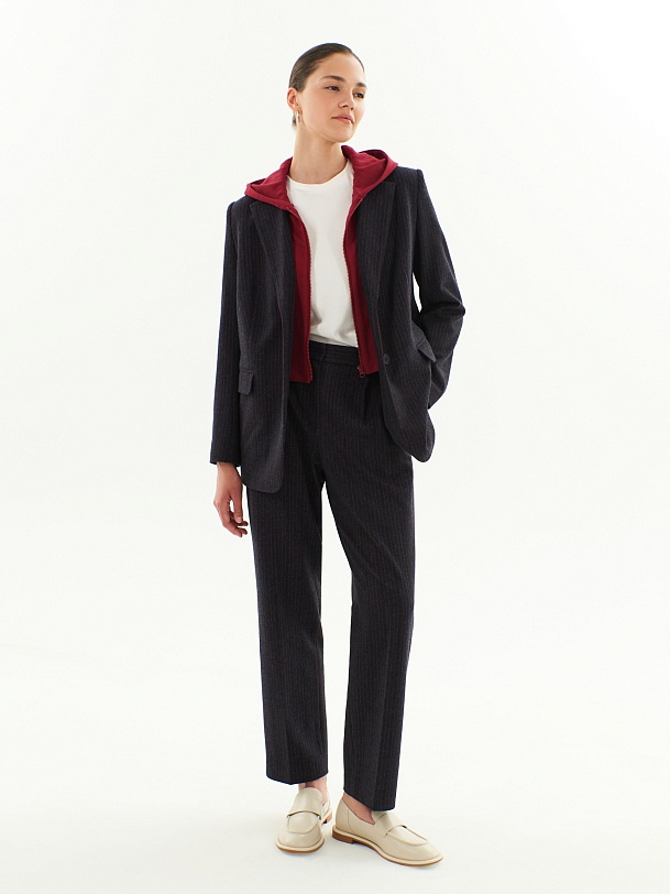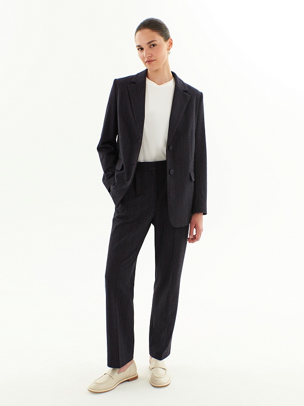 Трикотажные брюки прямого силуэта в тонкую бордовую полоску на синем фоне. По линии талии спереди мягкие складки, по спинке в поясе резинка, которая позволяет брюкам сидеть более комфортно. Прекрасно комбинируется с жакетом из этой же капсулы.