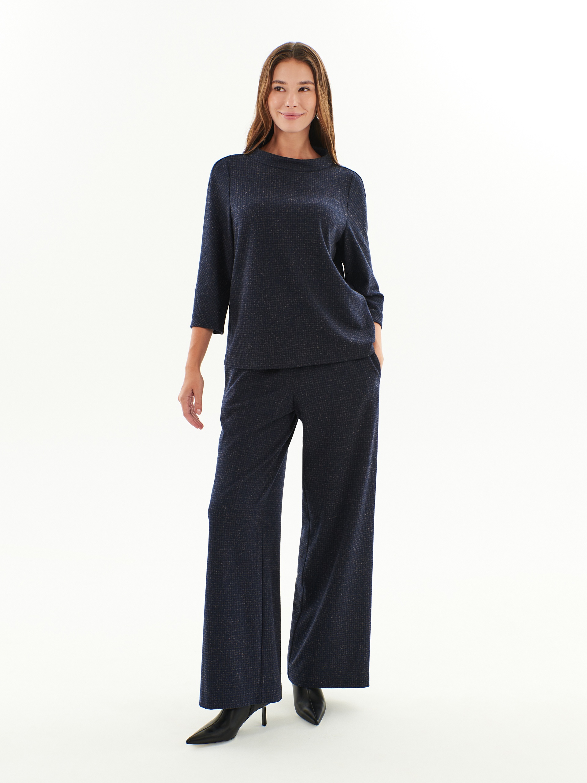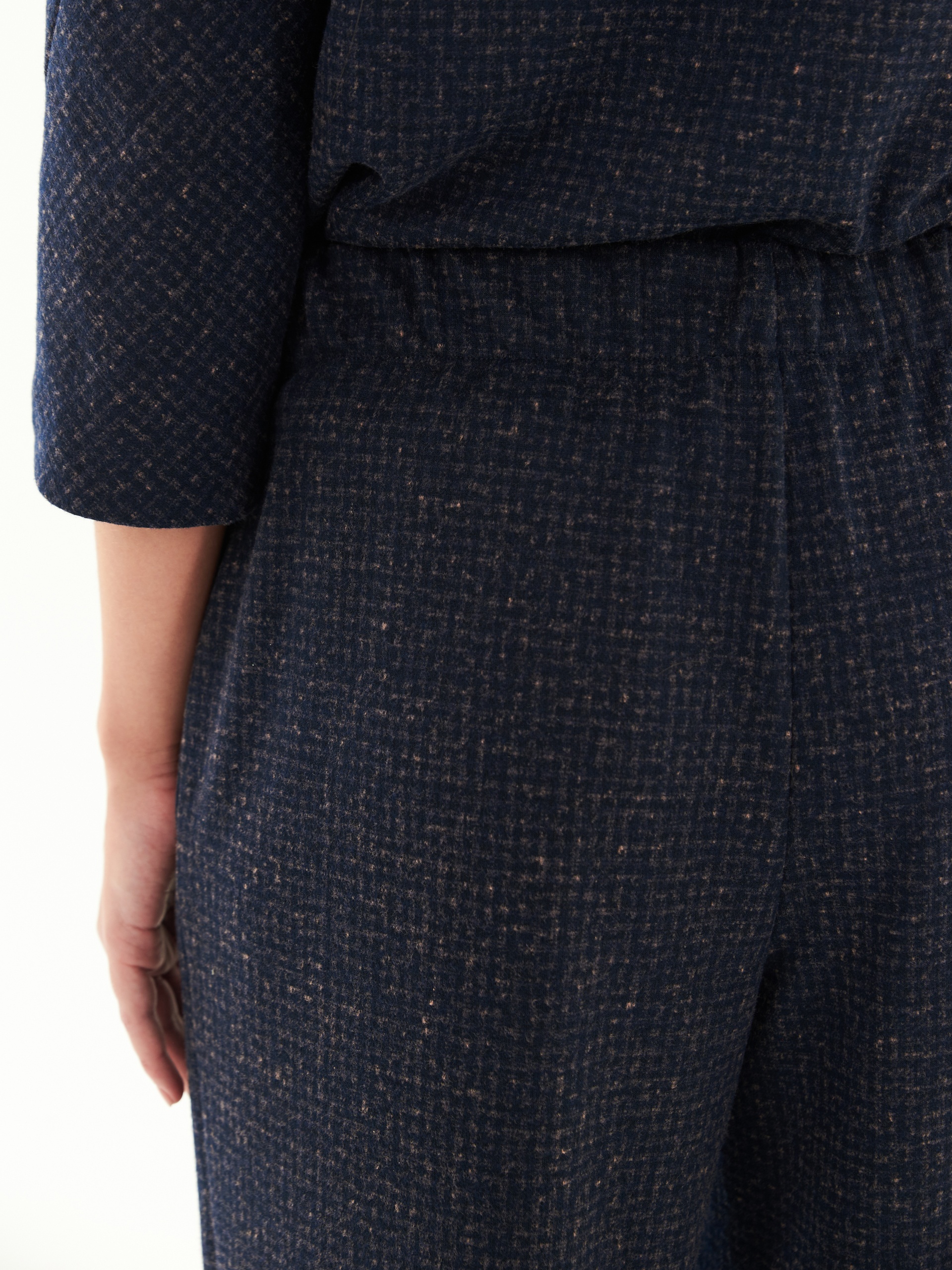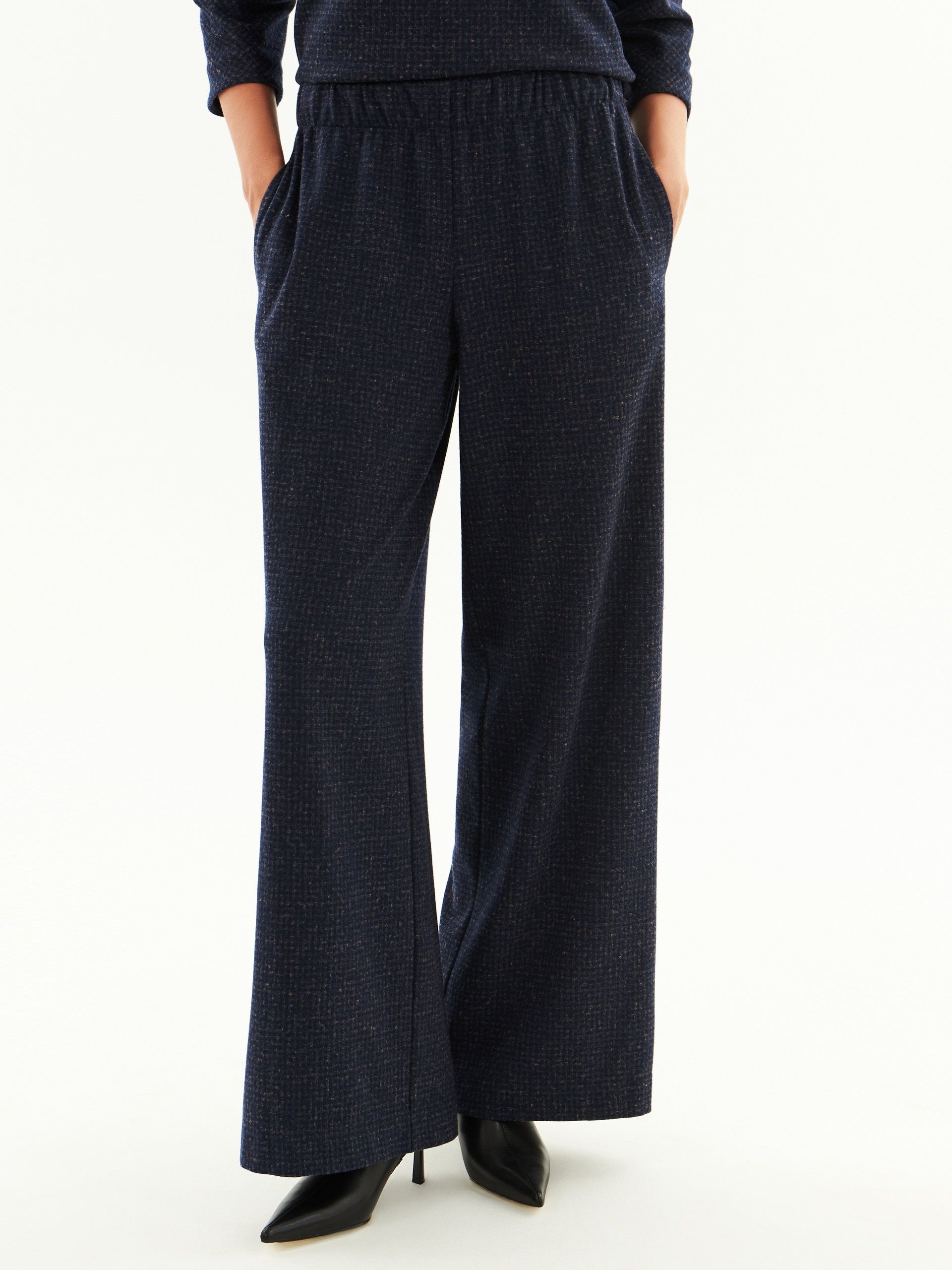 Широкие и комфортные брюки из жаккардового трикотажа с поясом на резинке. Комплектуйте с блузой из той же ткани из нашей коллекции или сочетайте с кэжуальными верхами.