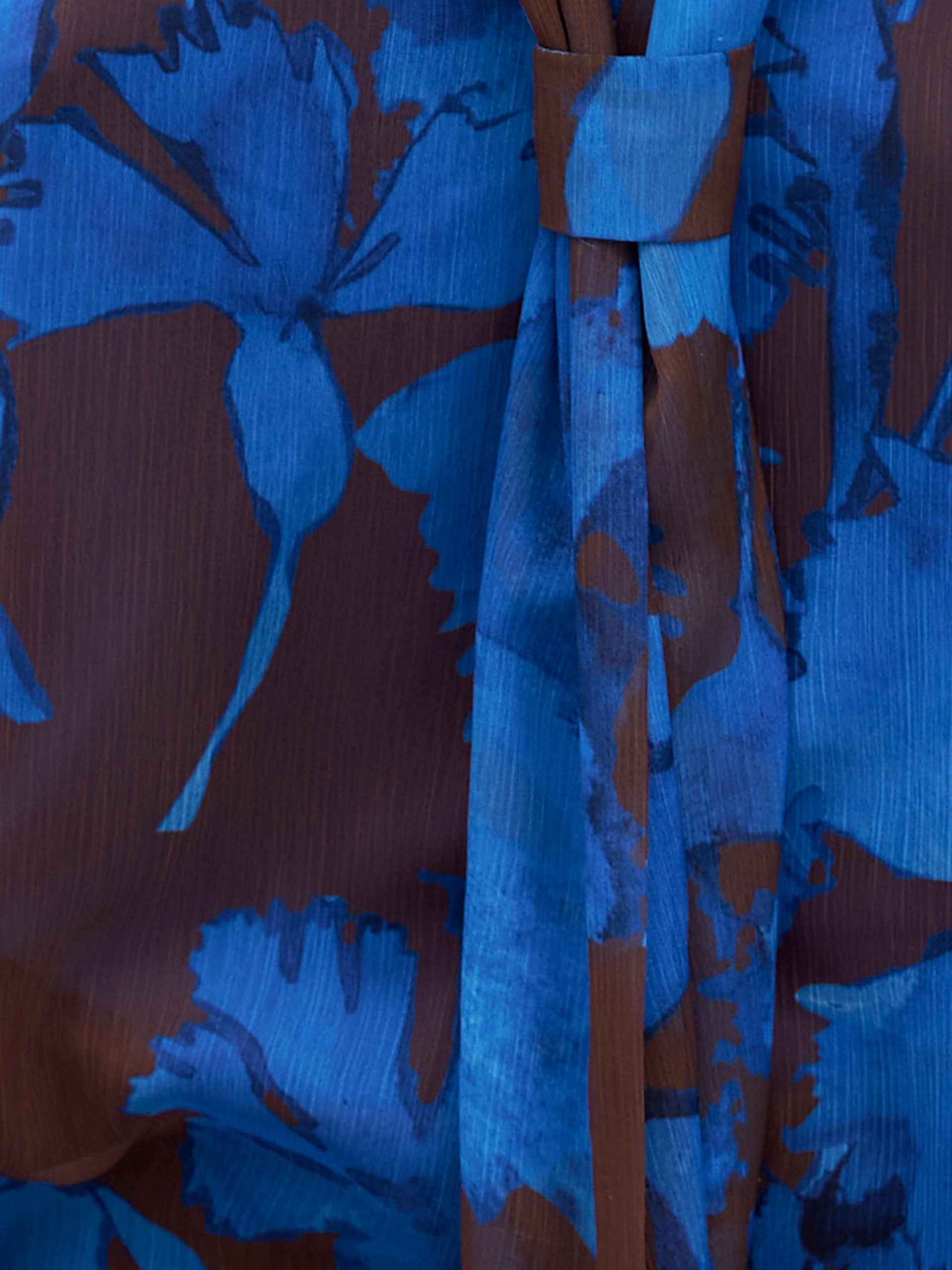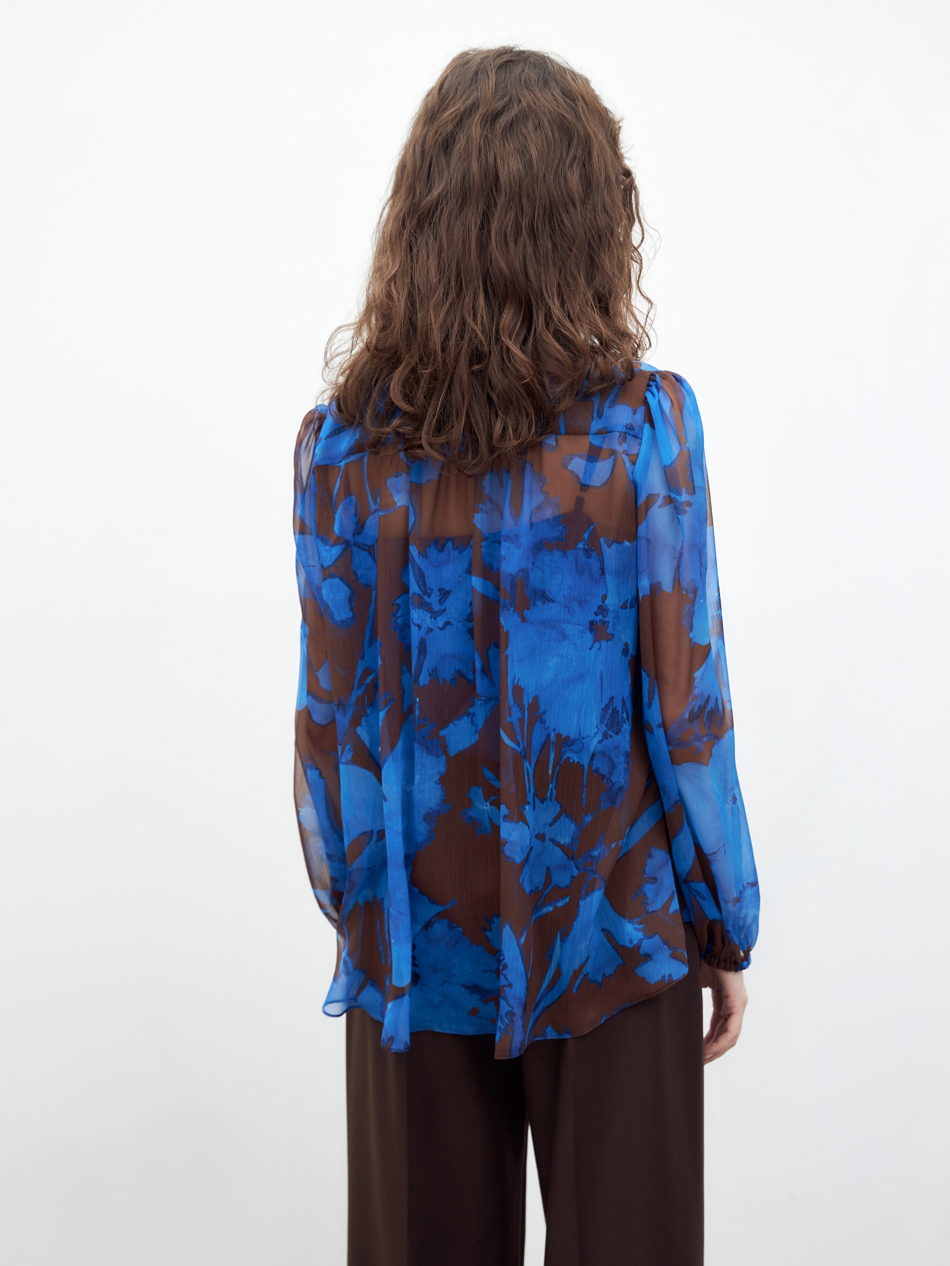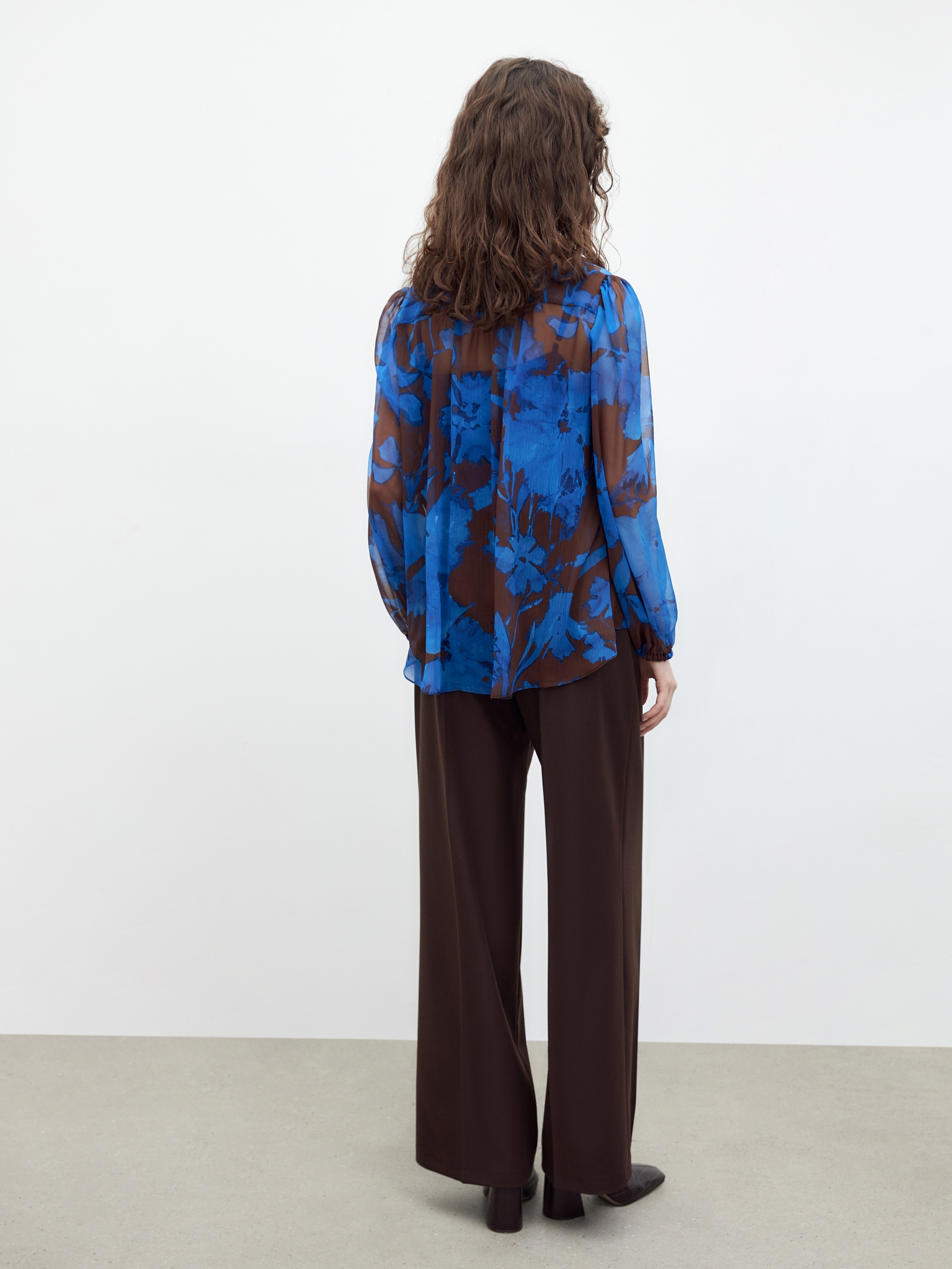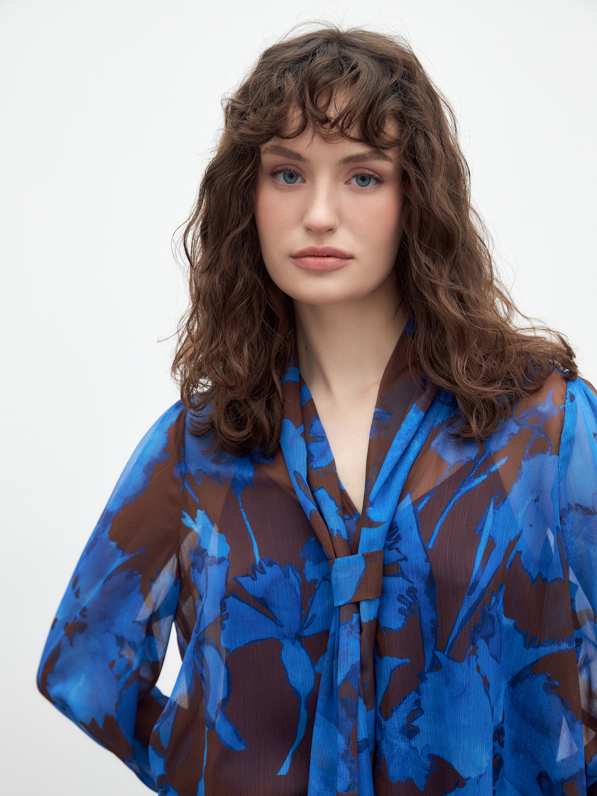 Женственная блуза прямого свободного силуэта из плательной ткани в цветочном принте, с воротником-стойка, переходящим в галстук, и втачным рукавом полной длины на резинке. В комплект входит нижний топ на бретелях из подкладочной ткани.