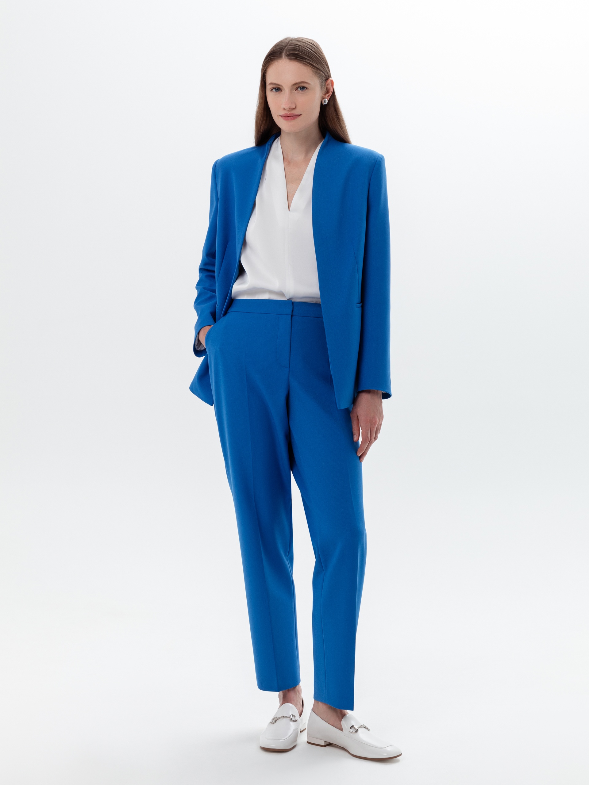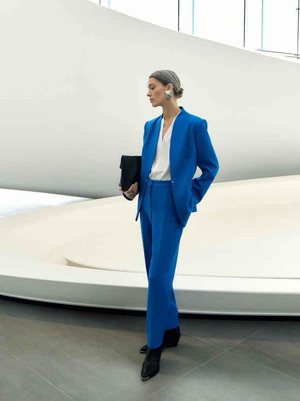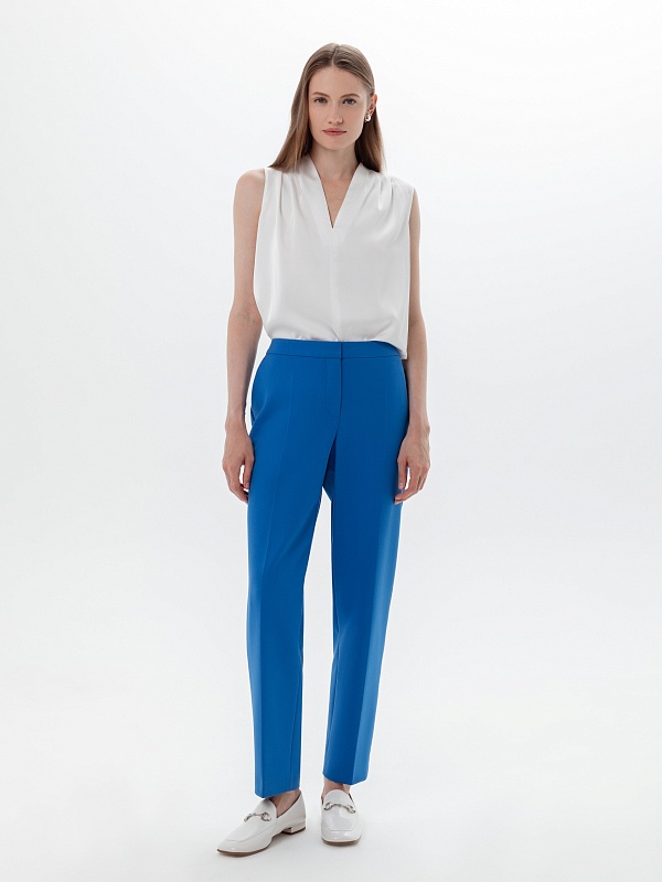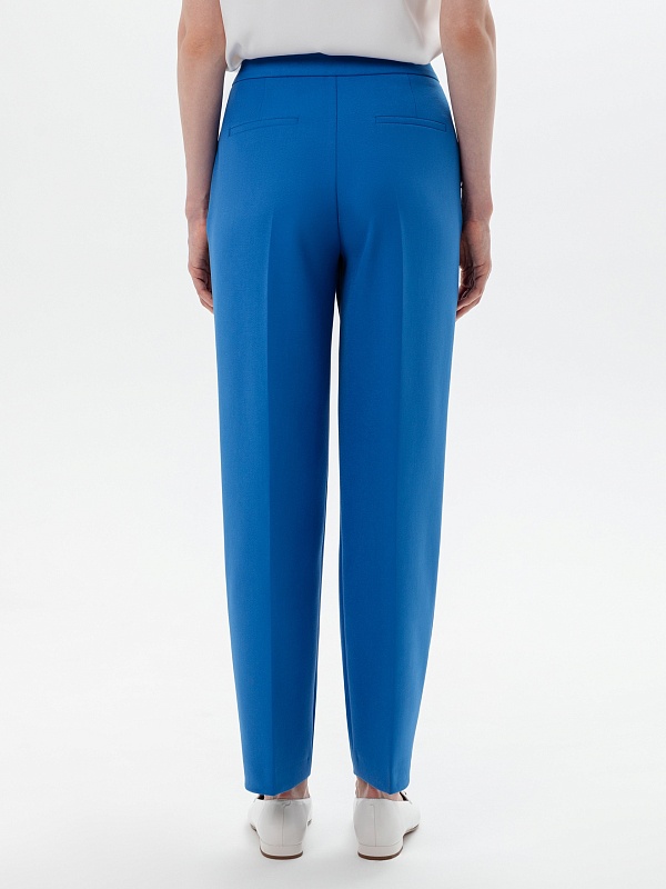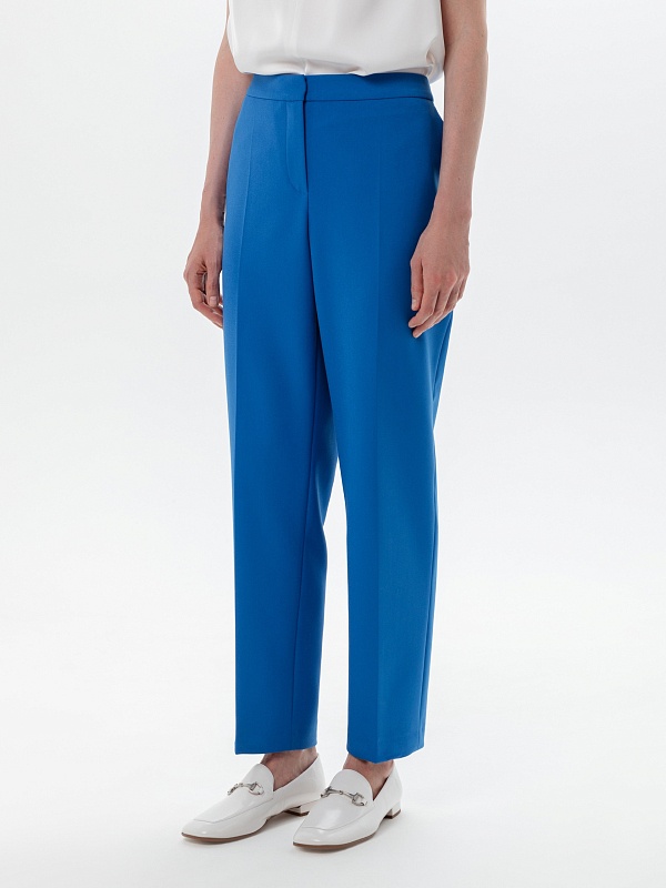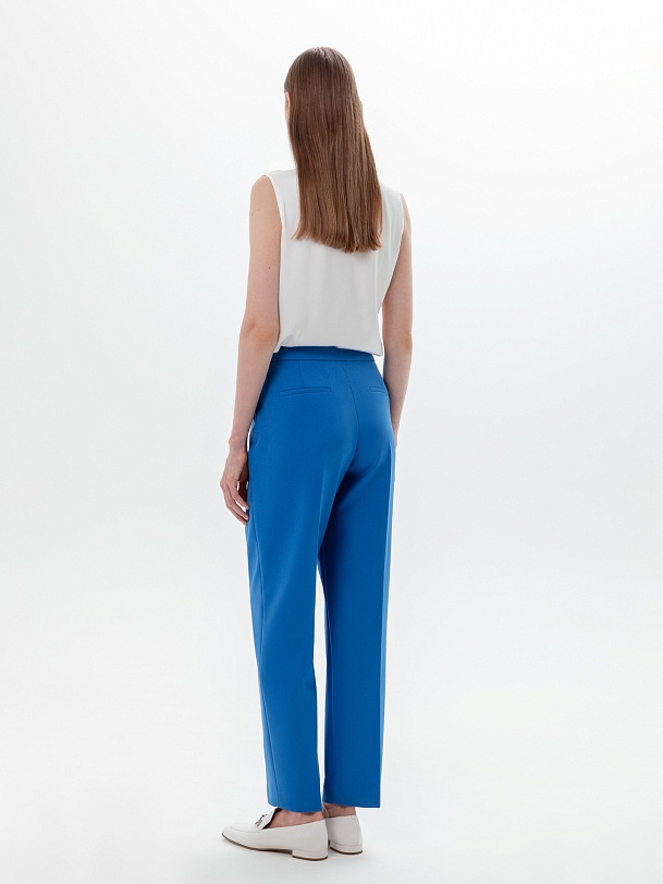 Зауженные к низу брюки со стрелками на притачном поясе из костюмной ткани в ярко-синем цвете. Функциональные кармананы в боковых швах и прорезные на спинке.