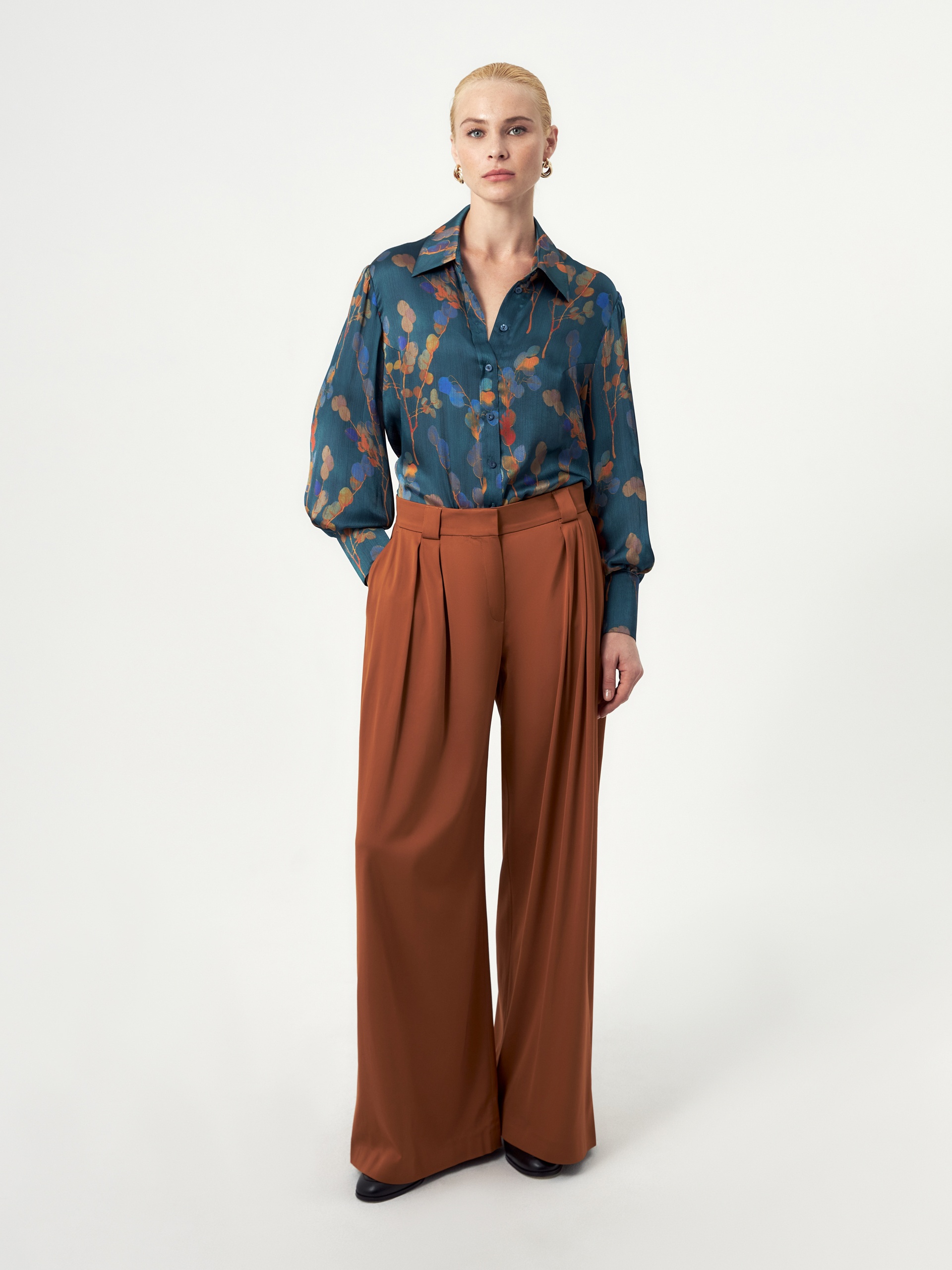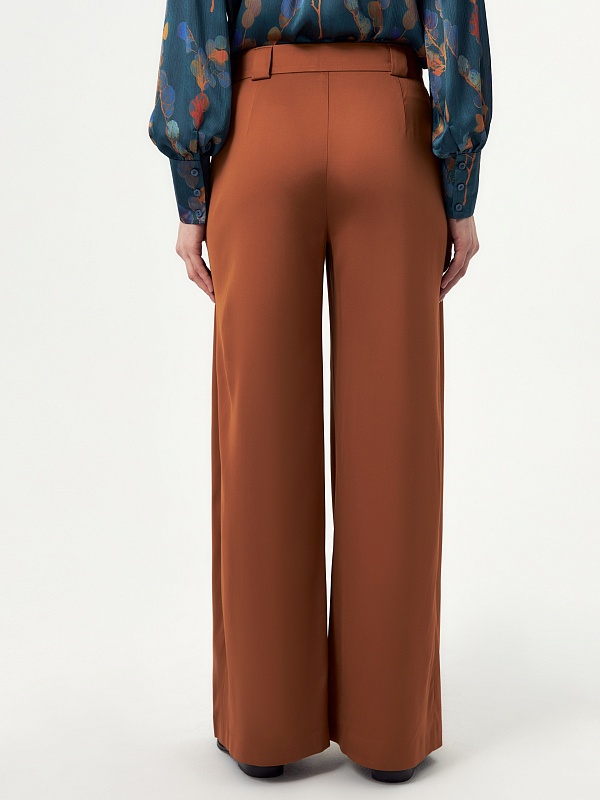 Широкие брюки со складками на приточном поясе с широкими шлевками. Брюки выполнены из вискозной костюмной ткани в цвете ириска. Имеют два функциональных кармана по бокам и два прорезных кармана сзади.