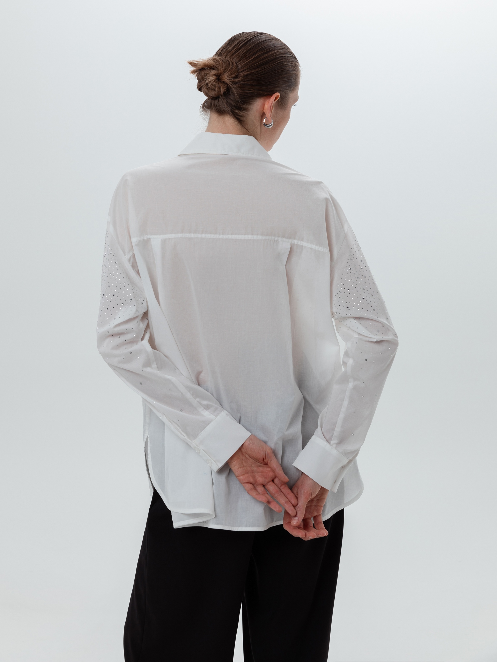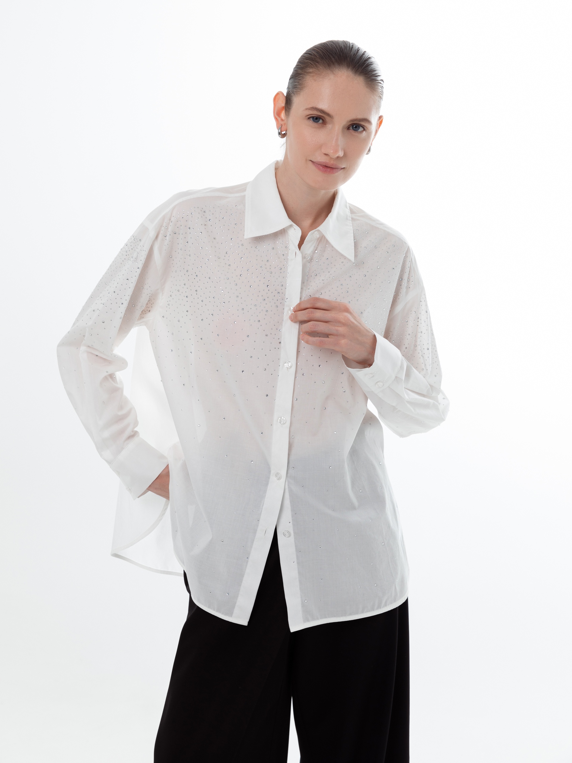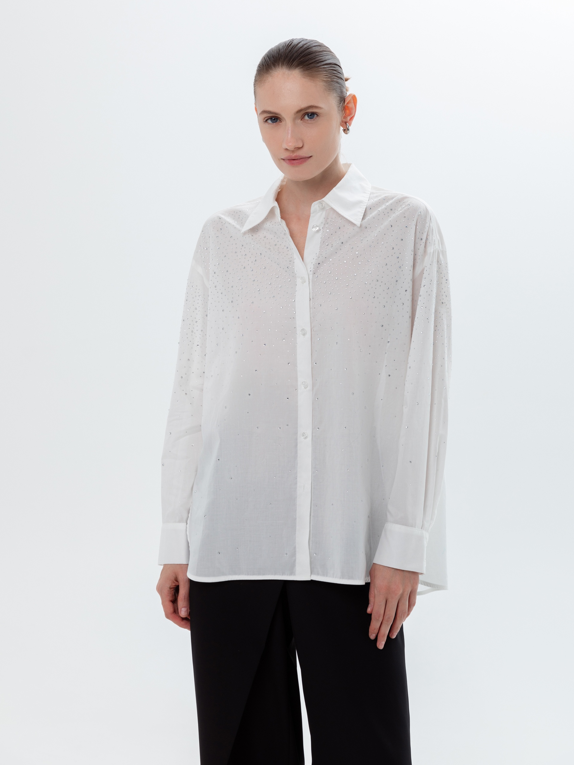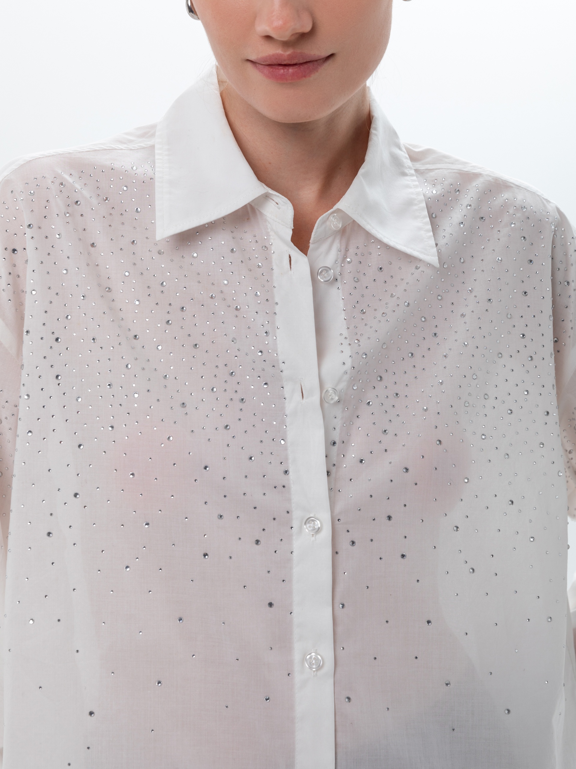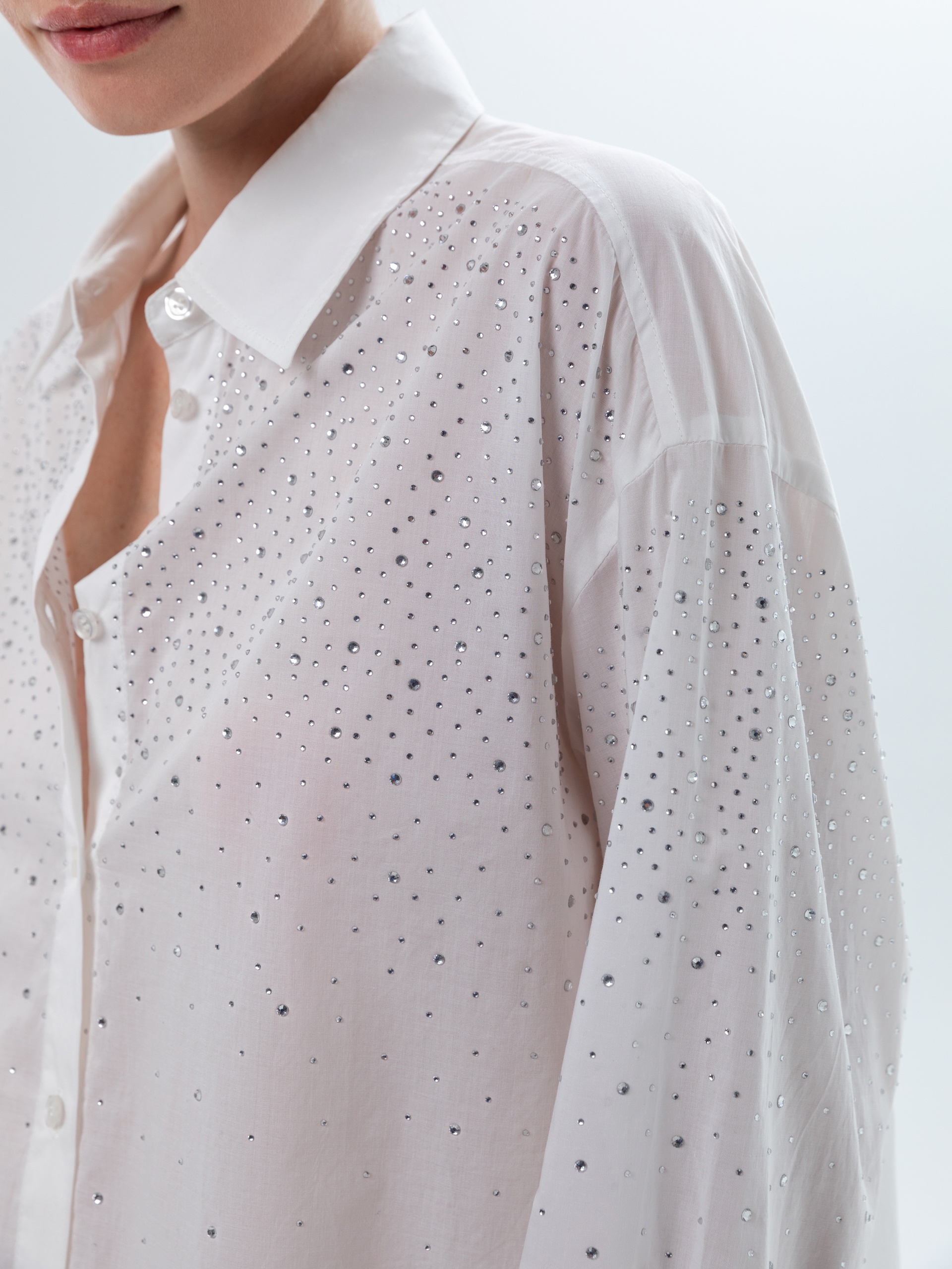 Свободная блуза из тонкого хлопка белого цвета с классическим отложным воротником и спущенной линией плеча. Классический рукав на манжете со складками. Блуза усыпана разного размера прозрачными стразами.