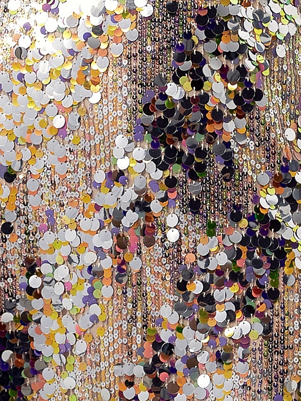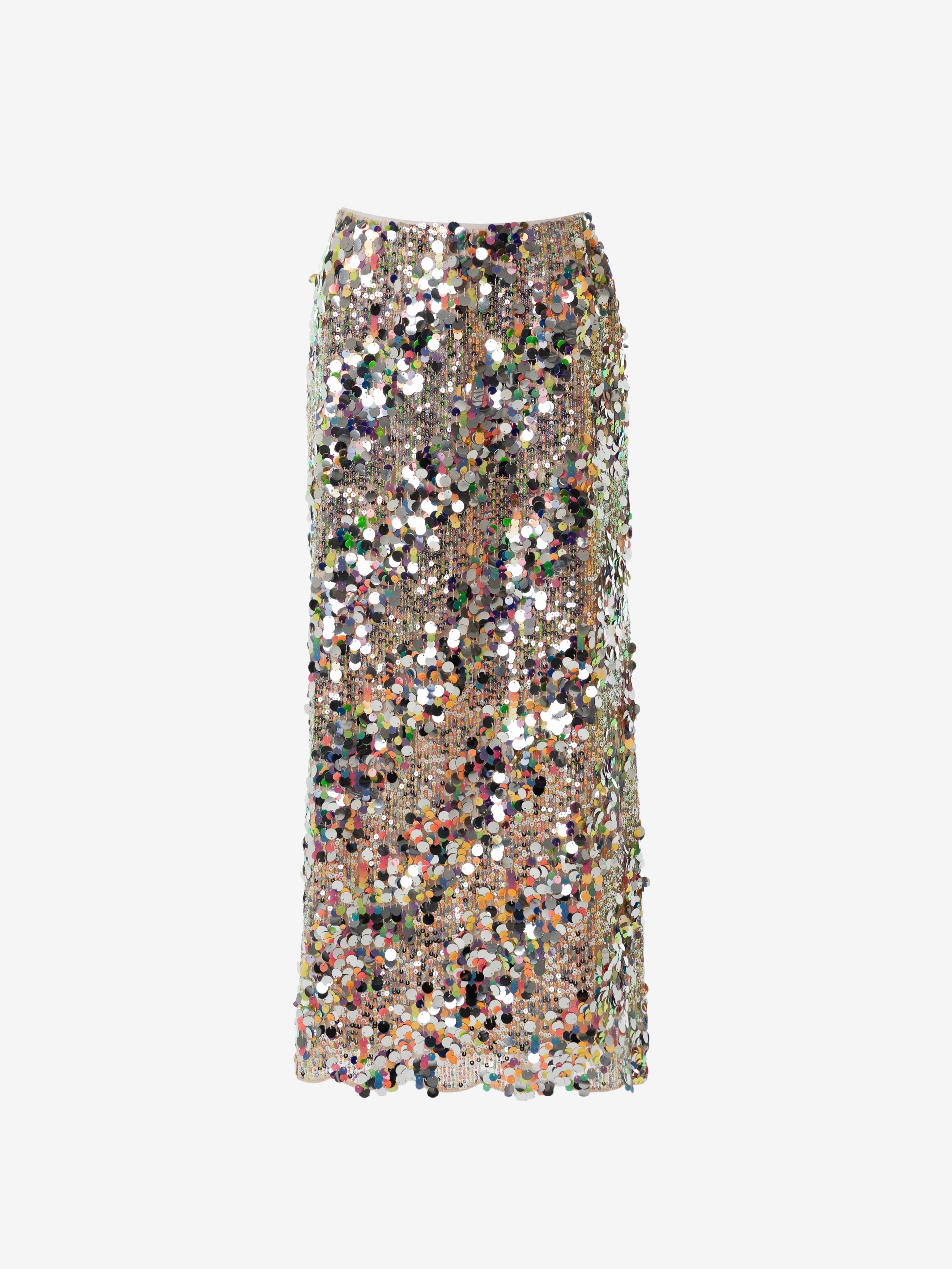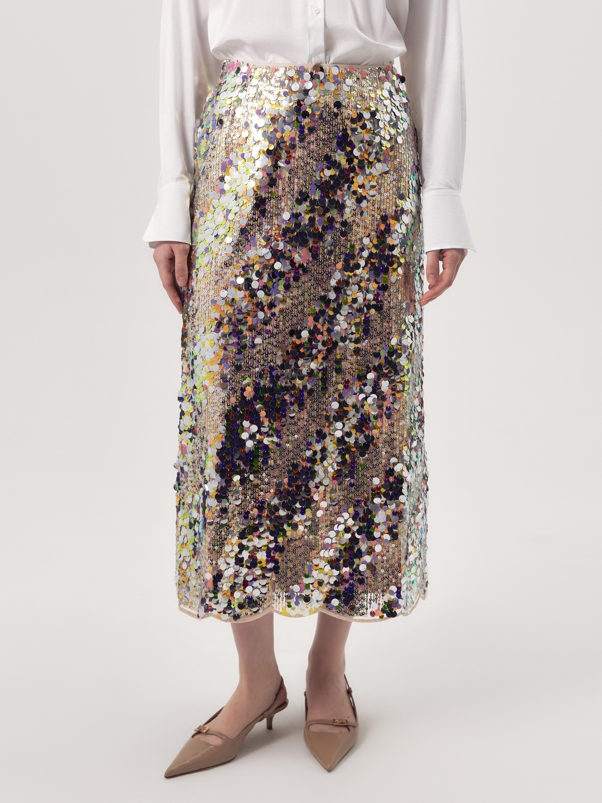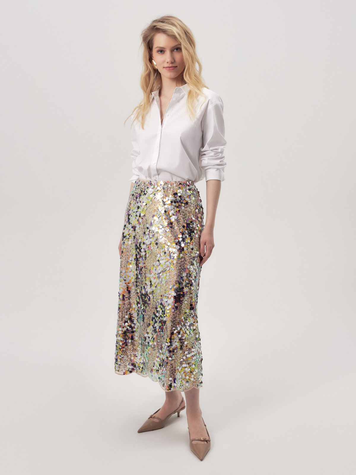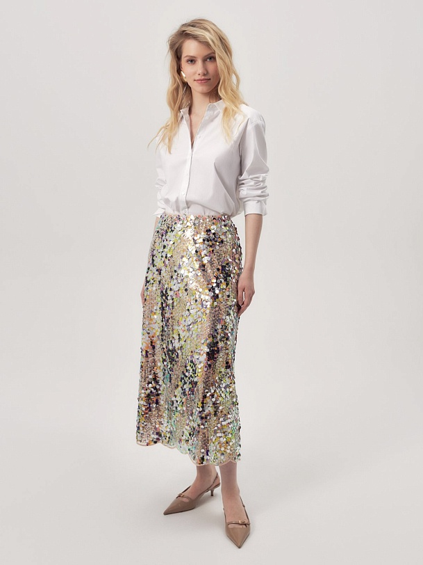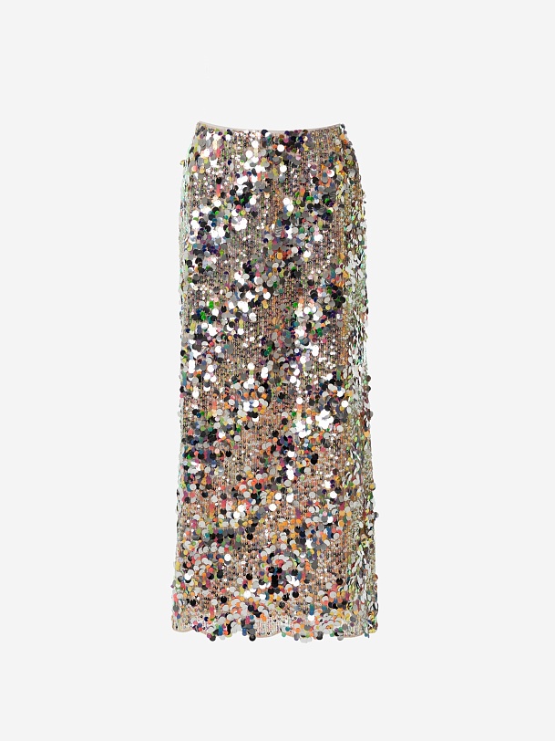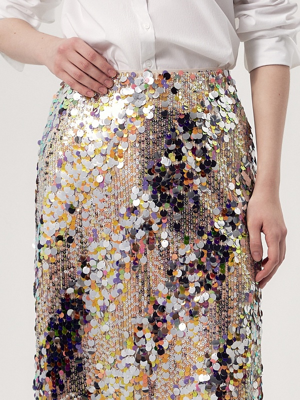 Юбка расклешённая длины миди, с пайетками, на талии фиксируется резинкой. Изделие покрыто мерцающими пайетками разных цветов и размеров. Эта роскошная юбка идеальна для вечернего выхода или особого случая. Сочетайте с блузкой и обувью на каблуках, чтобы завершить образ. Также прекрасно комбинируется с белыми футболками и лонгсливами, тем самым образ становится более кэжуальным. В коллекции представлен топ из тех же пайеток для создания тотал лука.