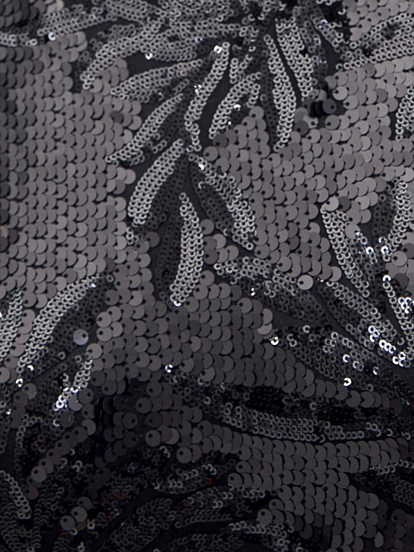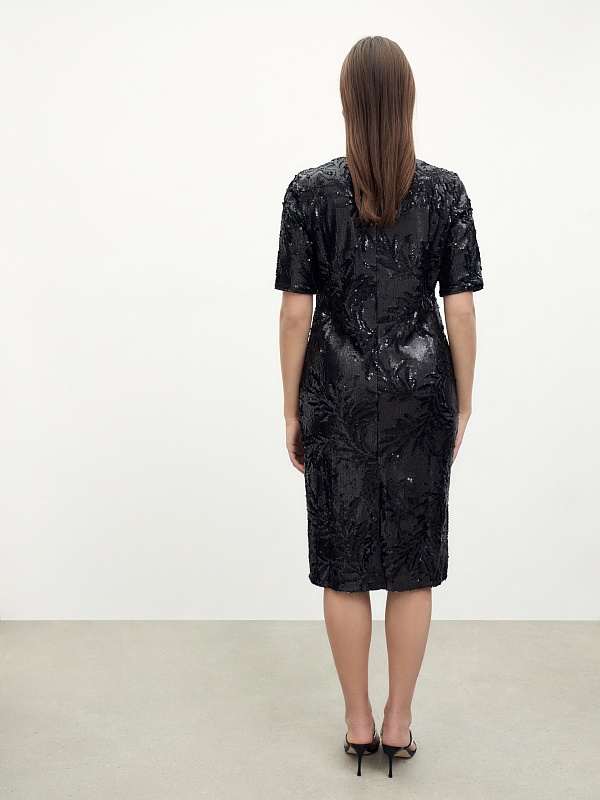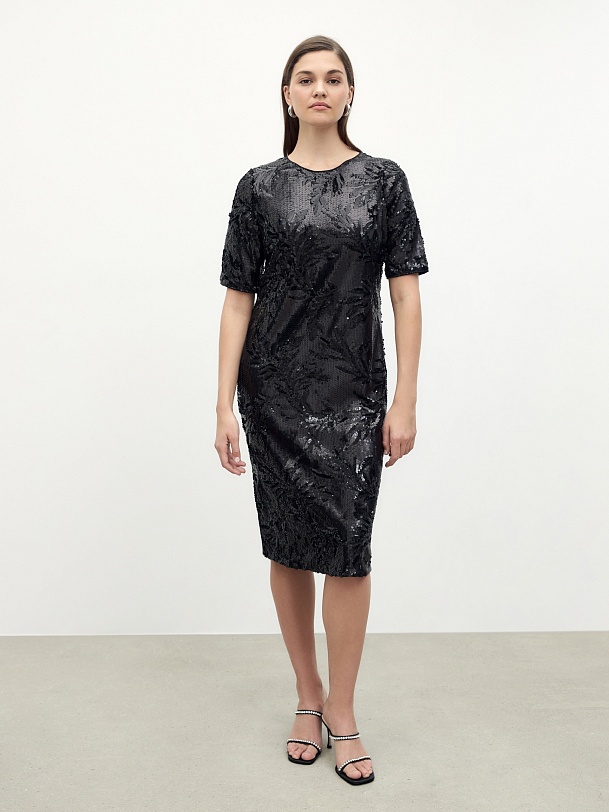 Элегантное платье миди из чёрных пайеток, выложенных растительным орнаментом. Длина рукава - выше локтя, сзади для удобства движения разрез. Это платье миди идеально подходит для любого торжественного мероприятия: от свадьбы и выпускного вечера до коктейльных вечеринок.