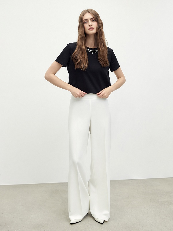 Футболка прямого силуэта из хлопка. Топ декорирован россыпью страз вдоль линии горловины.
