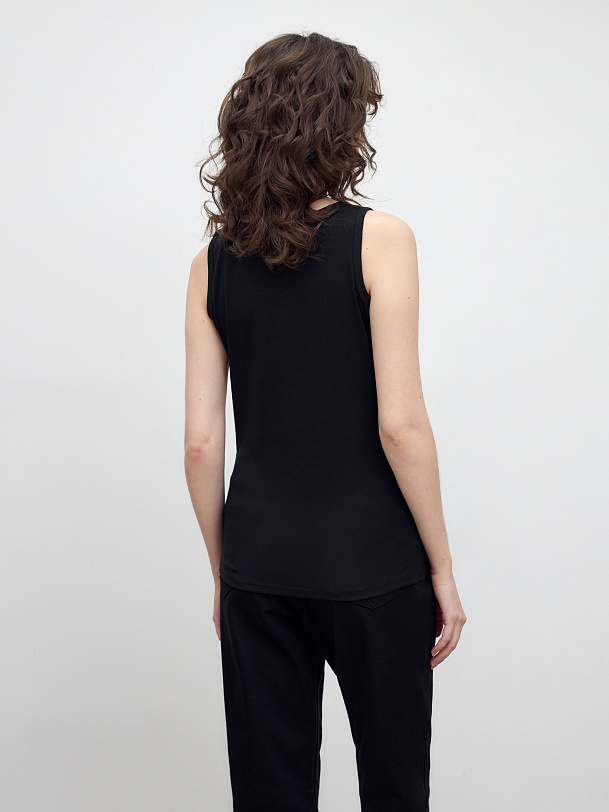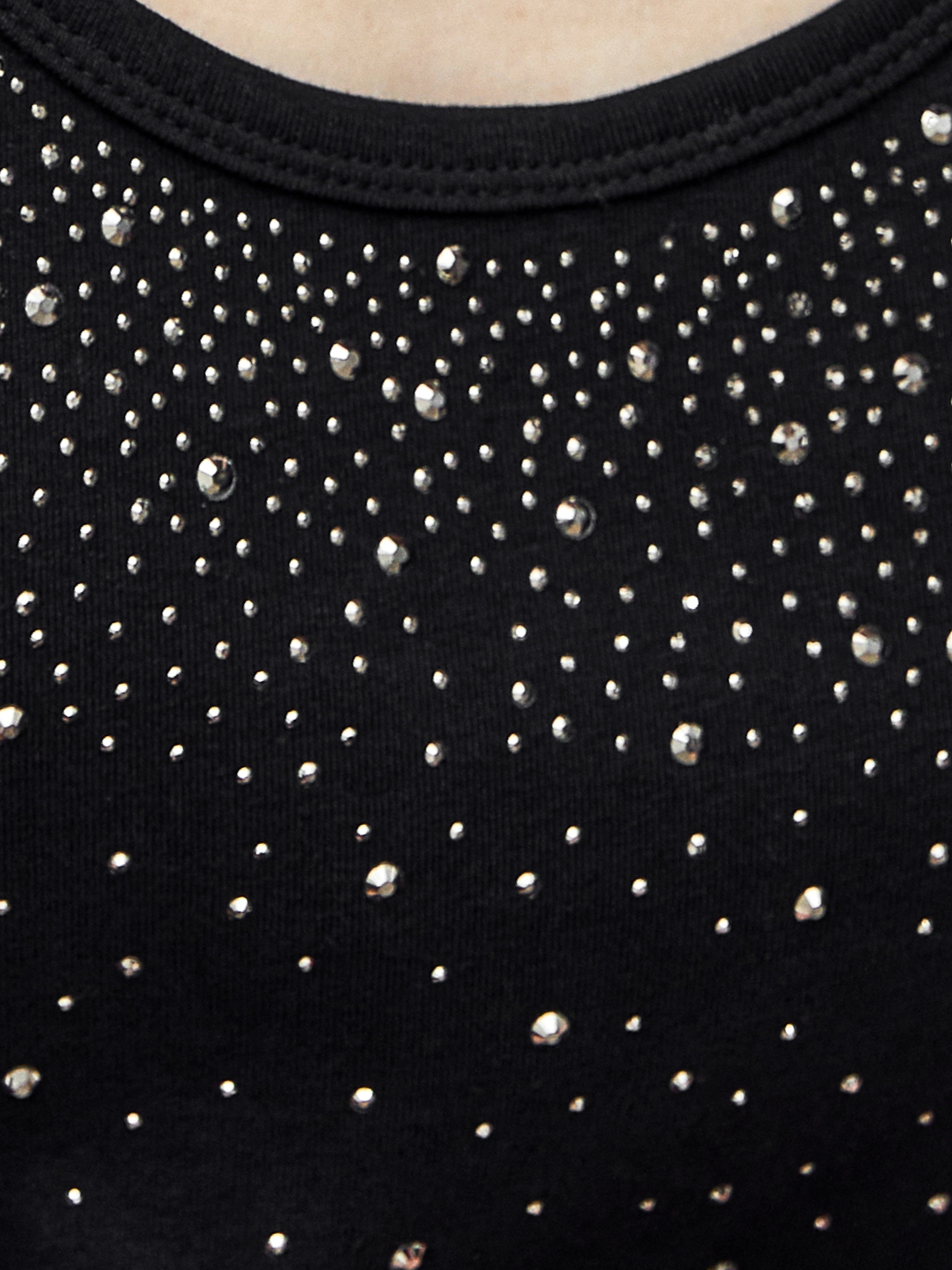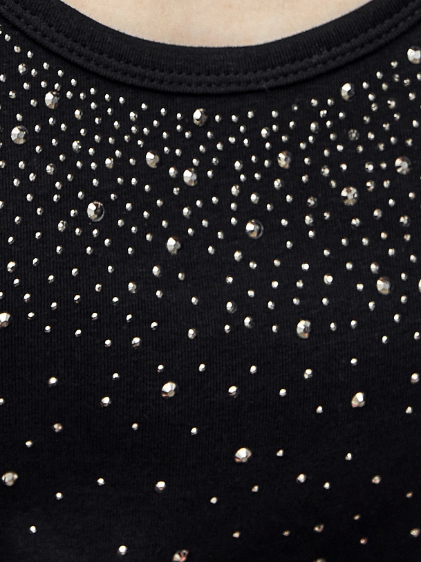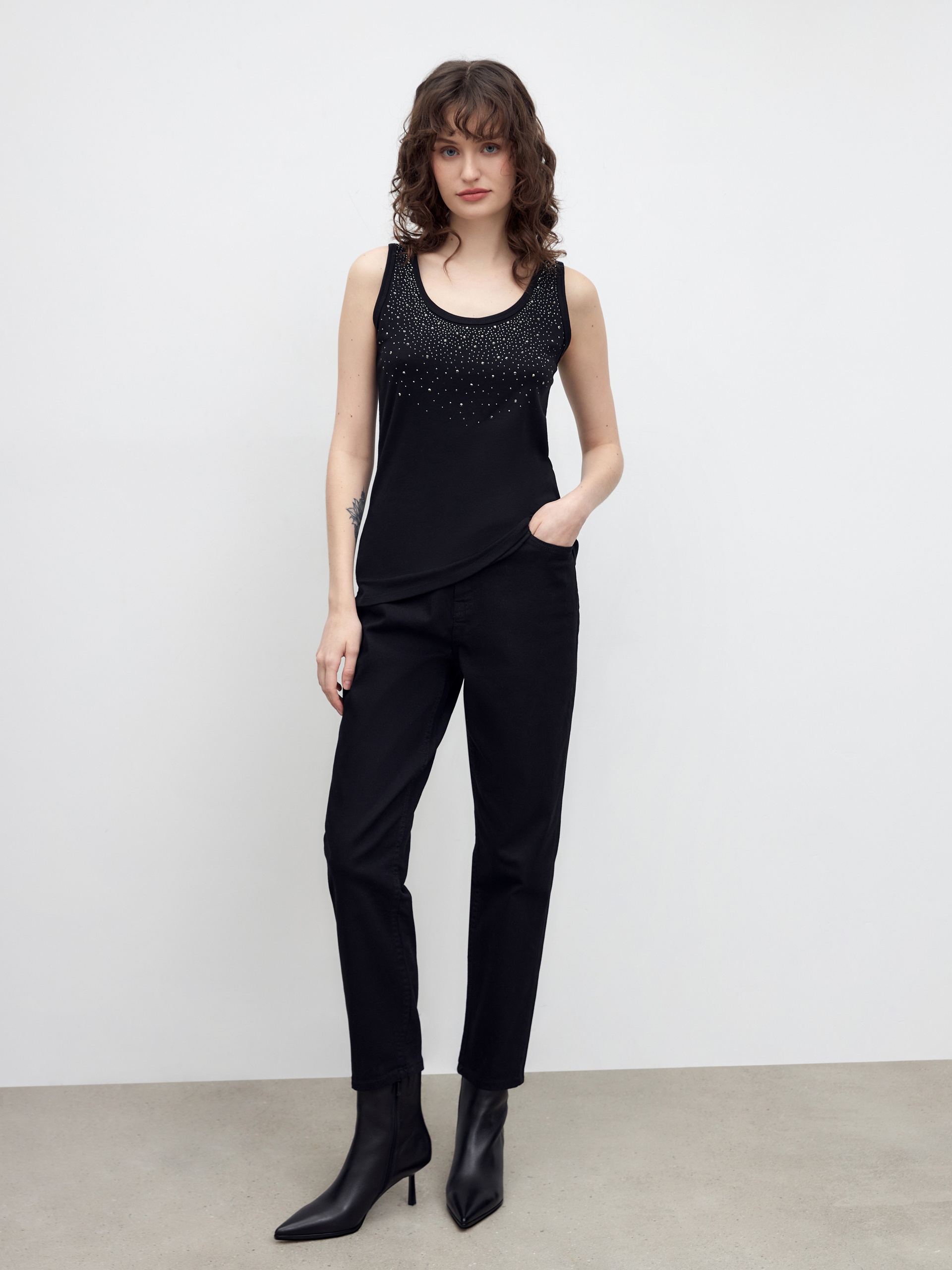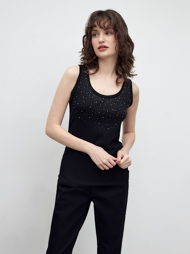 Романтичный и праздничный топ из смесового хлопка. Майка декорирована россыпью страз вдоль линии горловины. Прекрасно сочетается как с классическими костюмами, так и с кэжуальными джинсами.