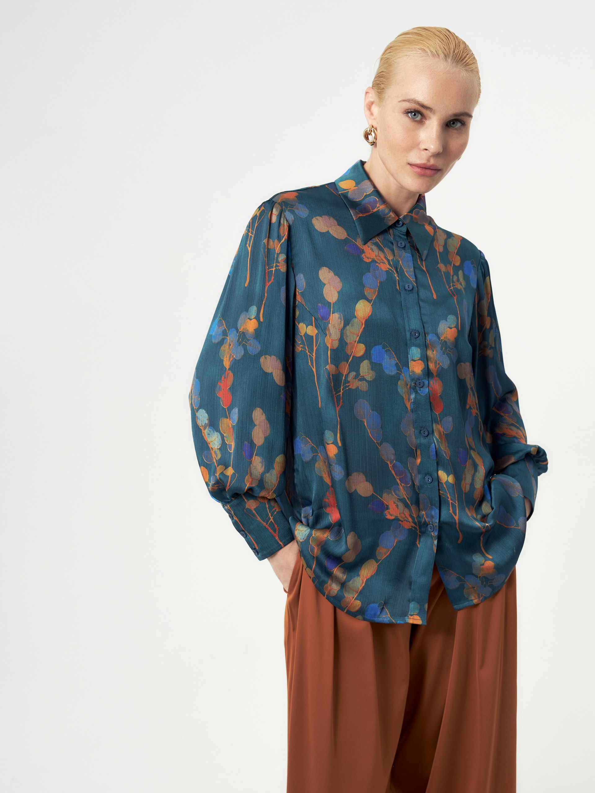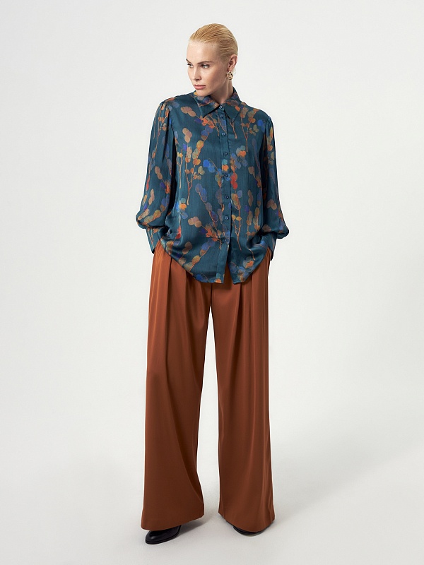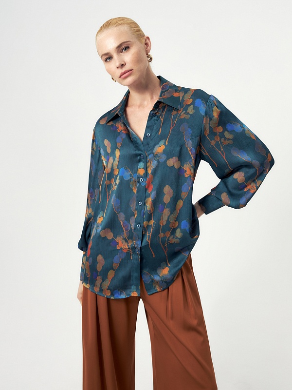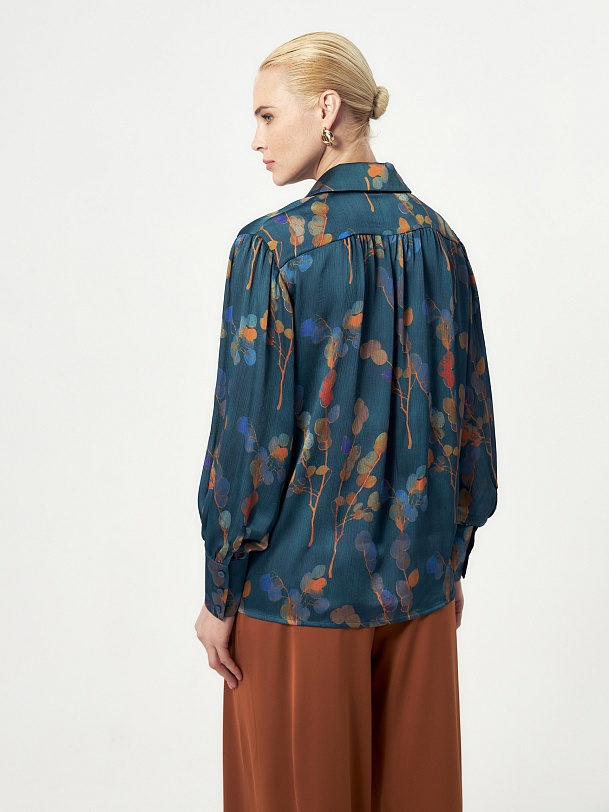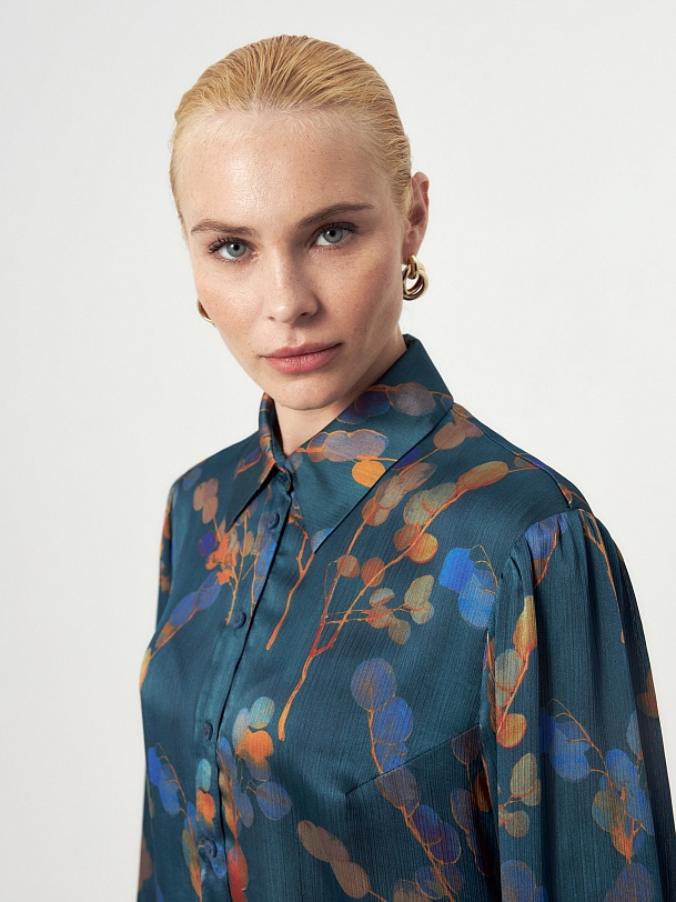 Романтичная прямая блуза с отложным воротником. Блуза выполнена из принтованной плательной ткани.