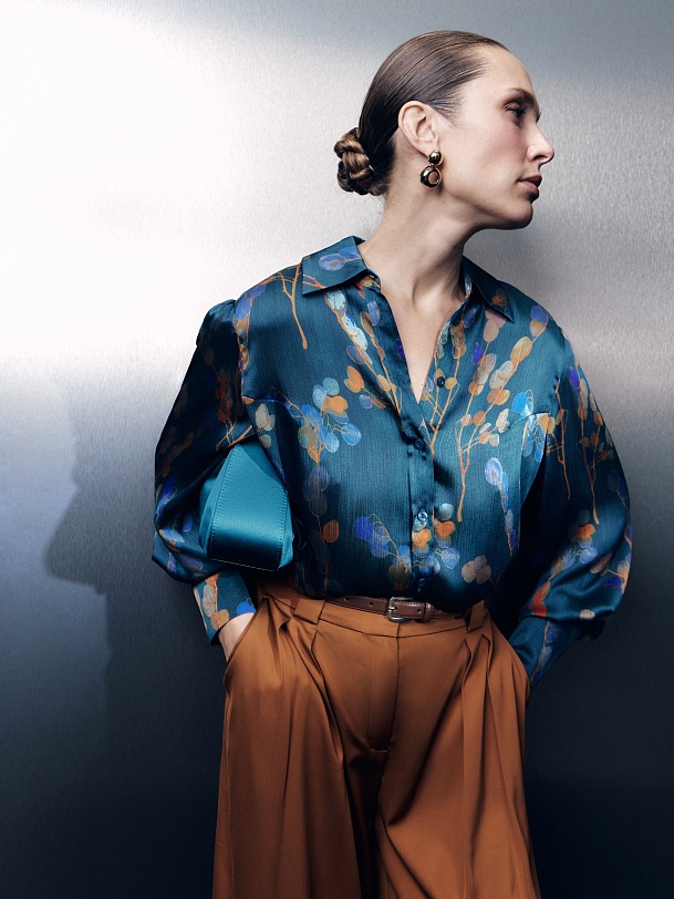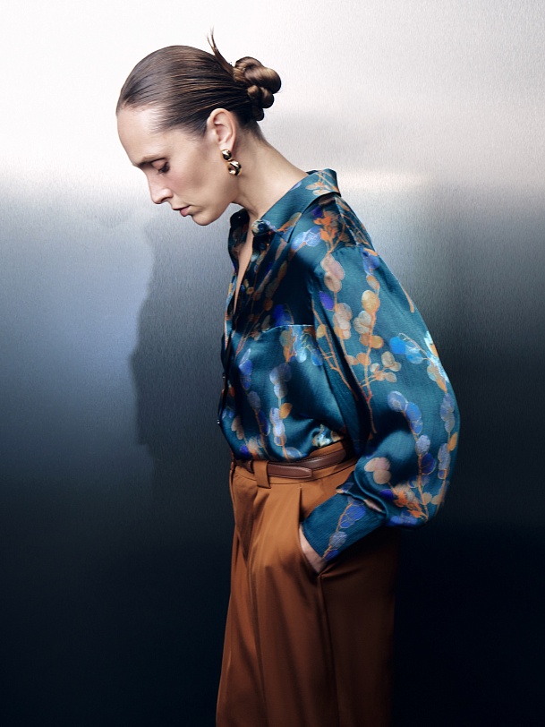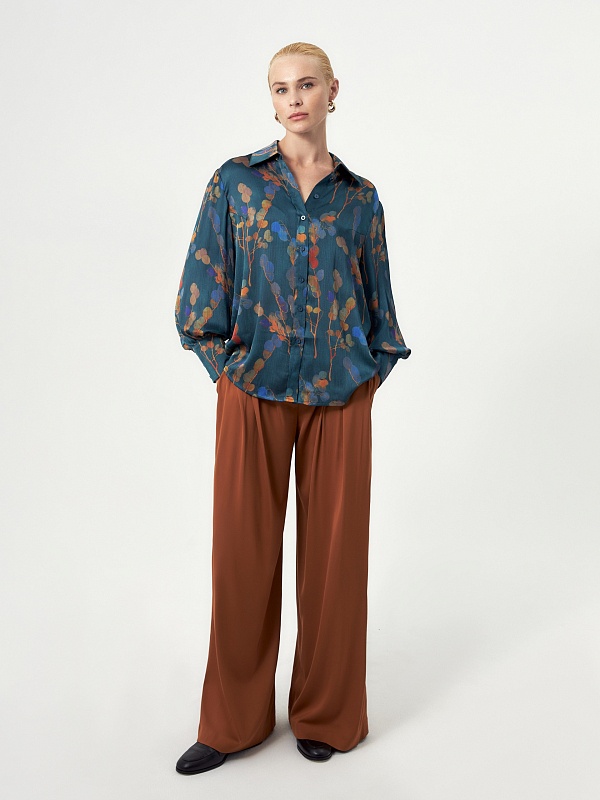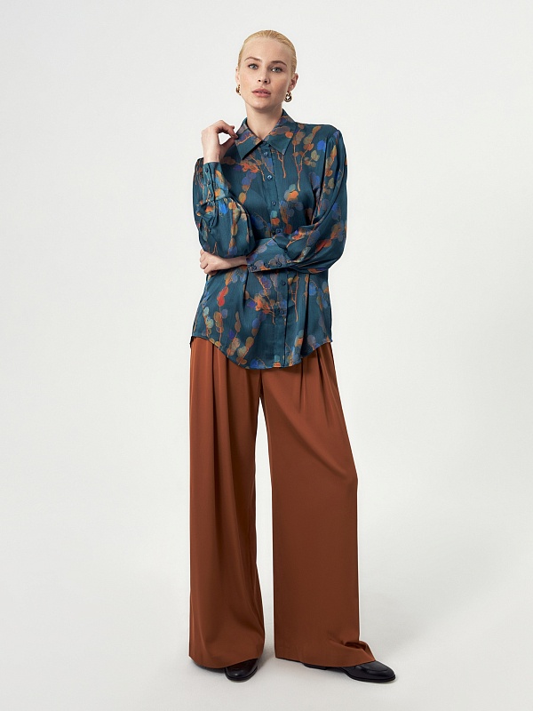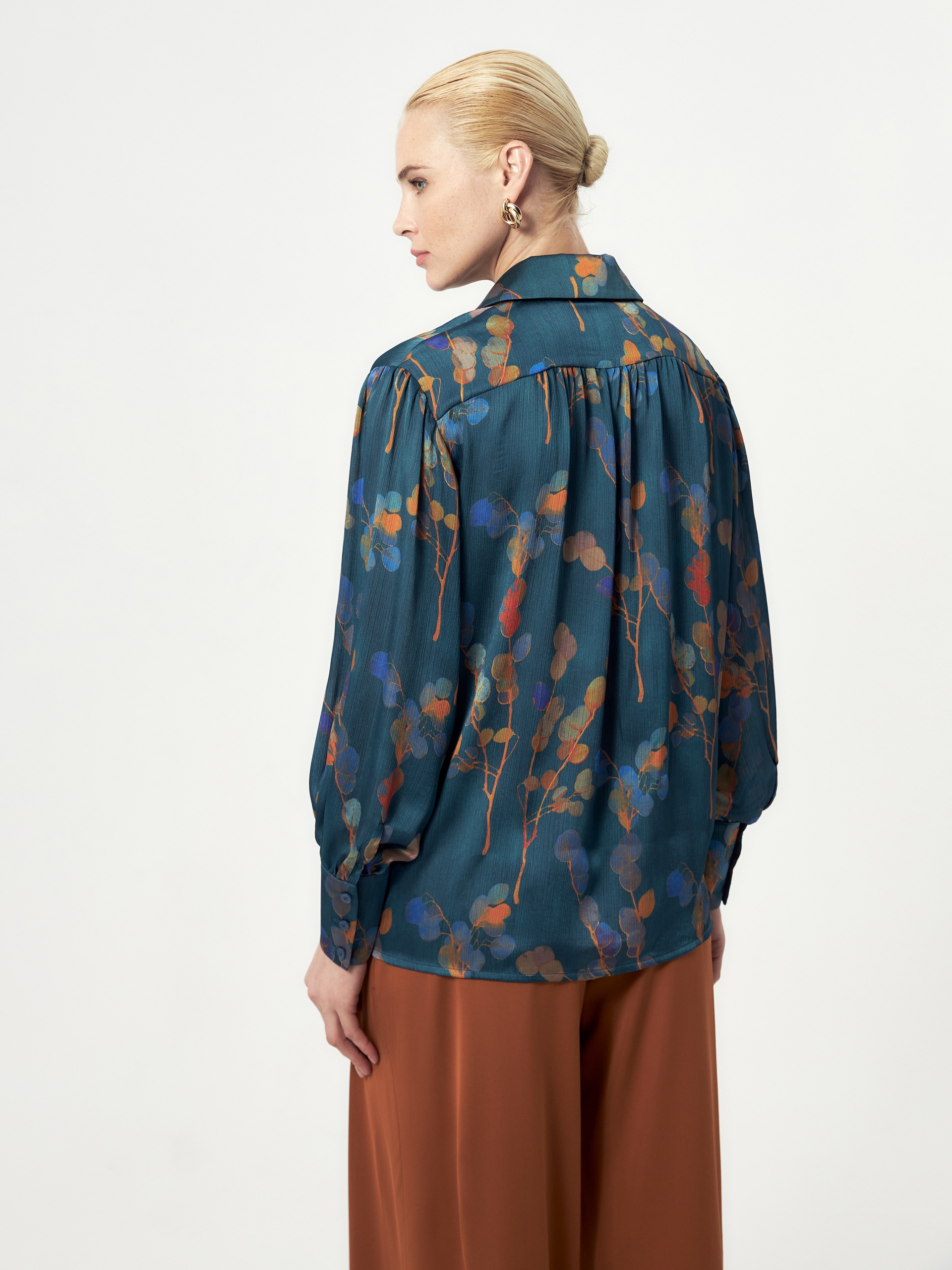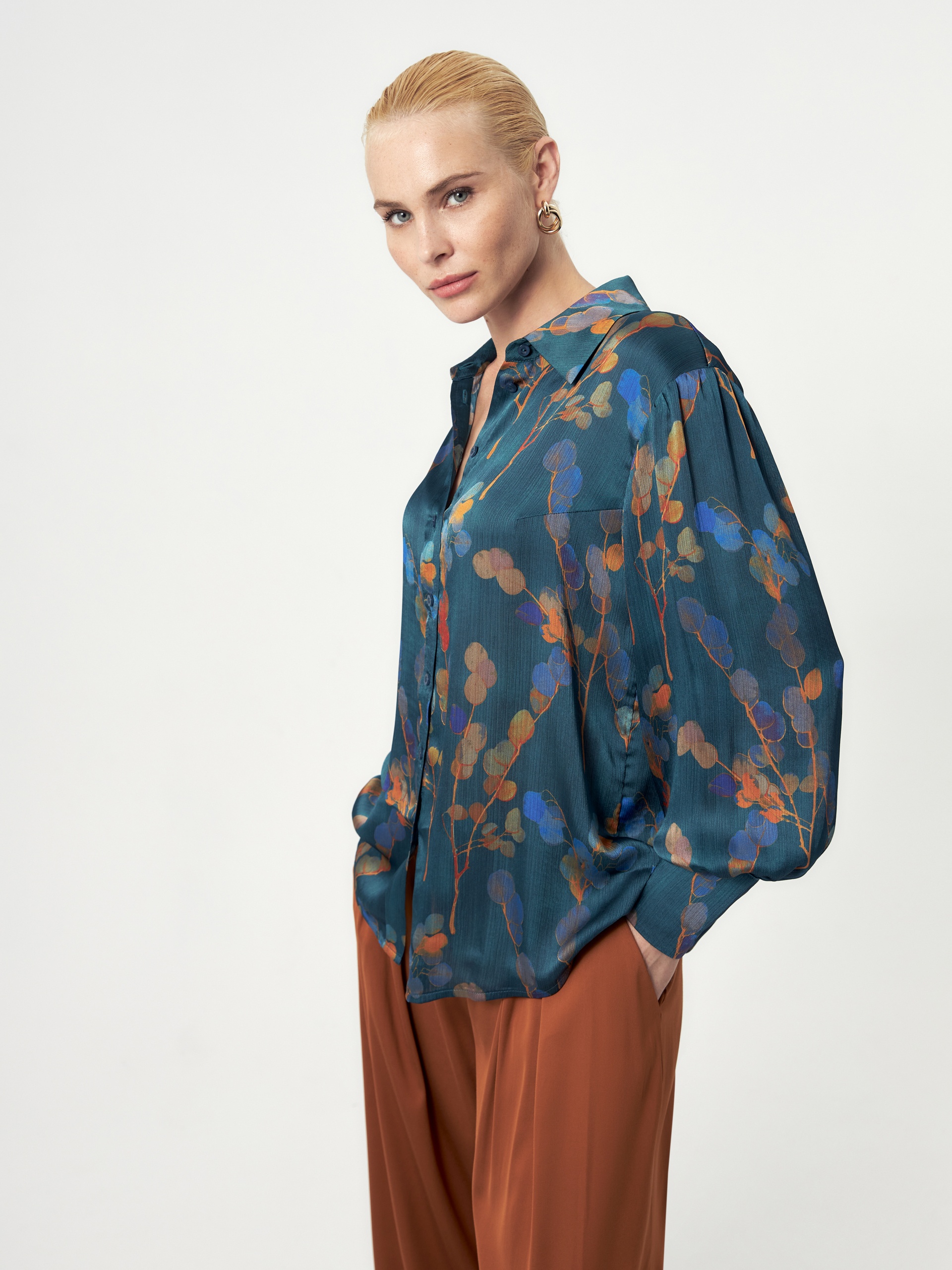Романтичная прямая блуза с отложным воротником. Блуза выполнена из принтованной плательной ткани.