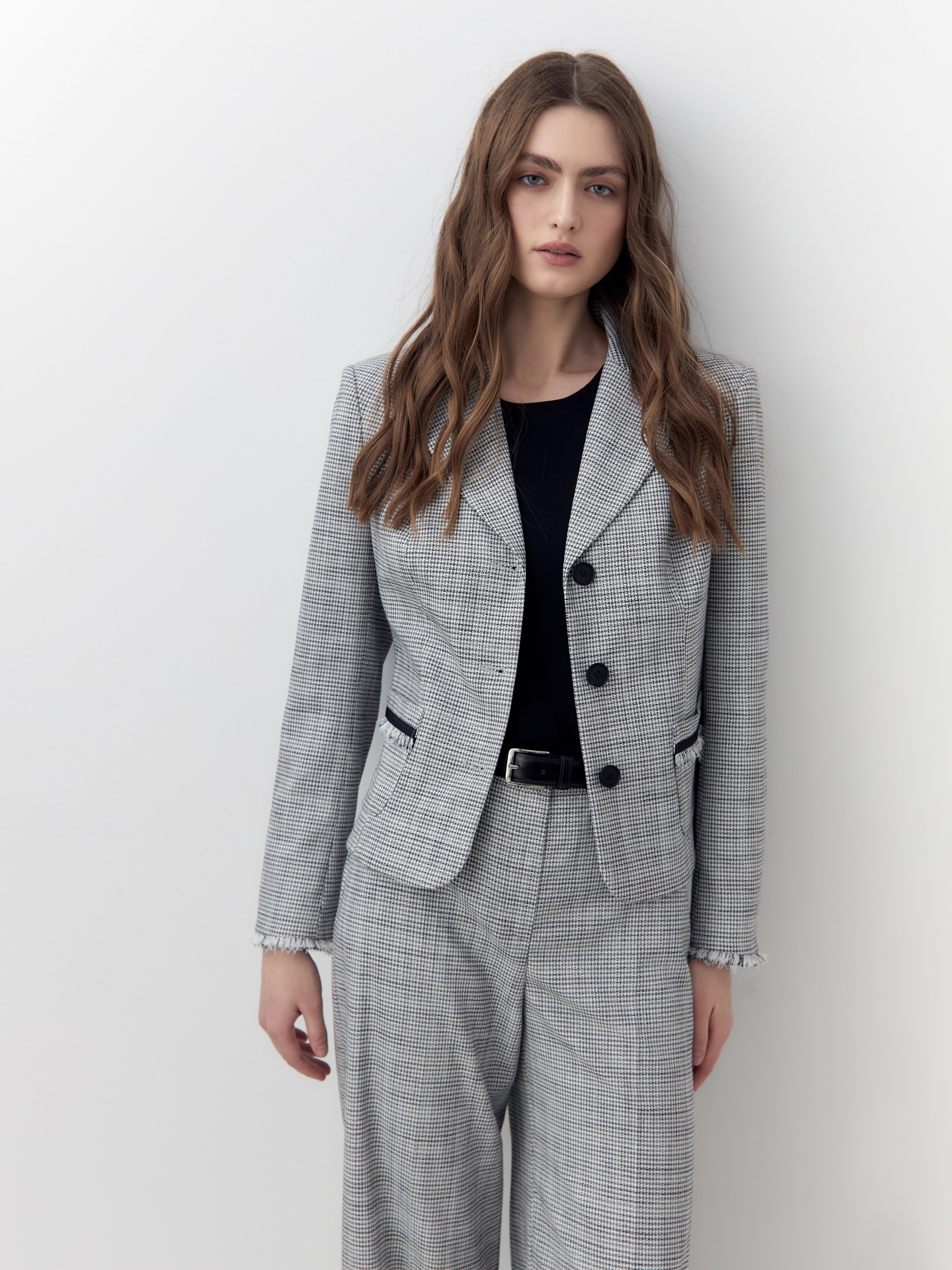 Укороченный прилегающий однобортный твидовый жакет черно-белого цвета имеет рельефы от плеча и 3 большие пуговицы по борту. Классический рукав 7/8 дополнен бахромой по низу. Передние карманы - накладные с декоративным элементам. Жакет будет идеальным выбором для офисного образа.