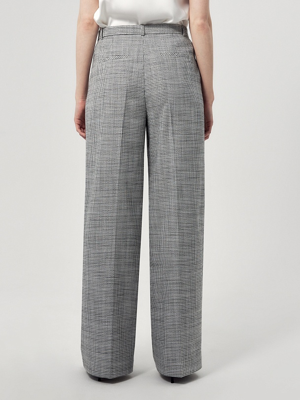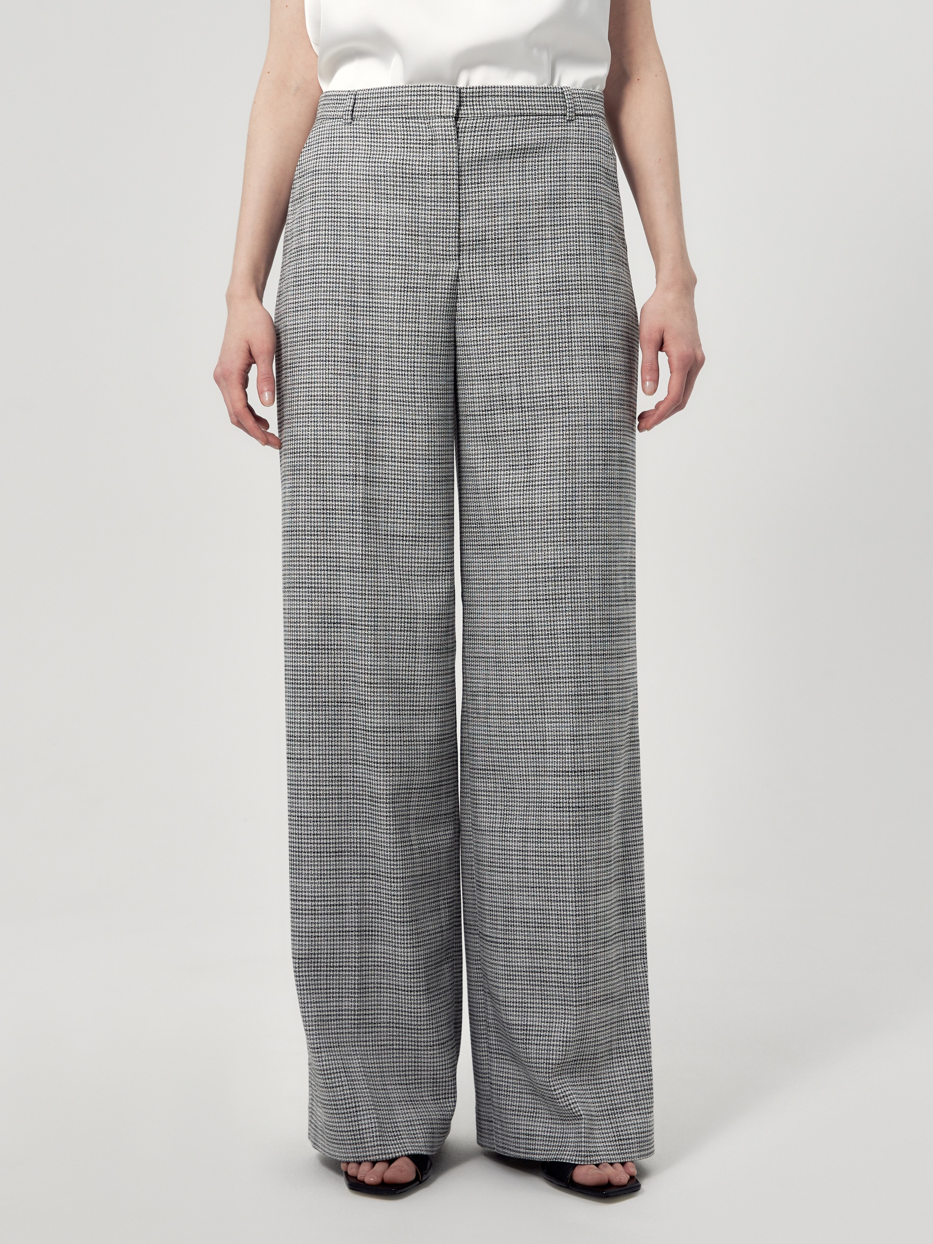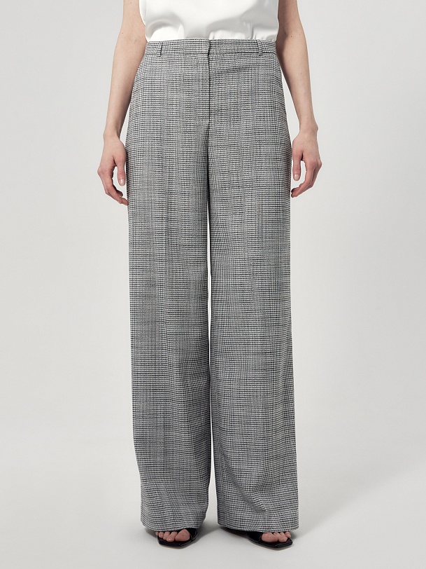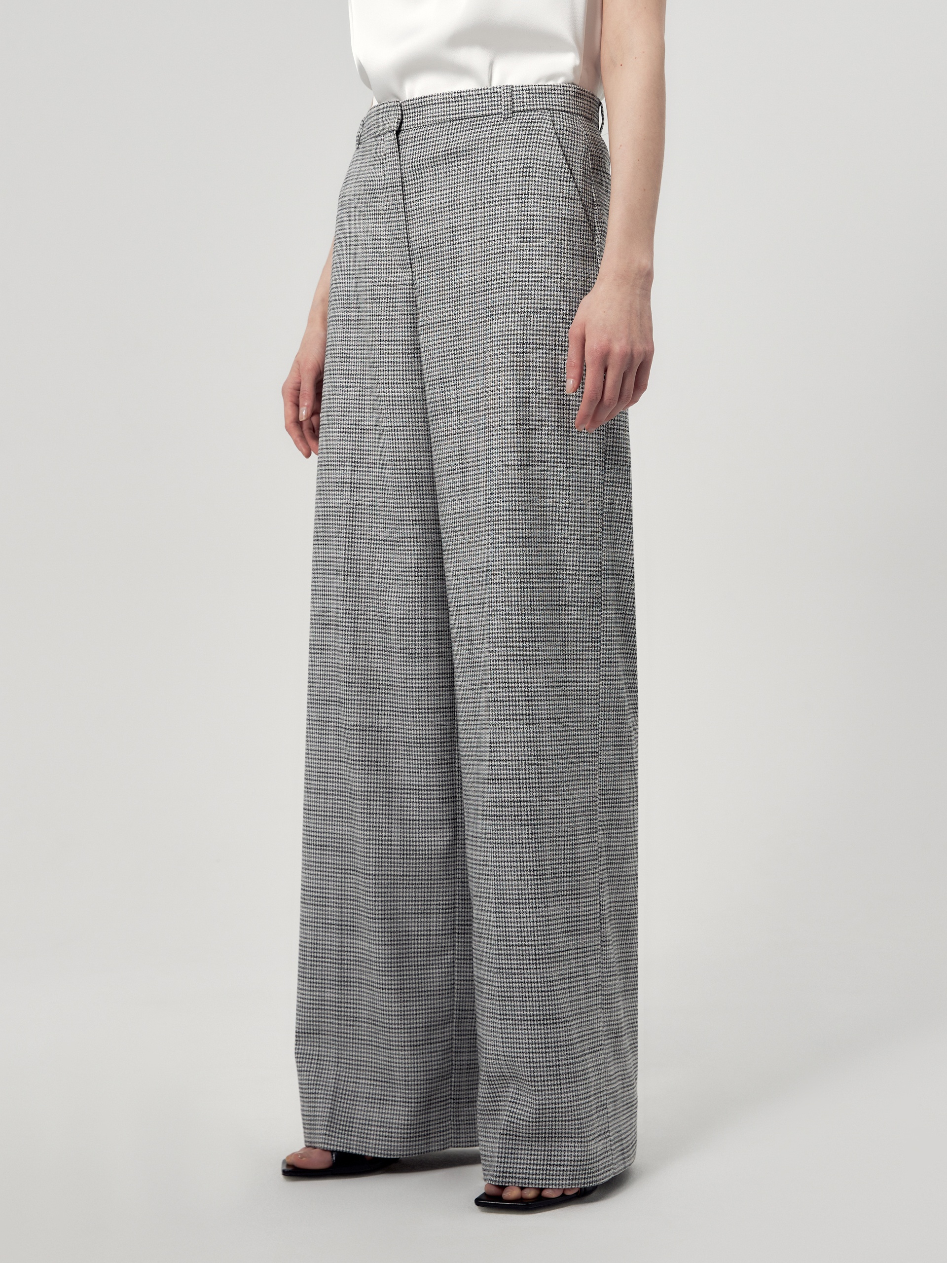 Прямые брюки свободного силуэта из твидовой костюмной ткани черно-белого цвета. Имеют два функциональных кармана по бокам и два прорезных кармана сзади. Брюки идеально сочетаются с жакетом из одной ткани.