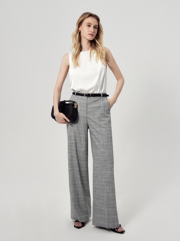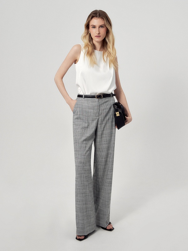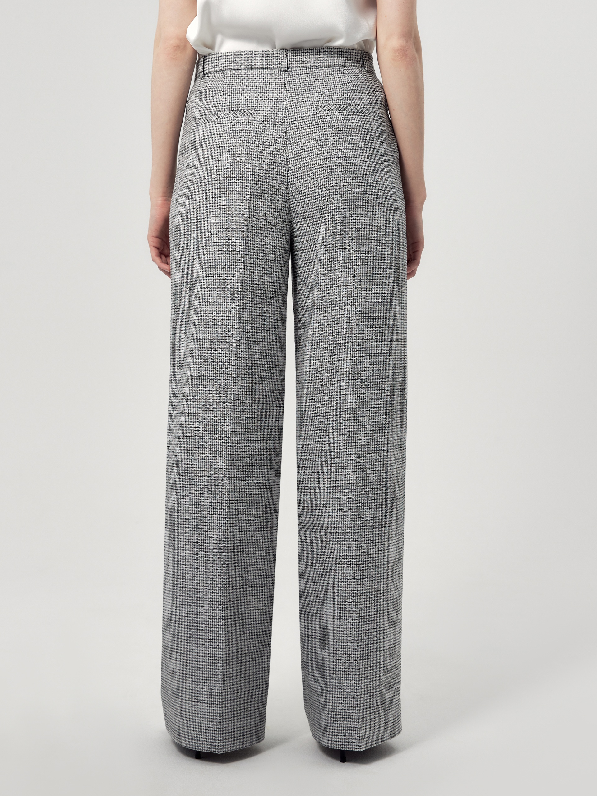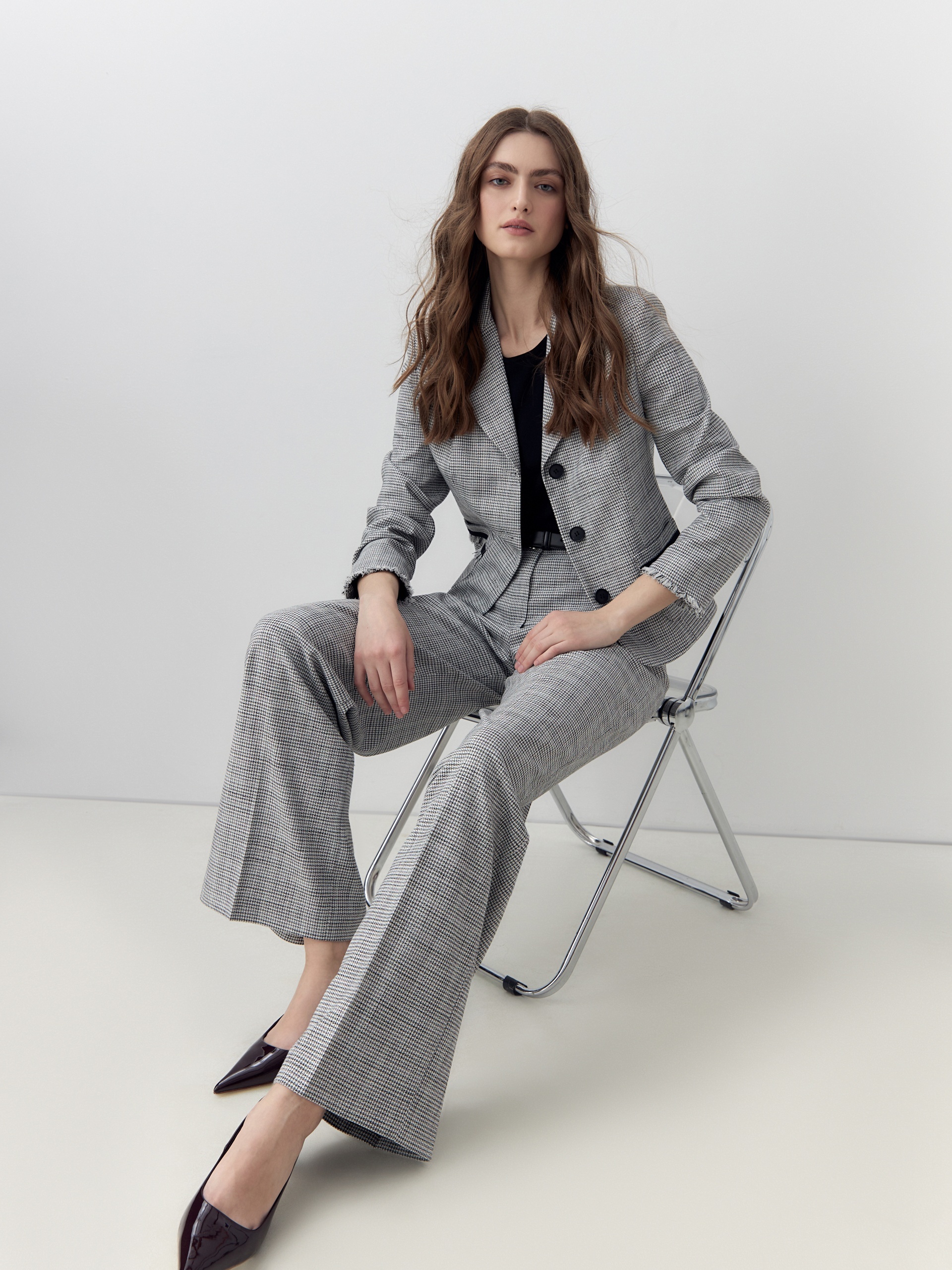 Прямые брюки свободного силуэта из твидовой костюмной ткани черно-белого цвета. Имеют два функциональных кармана по бокам и два прорезных кармана сзади. Брюки идеально сочетаются с жакетом из одной ткани.
