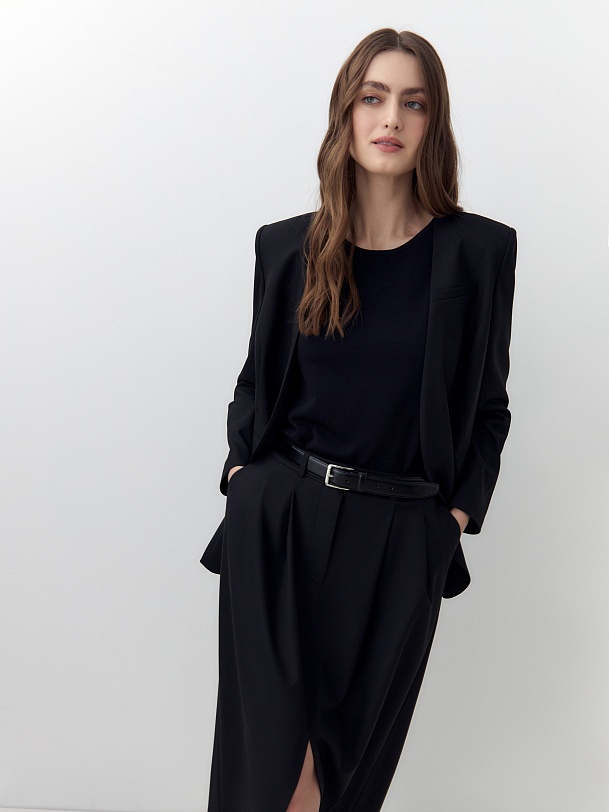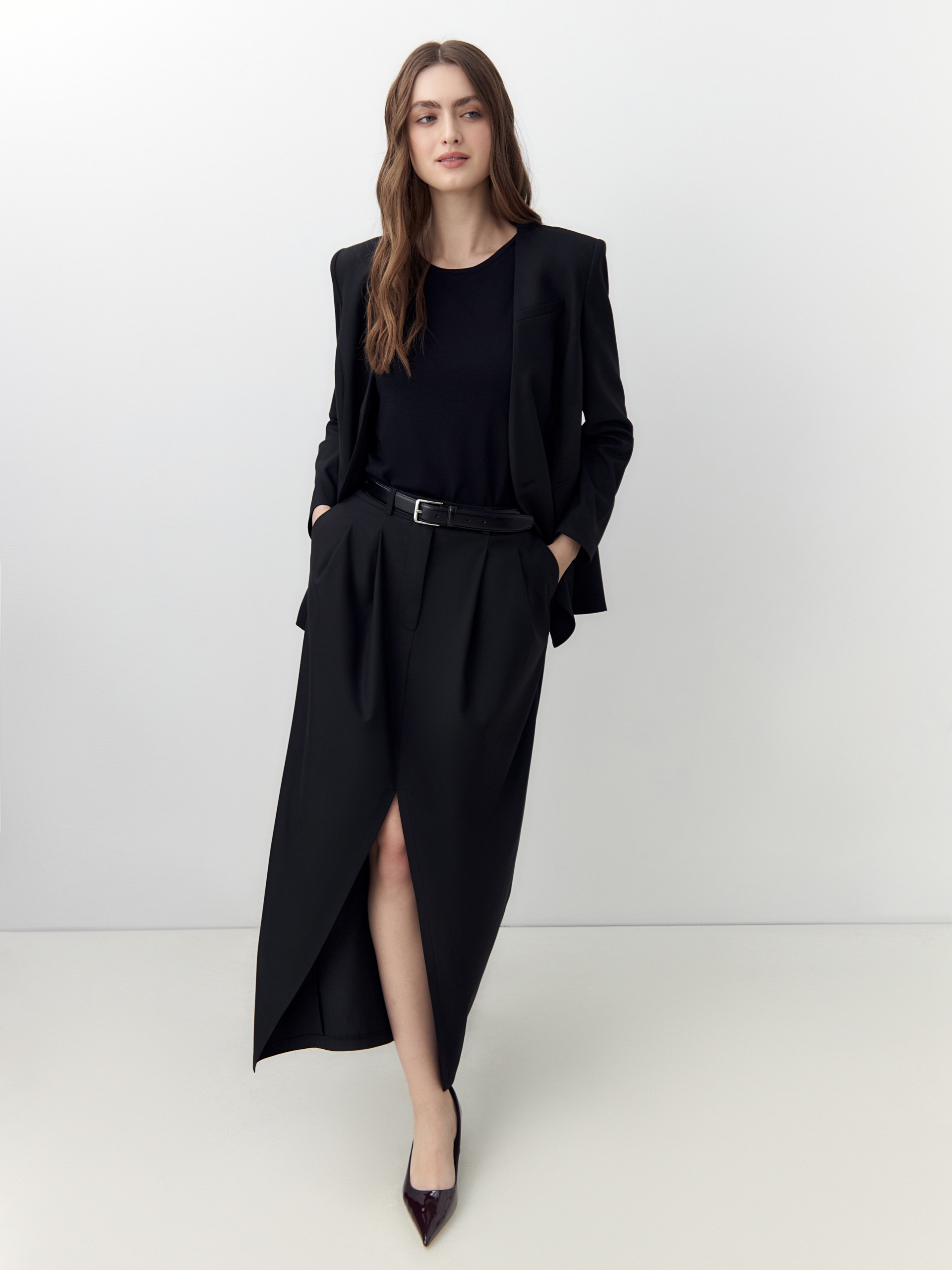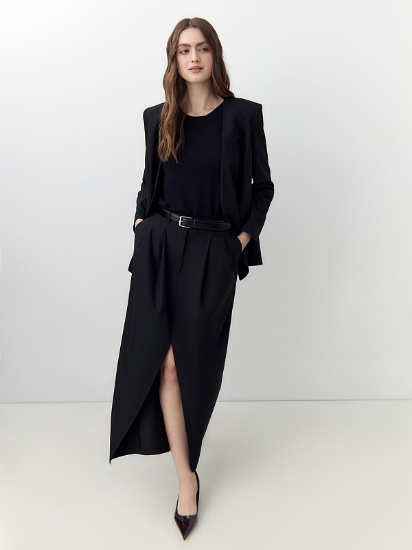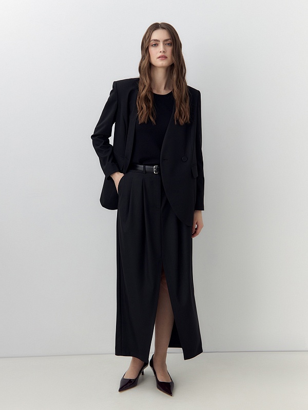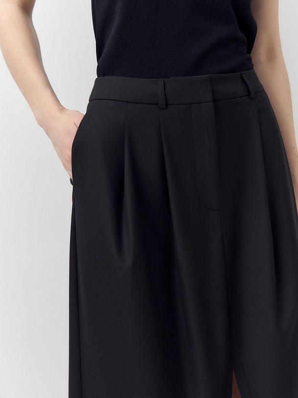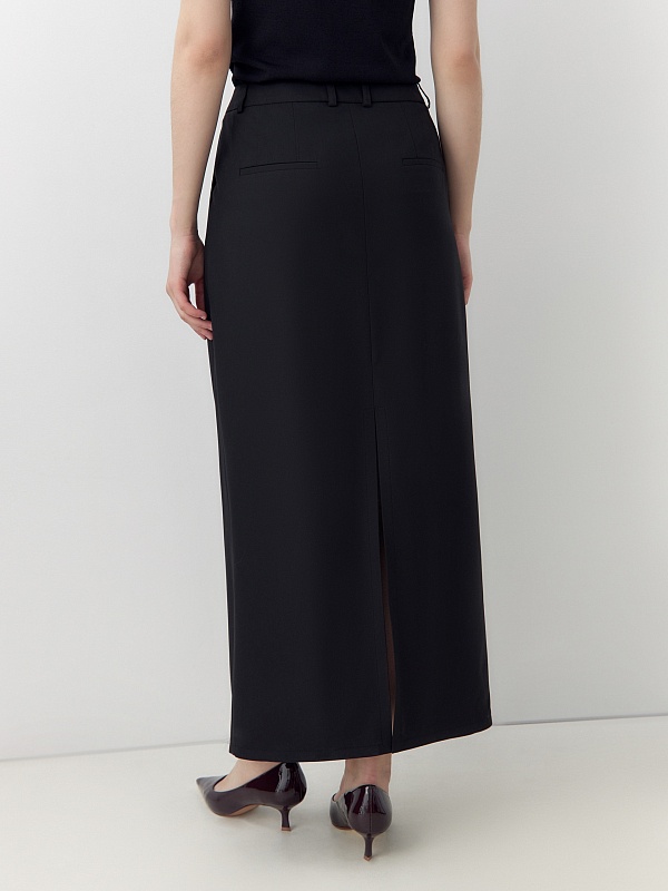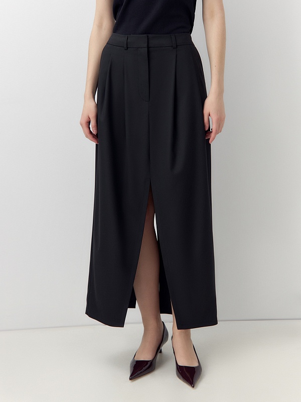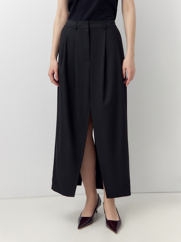 Юбка макси с подкройным поясам на талии, выполнена из костюмной ткани с вискозой в черном цвете. Юбка имеет высокий разрез по центру полочки и спинки. На талии складки, имеет два функциональных кармана на полочки и два прорезных кармана сзади. Юбка с застежкой по переду как на брюках с крючком и пуговицей на поясе есть шлевки. Такая юбка станет идеальным выбором для создания стильного и элегантного образа. Она подойдет как для деловых встреч, так и для вечерних мероприятий.