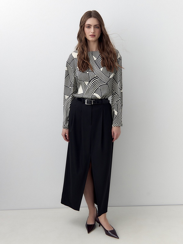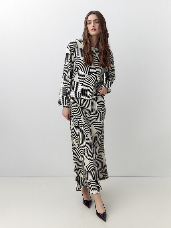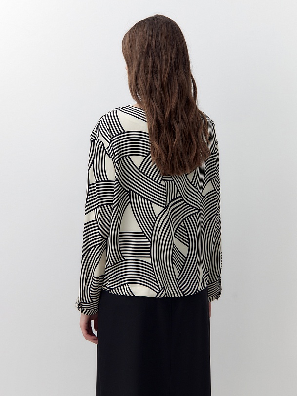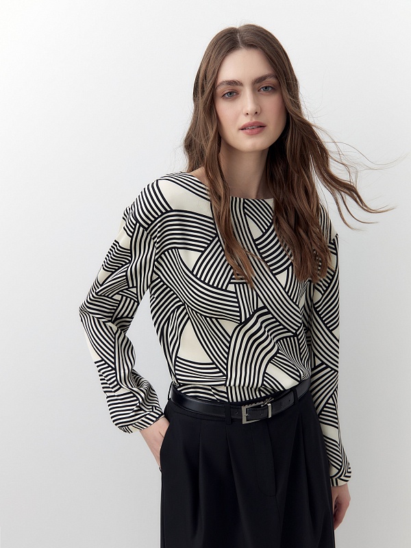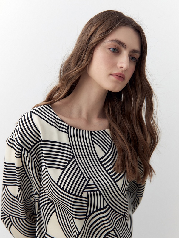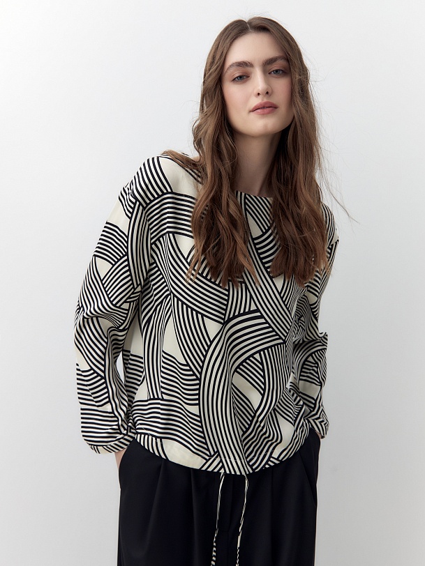 Свободная блуза со спущенной линией плеча и горловиной лодочкой. Блуза выполнена из плательной атласной ткани с графическим черно-белом принтом. Рукав прямой, по низу узкий манжет на одной пуговице. Низ блузы на кулисе, есть завязки из основной ткани со внутренней стороны.