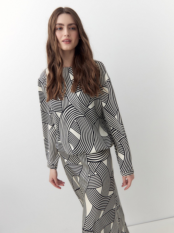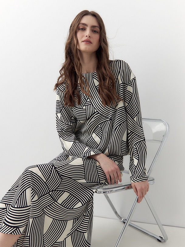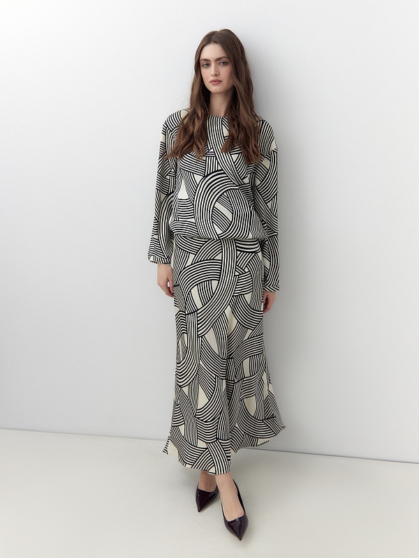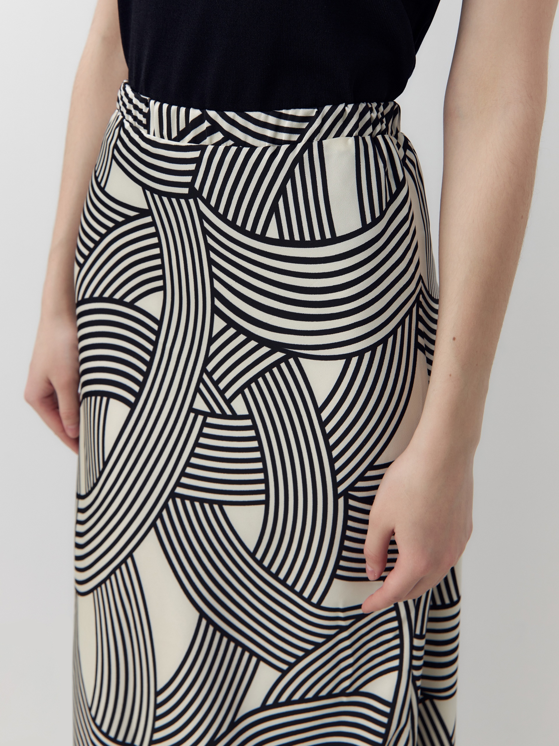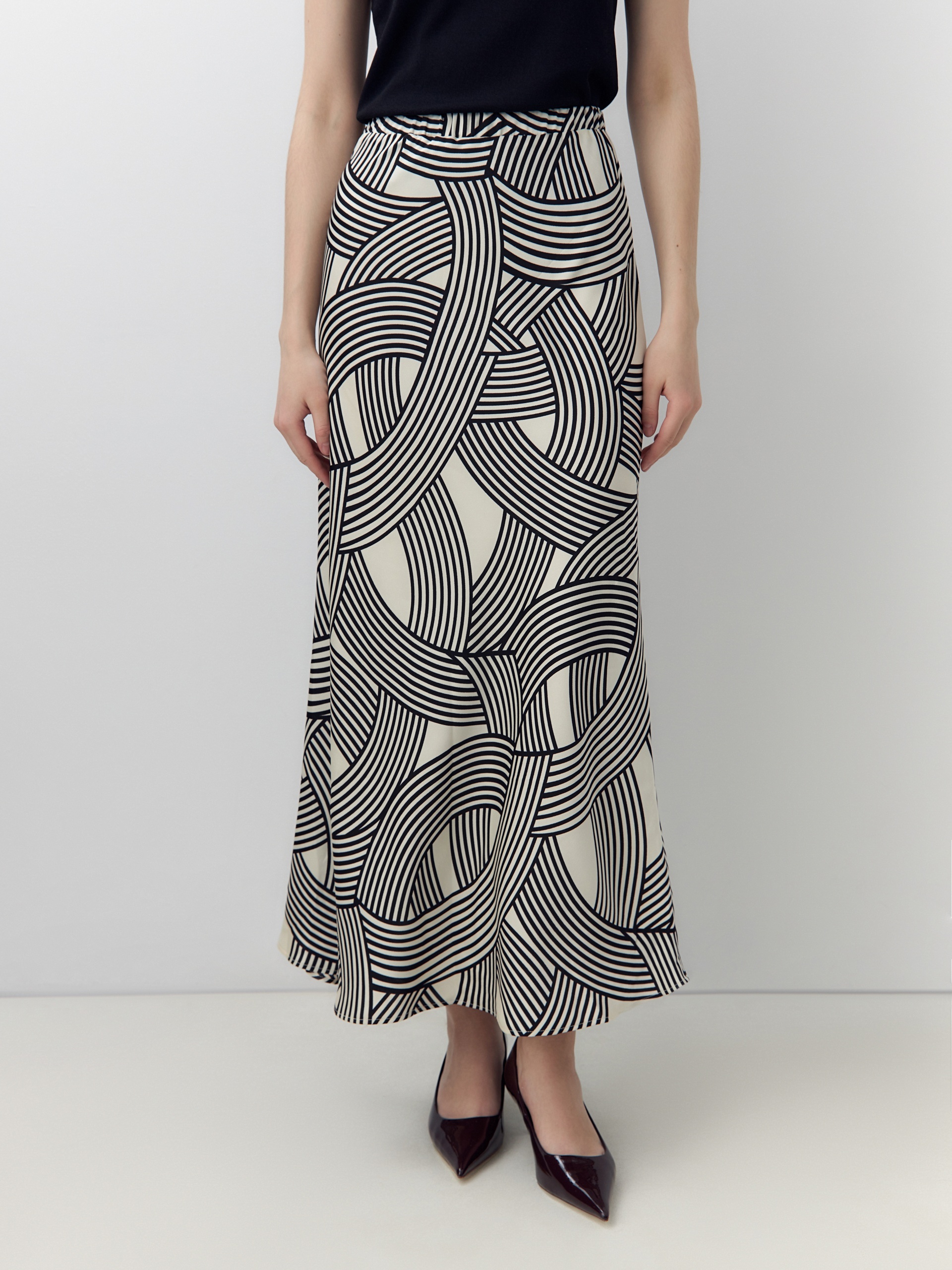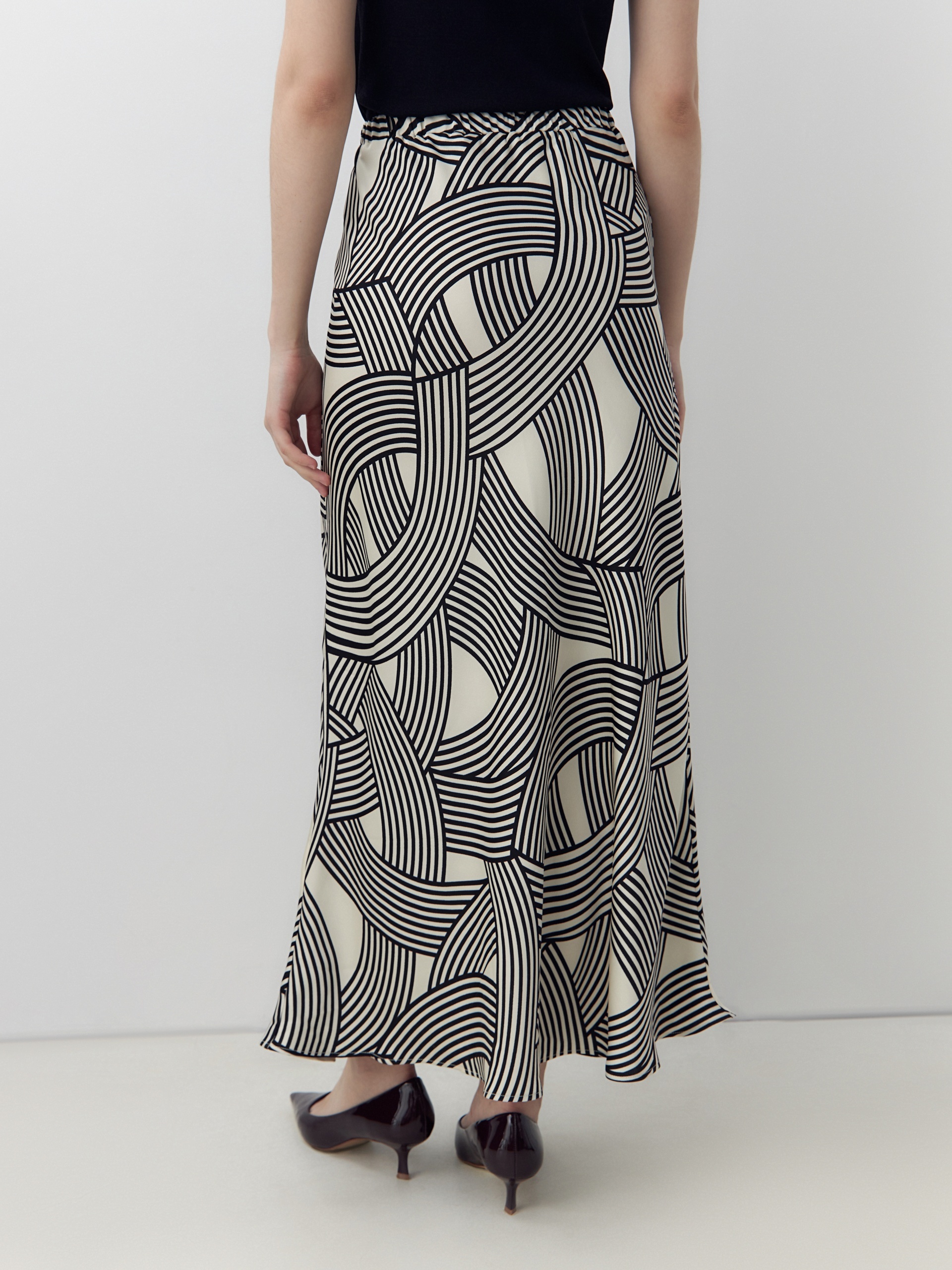 Юбка макси из плательной атласной ткани с графическим черно-белом принтом. С поясом на резинке, юбка скроена по косой.