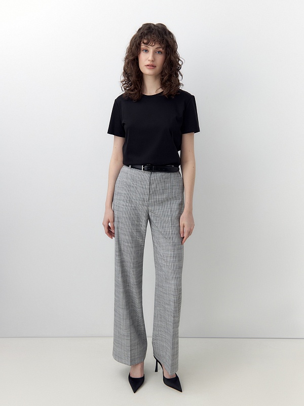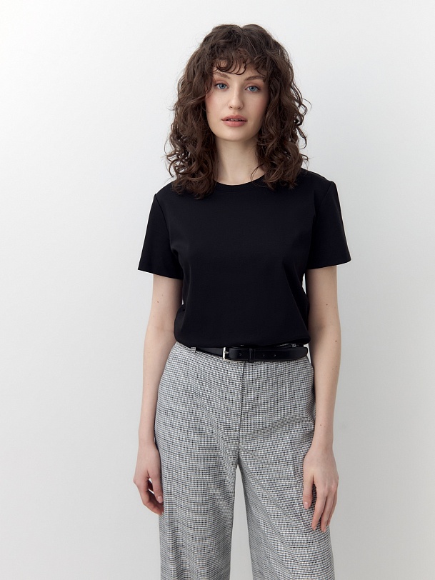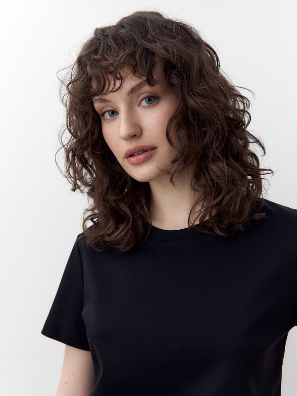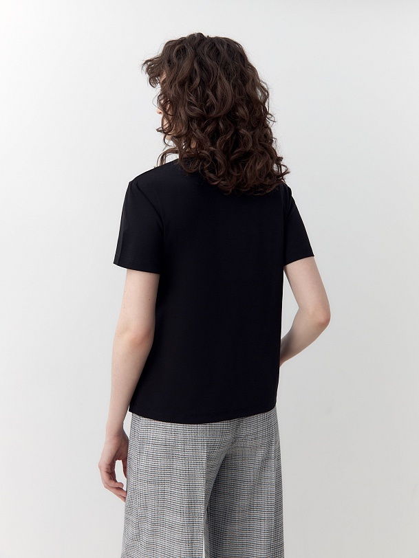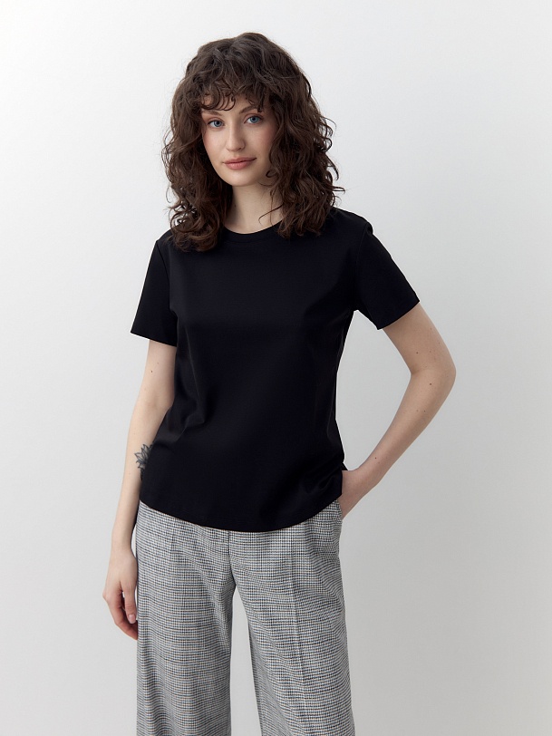 Футболка прямого силуэта классического черного цвета будет прекрасно сочетаться как с денимными изделиями, так и с классическими ансамблями. Мерсеризированный хлопок имеет шелковистый блеск и не деформируется после стирок, практически не мнется и не выцветает со временем.