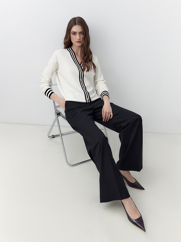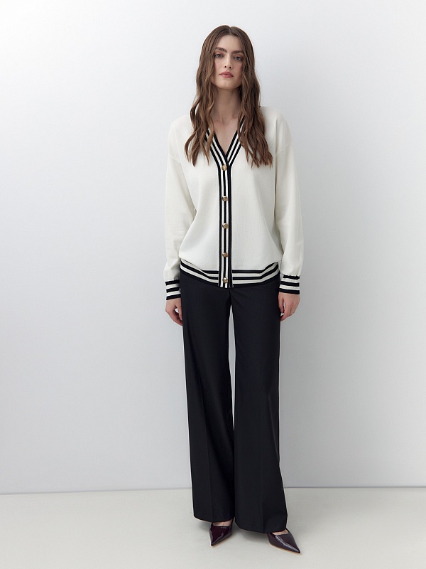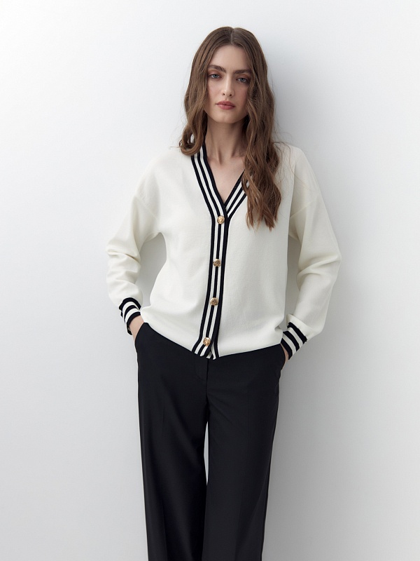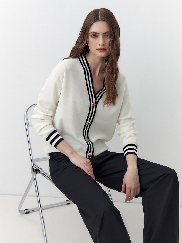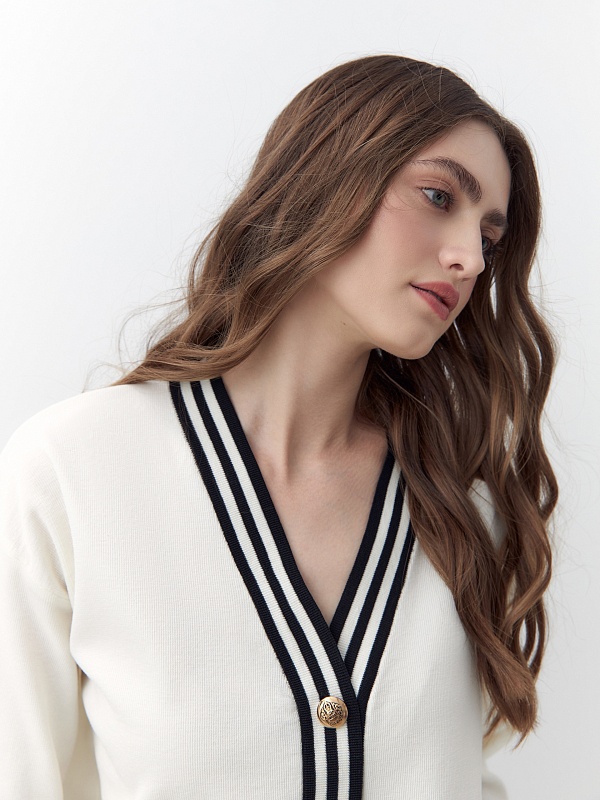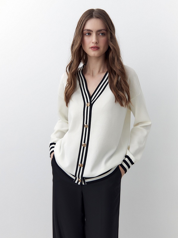 Уютный базовый кардиган из высококачественной вискозной пряжи с добавлением шелка, рукава полной длины. Кардиган имеет V-образный вырез и полоски на манжетах и борту. С пуговицами по борту. Станет отличной заменой жакета для офиса и повседневной жизни.