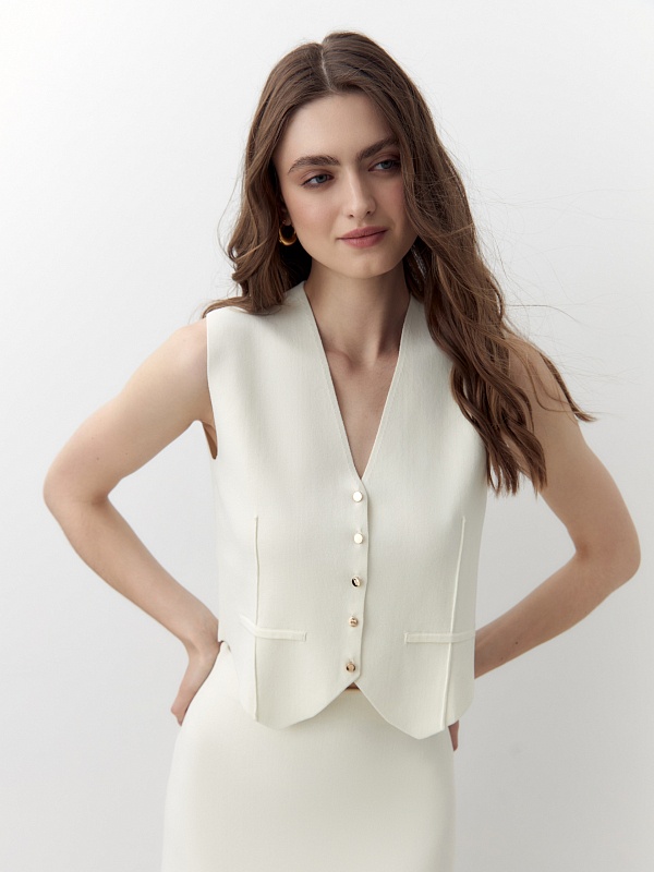 Вязаный жилет из смесовой вискозной пряжи с имитациями листочек по переду. Жилет приятного молочного цвета, станет отличным дополнением к базовому гардеробу.