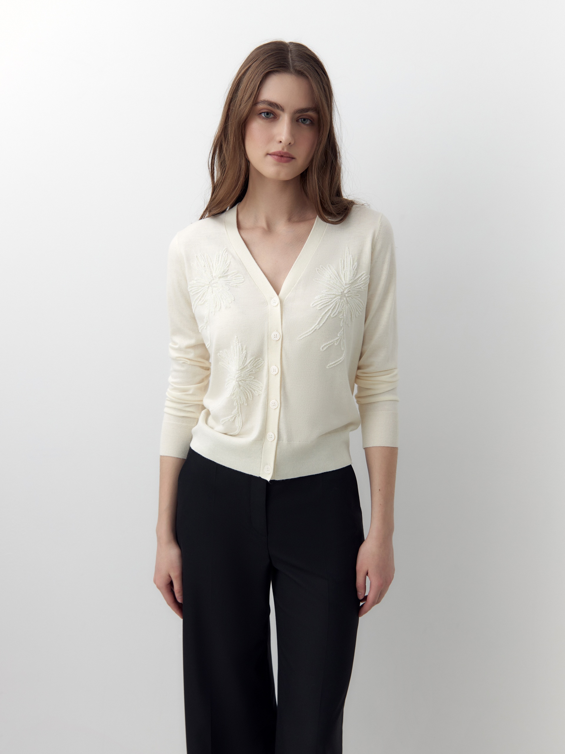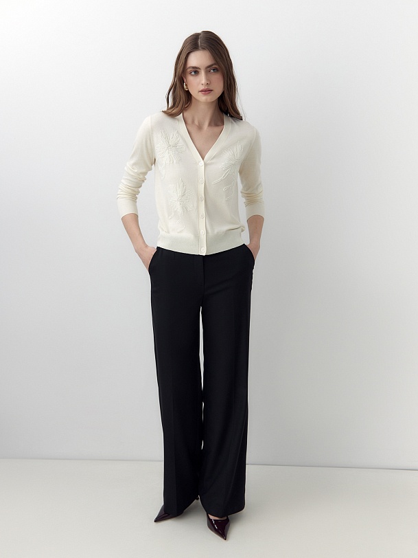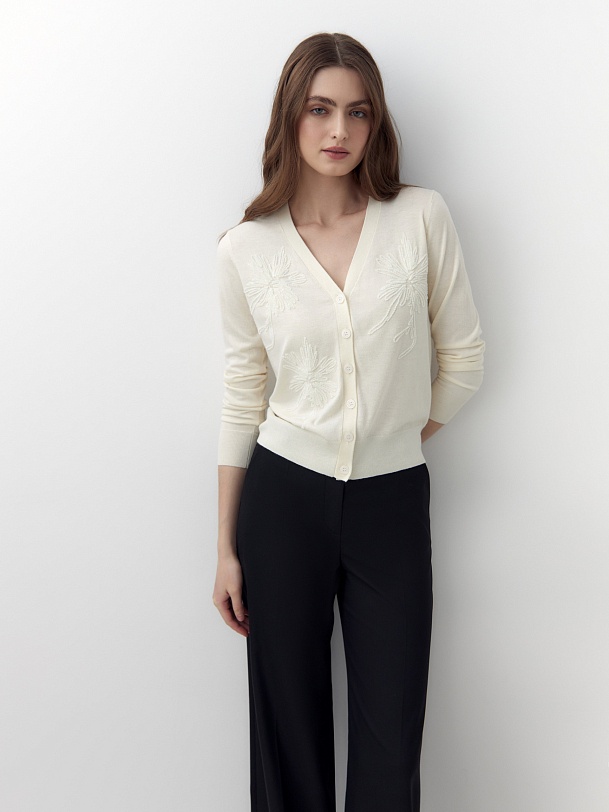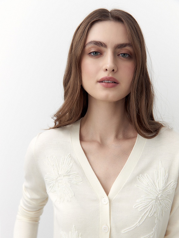 Мягкий и уютный кардиган из вискозной пряжи с V-образным вырезом на пуговицах. На полочке цветочная вышивка пайетками в тон основной пряжи. Придаст вашему образу мягкости и романтичности.