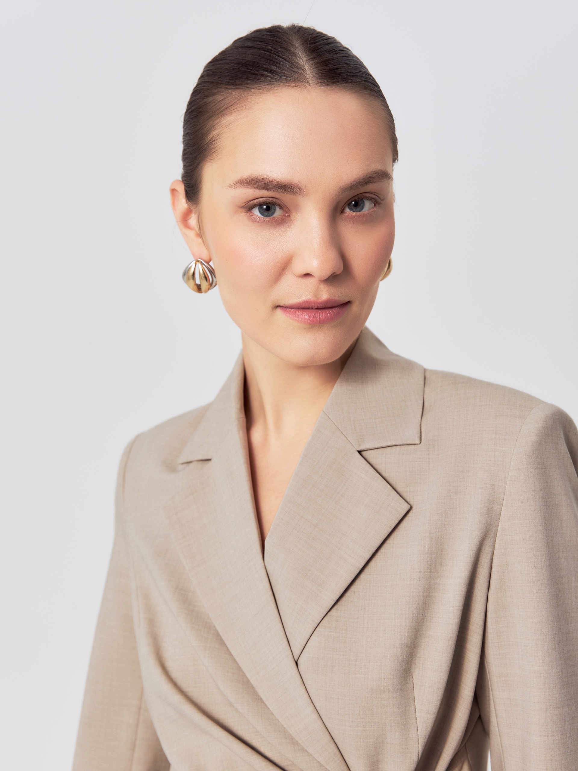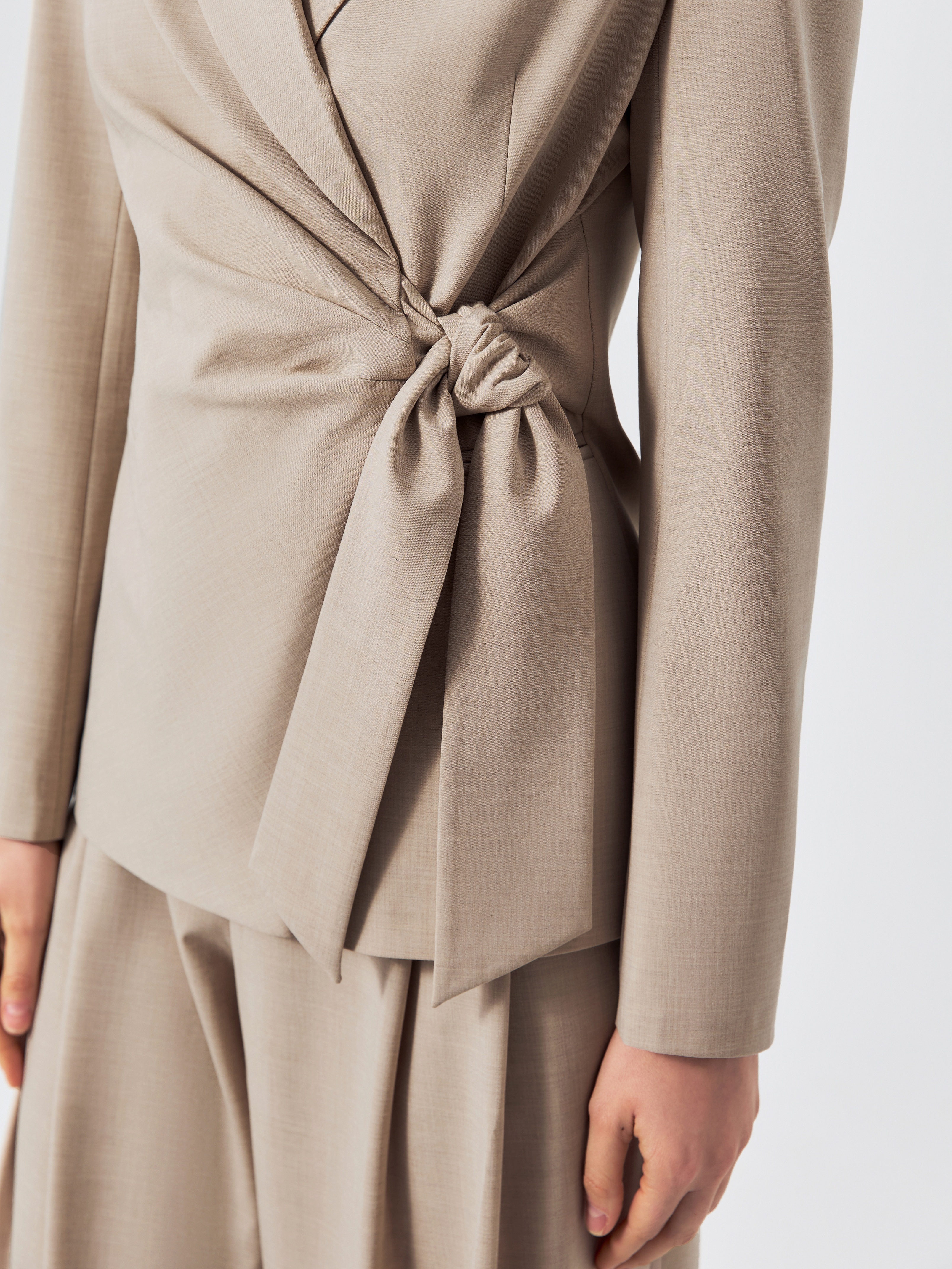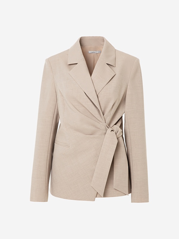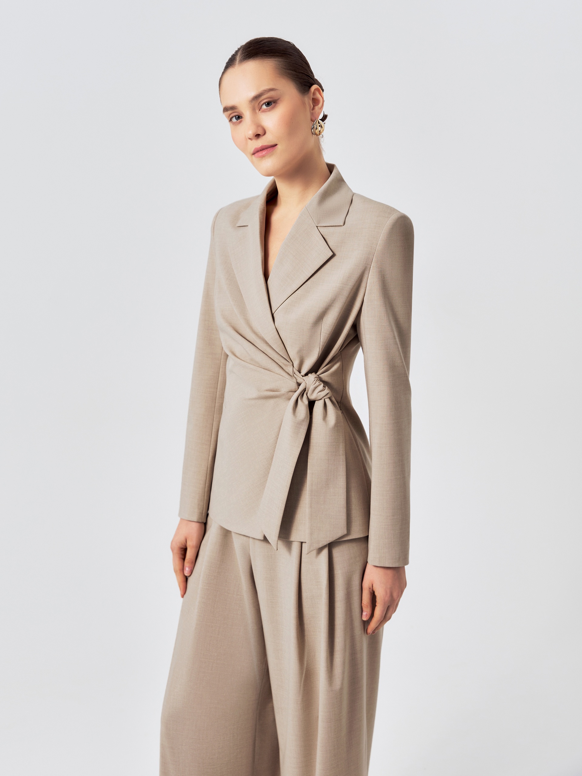 Приталенный жакет с классическим английским воротником из костюмной ткани в светло-песочном цвете. Есть прорезные карманы листочки на полочке. Жакет завязывается на талии, подчеркивая женственность фигуры и создавая индивидуальный образ. В комплекте с брюками или юбкой составит идеальный комплект.