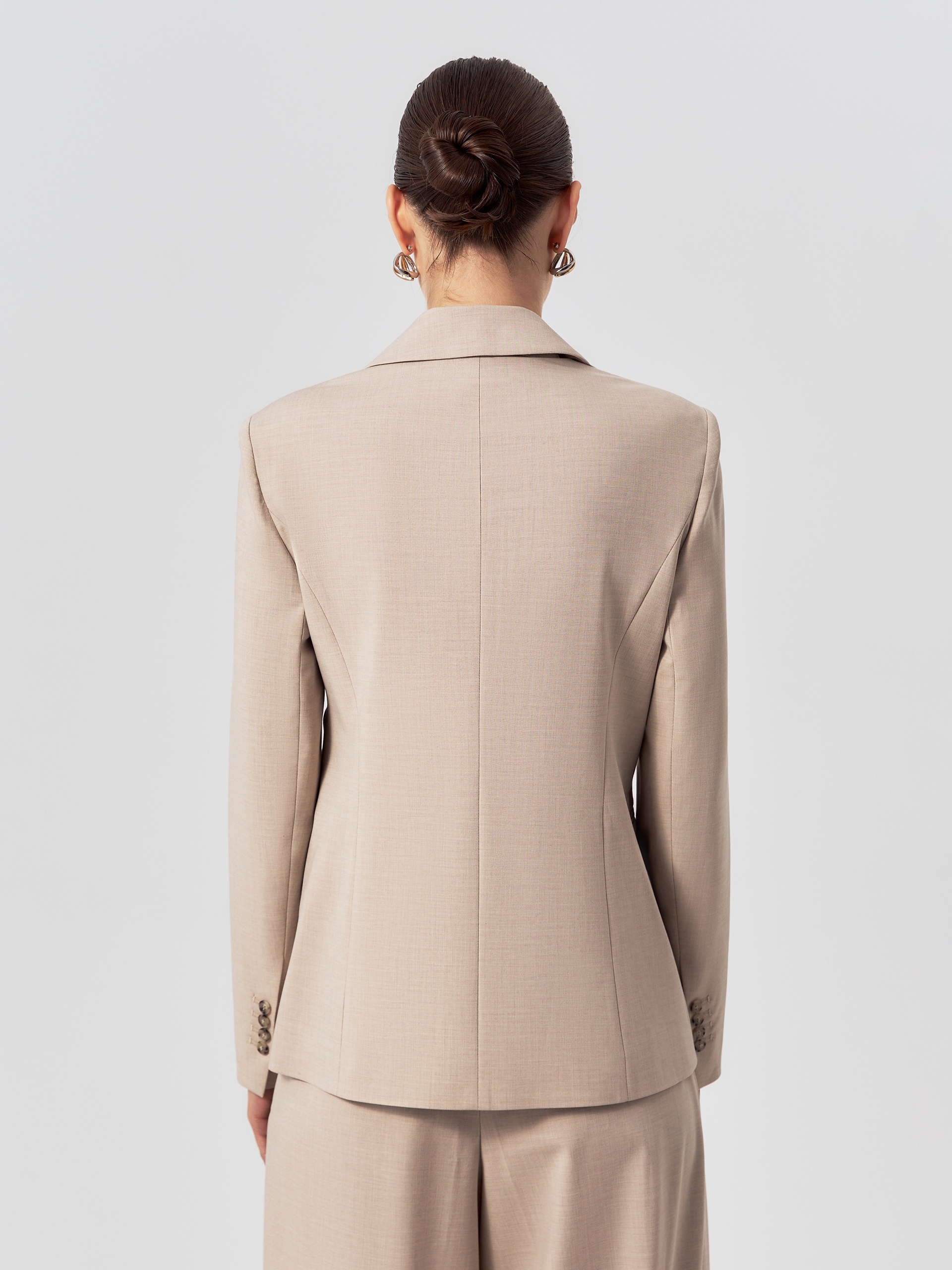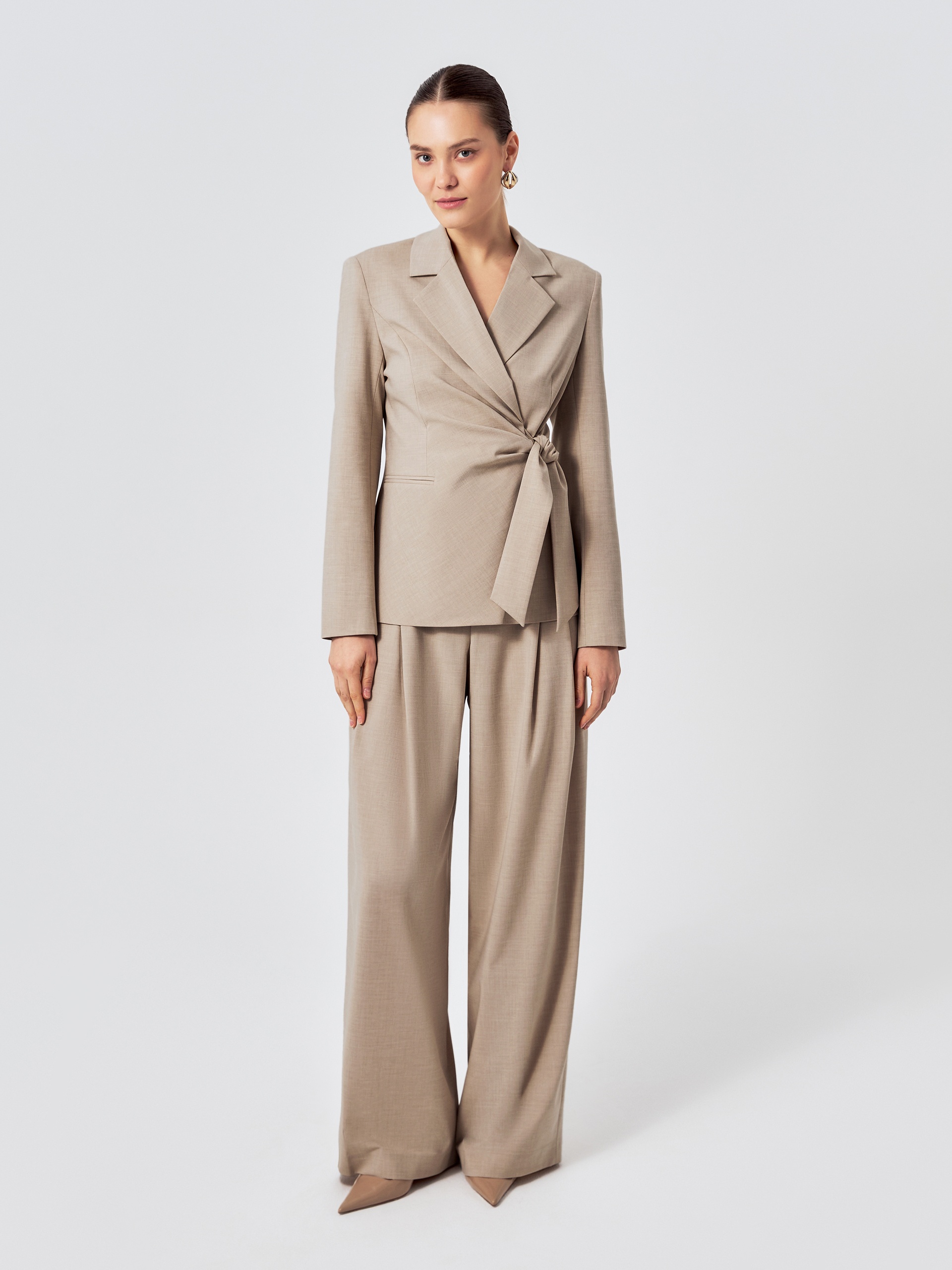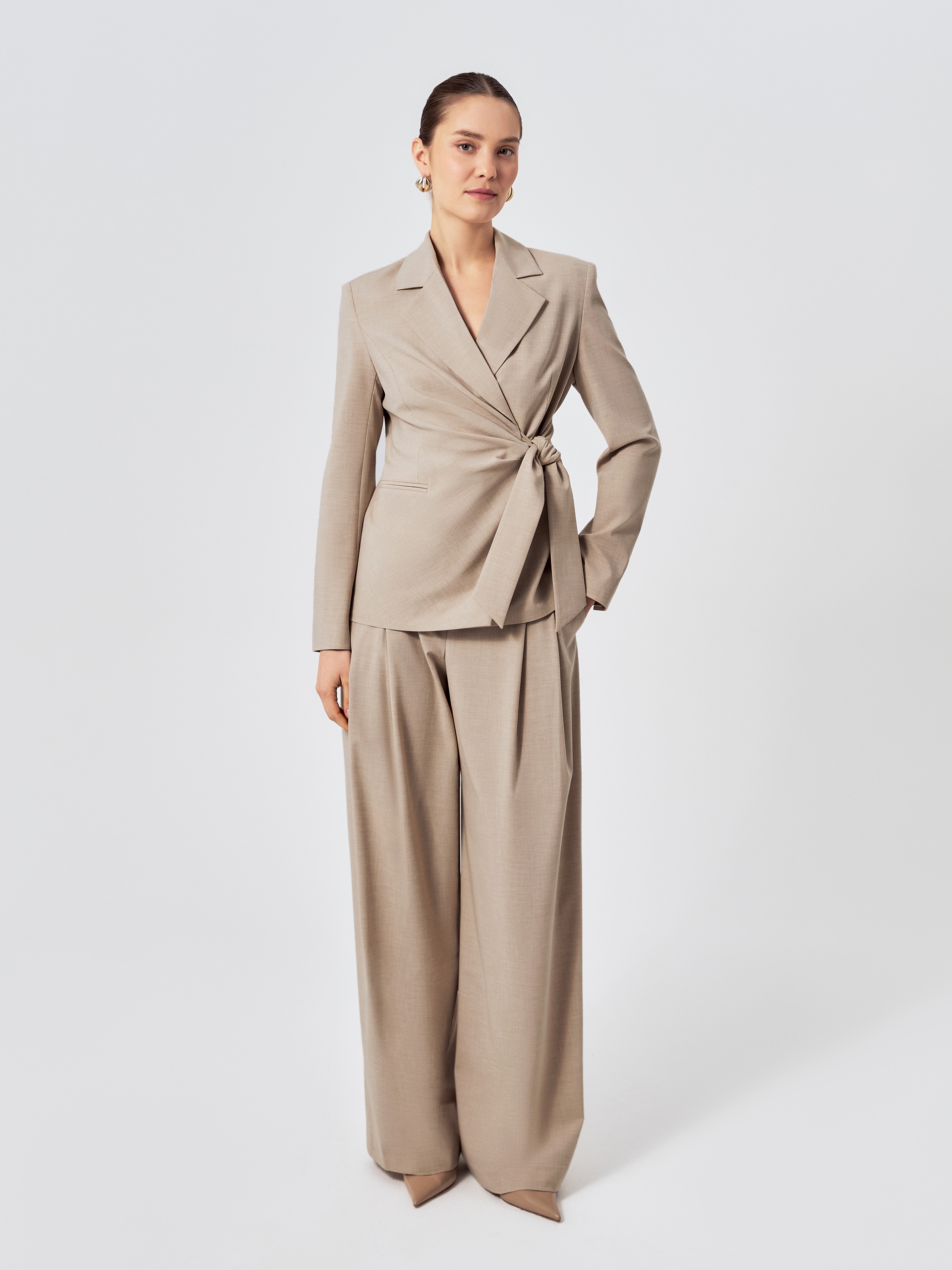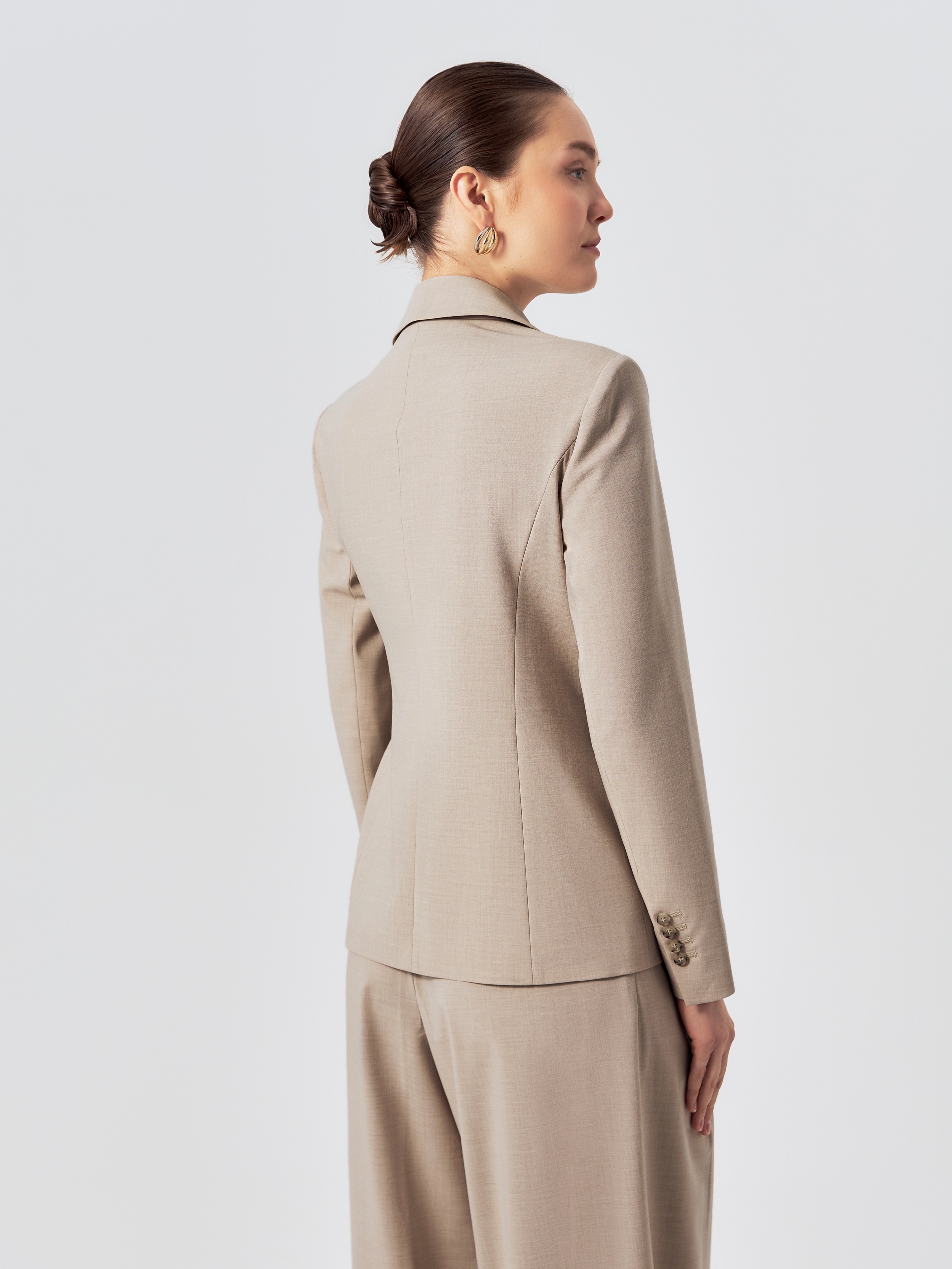 Приталенный жакет с классическим английским воротником из костюмной ткани в светло-песочном цвете. Есть прорезные карманы листочки на полочке. Жакет завязывается на талии, подчеркивая женственность фигуры и создавая индивидуальный образ. В комплекте с брюками или юбкой составит идеальный комплект.