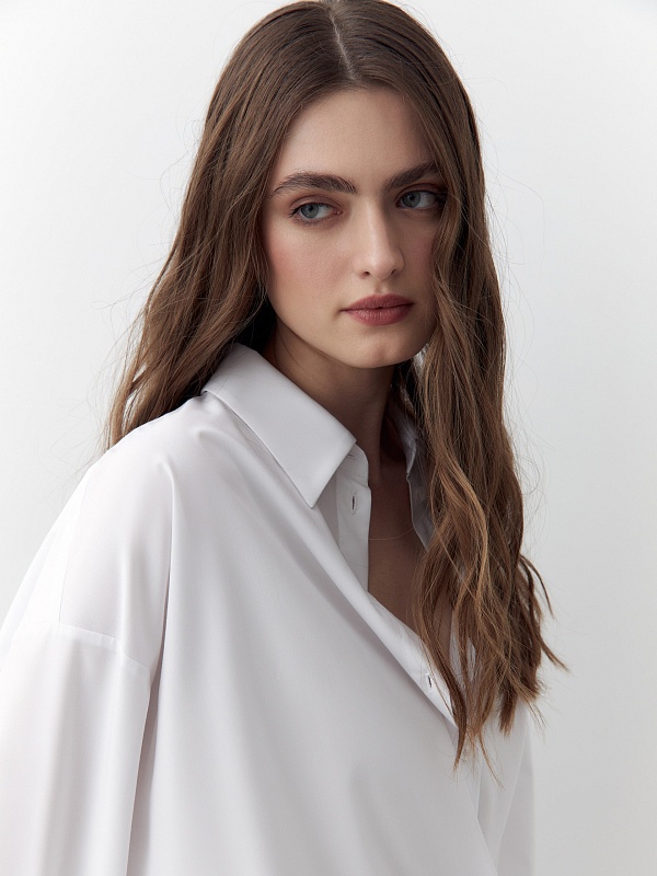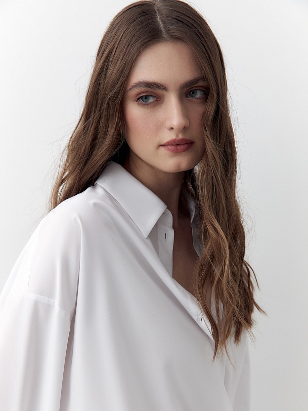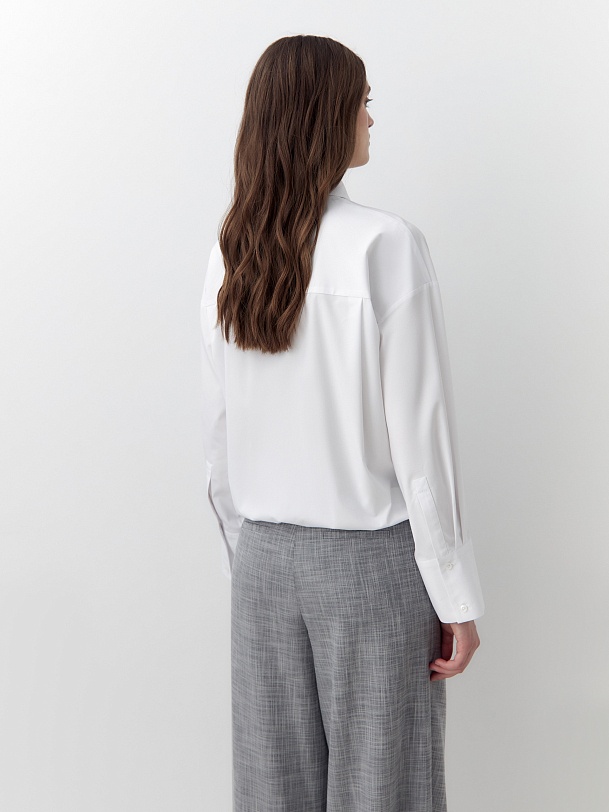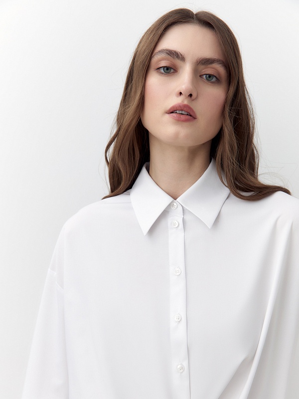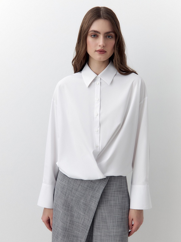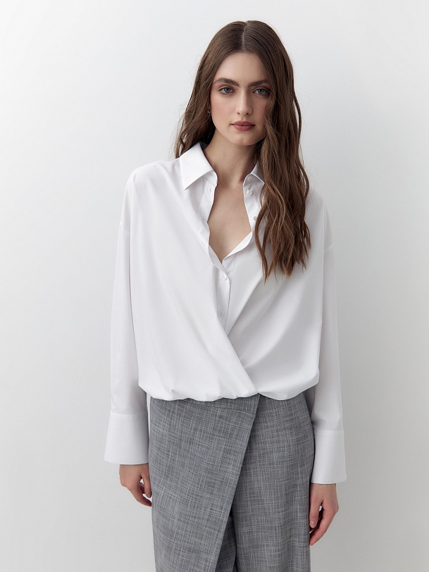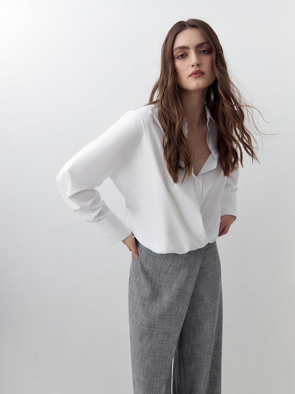 Свободная блуза с имитацией запаха, по низу на резинке из блузочной ткани с классическим отложным воротником и цельной планкой по переду. Рукав со спущенной линией плеча и высоким манжетом.